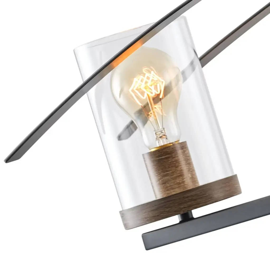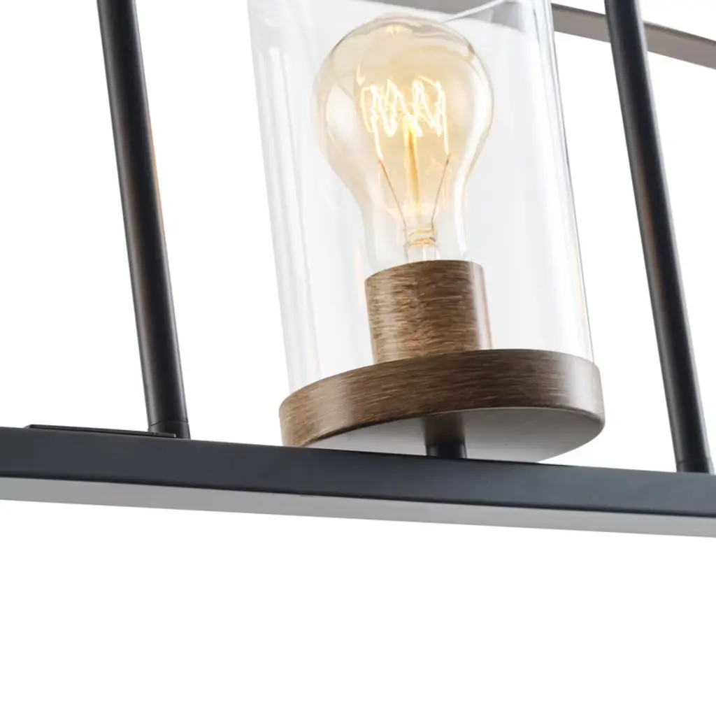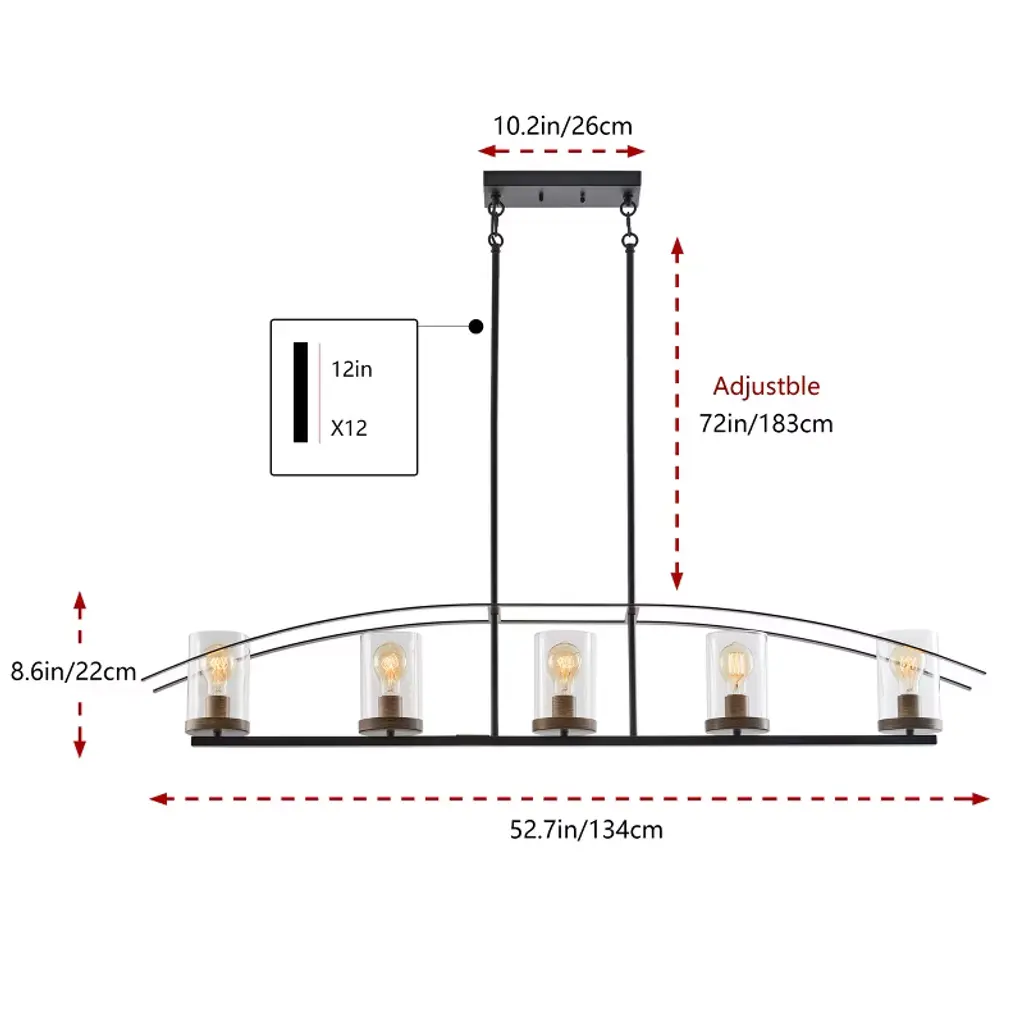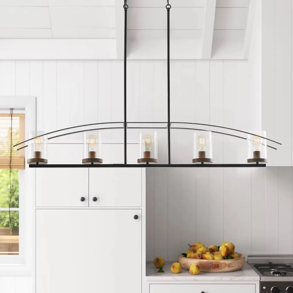 Elevate your kitchen or dining space with this 5-light linear island chandelier, featuring a matte black iron frame, rich wood-tone accents, and clear glass cylinder shades. Compatible with E26 base bulbs (max 60W each, not included), this ETL-certified fixture operates on 120V and is safely wired with durable 105¡ã SPT-1 and 18# 1332 black/white cords. A perfect blend of farmhouse warmth and industrial style for modern interiors.