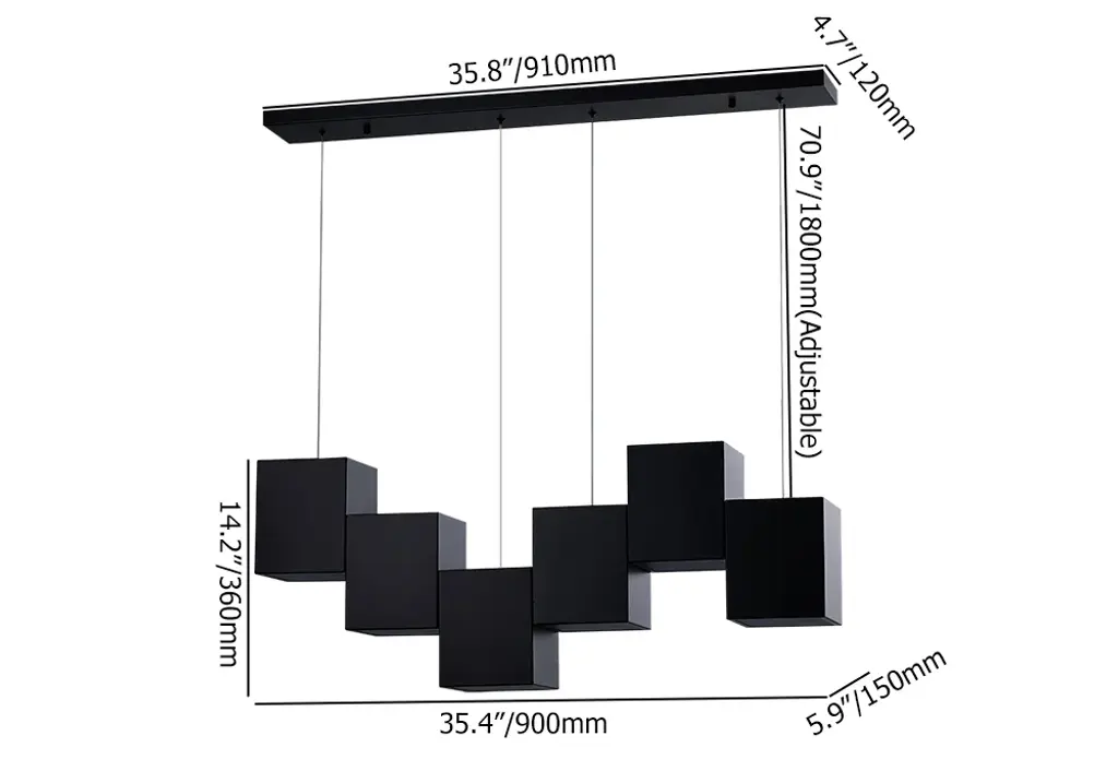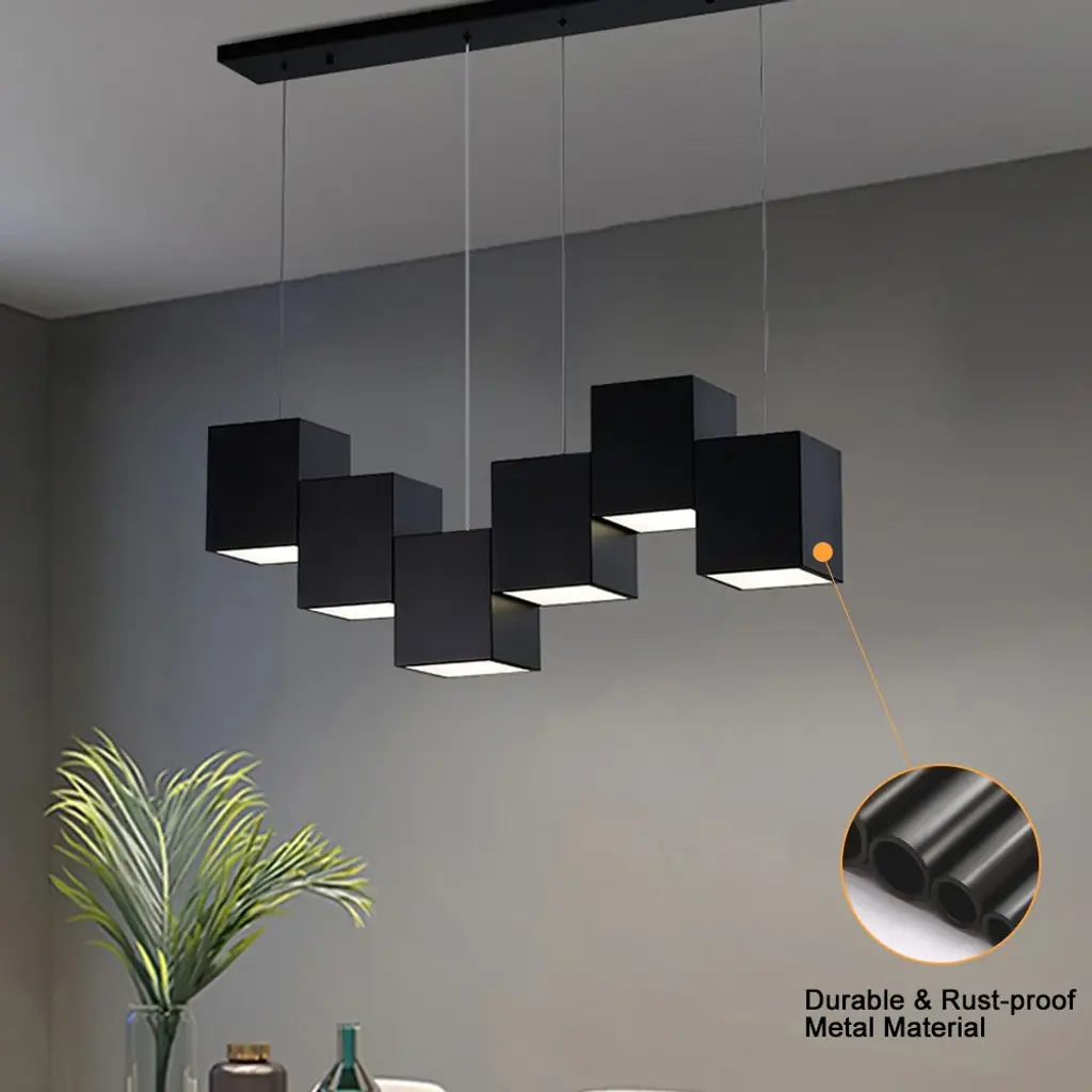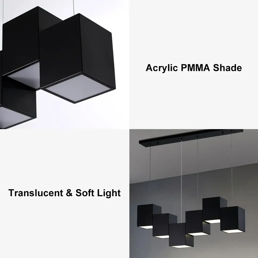 Crafted with quality, made by metal and acrylic, this linear kitchen island light features a rectangular base and six black square-shaped shades. Each of the six fixtures accommodates a 60W bulb (not included). The 71" wire is adjustable, and the fixture can be hung at a customized height. Believing, this 6-light pendant will bring brilliant style to your kitchen or dining room.