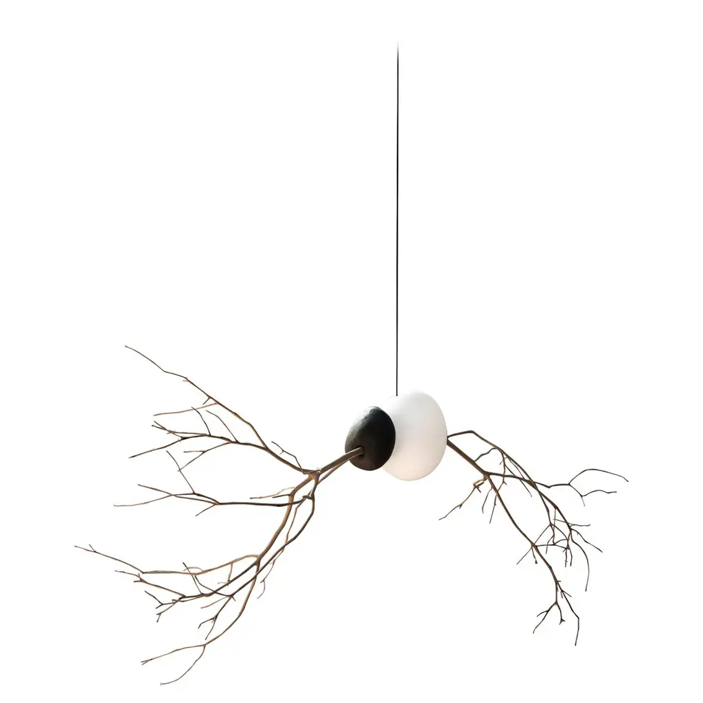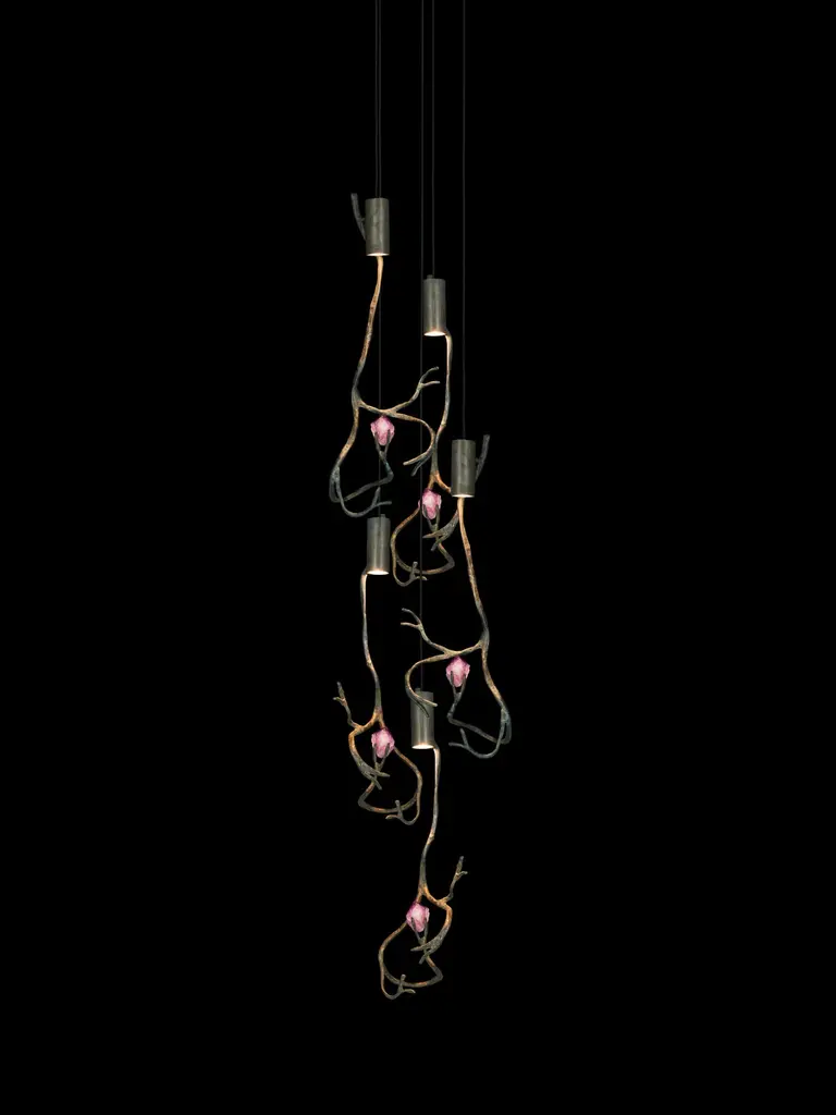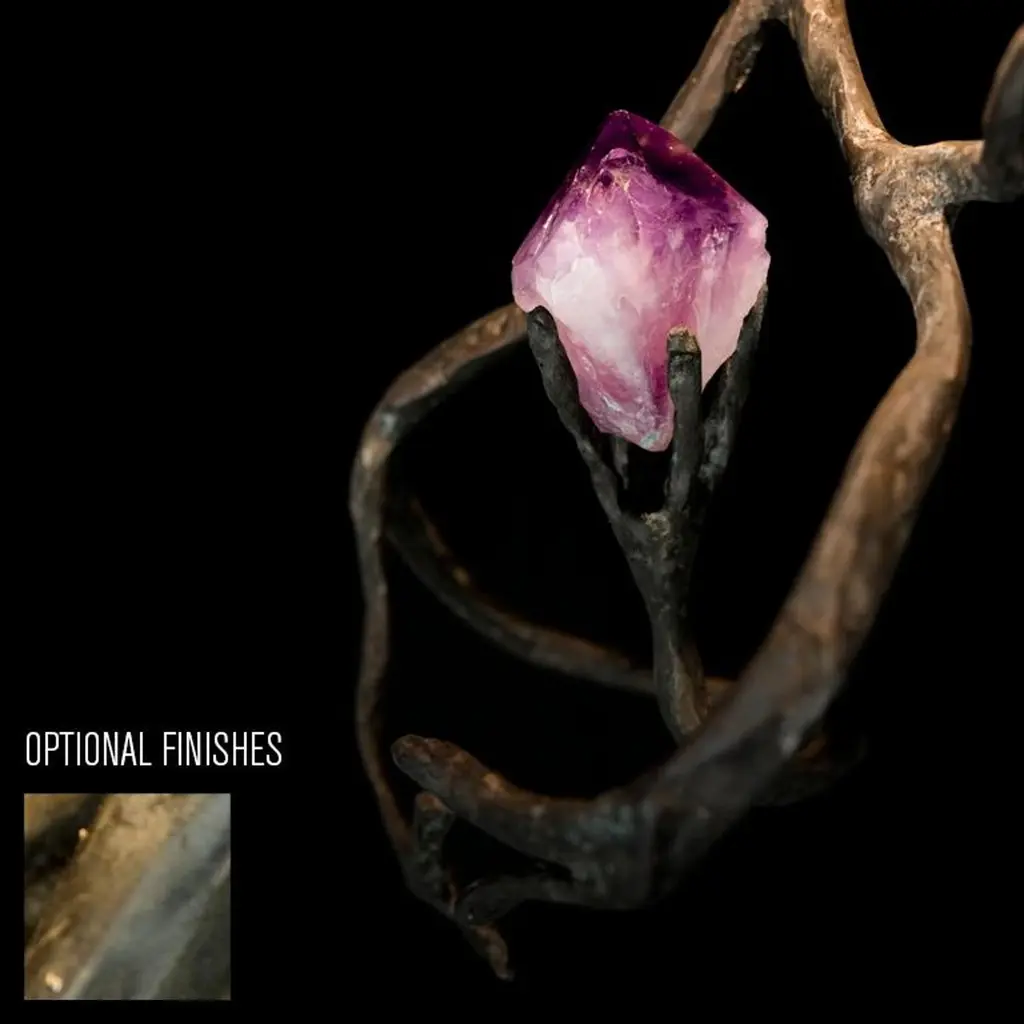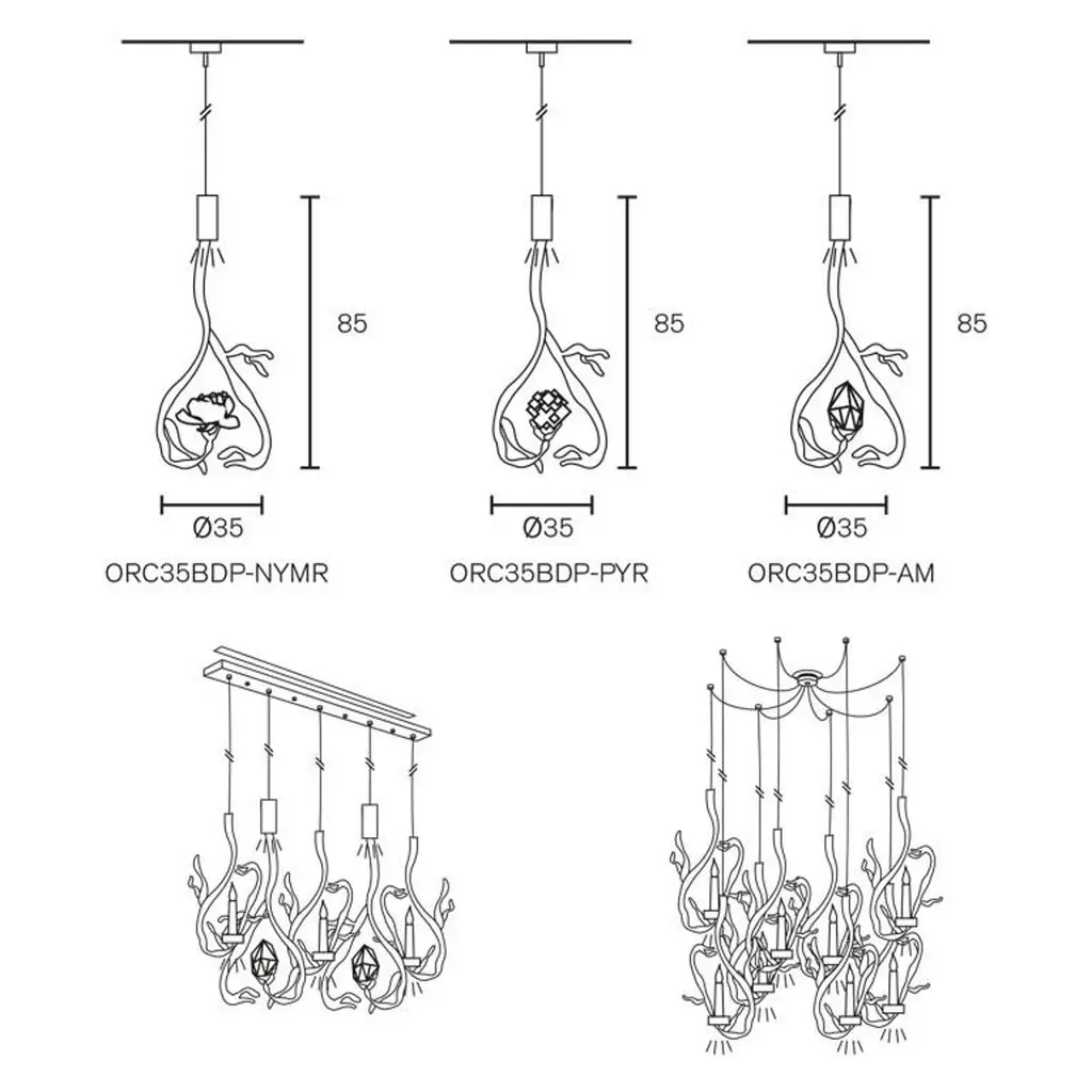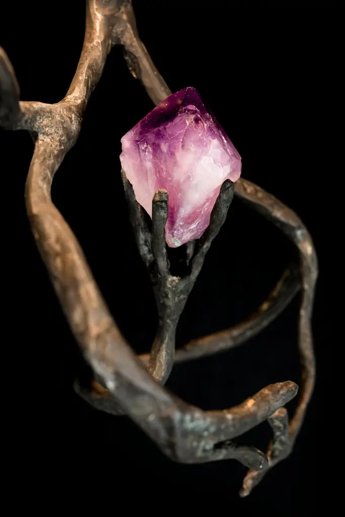 One of the most legendary poets and singers in Greek mythology is Orpheus. He sang so beautifully that he touched everyone and all around him. The King and Queen were moved to tears, but also the birds, trees, and even the stones were hypnotized by his magical voice. We have found several objects of desire amidst the nymphs and trees and formed them into lighting sculptures.The Orpheus pendant holds in her hand the precious stone Amethyst. This precious stone, embraced through the millennia by ancient Greeks, Russian Tsars, and English Bishops, is seen as a protector against dark magic, and a symbol for those in love.Our diverse and magnificent planet offers a wealth of treasures in the form of precious stones, which can be presented by Orpheus. Each with their unique story and power, we offer as a standard option for Orpheus, the precious stones Amethyst and Pyrite. The Orpheus is cast in bronze in our own atelier. Other precious stones can also be sourced, upon request. Given the scarcity of these treasures, we will source the stones on a case by case basis for our clients: we are at the hands of what nature offers us.