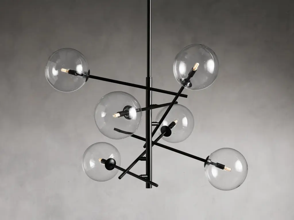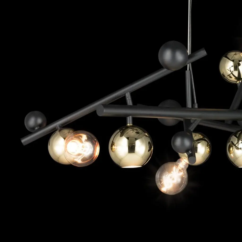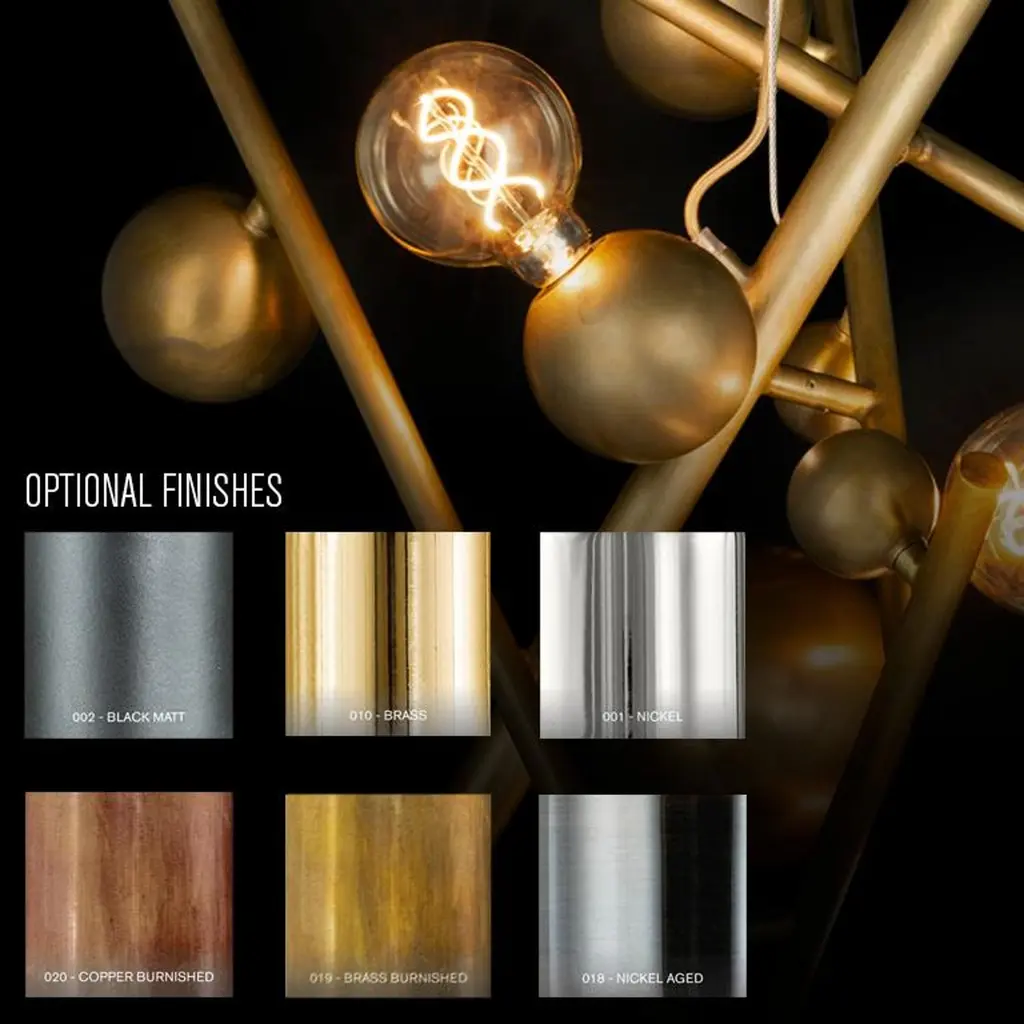 The Galaxy is modern pendant in a black matt finish with the globes in a different finish ans is designed by William Brand, founder of Brand van Egmond. Full of character and created to bring light above a table, the pendant is available in 5 dimensions and in the finishes black matt, nickel, brass, brass burnished and nickel aged. Custom dimensions and finishes upon request. To order this chandelier or for custom requests, please use art nr: GALC100BR as a reference.The Galaxy collection is a constellation of energy, movement and form. Propelling away from the centre of gravity towards clouds of stardust and outer planets. Orbiting through space, Galaxy offers a different experience when seen from different angles. Through an interaction between lines and globes, the energy and movement is made visible.The galaxy is available as a chandelier and a pendant.Upon receiving your confirmation, our atelier will start with the creation by hand of your ordered lighting sculpture. After your confirmation, we can no longer change the specifications of your order.