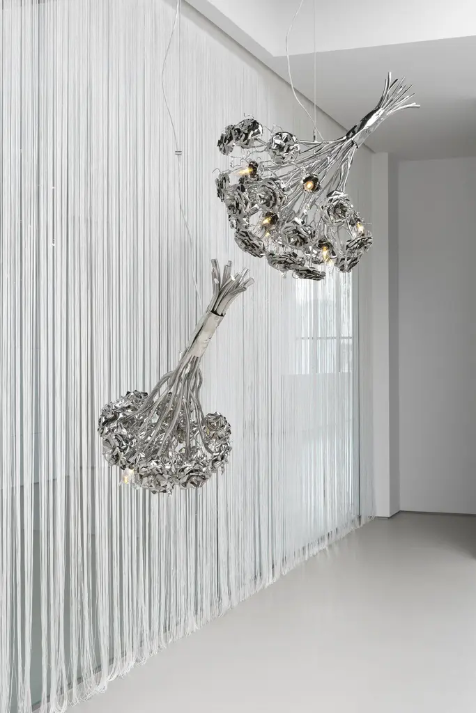 Regardless of our background, we all understand the language of beauty and tenderness. In every corner of the world, the gift of a bouquet of flowers is answered with a smile. What more to ask for, what else to give?The La Vie En Rose collection is available in different bouquets, roses, a hanging light and wall lights in nickel. Custom finishes upon request. Different lighting compositions can be created with the different elements of the La Vie En Rose collection. All combinations are possible. An example of a composition is included in the images.Upon receiving your confirmation, our atelier will start with the creation by hand of your ordered lighting sculpture. After your confirmation, we can no longer change the specifications of your order.