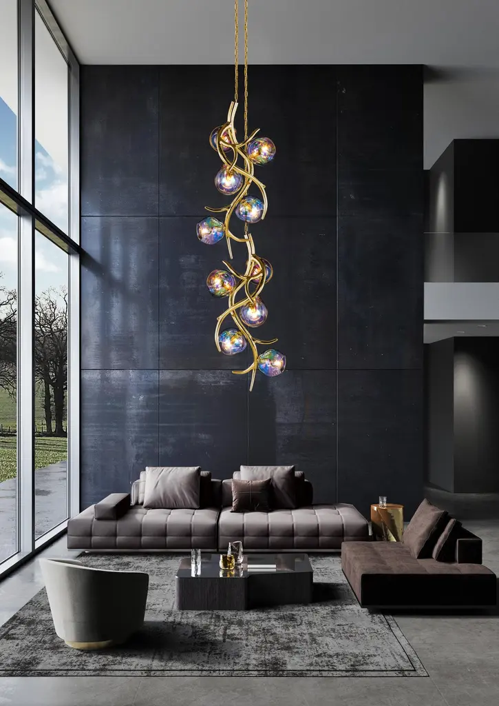 The Ersa, a modern chandelier vertical in a nickel finish with glass spheres, is designed by William Brand, founder of Brand van Egmond. Whether arranged in an entrance, a hallway or staircase, or other high space, the Ersa modern chandelier vertical will be a real eye-catcher as a single lighting piece or when grouped together. In fact, there are no limitations as to where this Ersa chandelier can be positioned due to the variety of sizes, optional finishes, or the many composition possibilities. Ersa, named after the ancient Greek goddess of morning dew, draws inspiration from that most magical moment of the day: the sunrise. Early morning, when the first light of day sends the darkness of the night away, we can see one of nature’s wonders on display: dew drops formed throughout the night. Just as the change of temperature on a surface creates dew, also new finishes and materials are born under shifting conditions. The iridescence on our glass, leading to the gradual change of color as the angle of view or illumination changes, radiates a stunning glow.The Ersa Collection is available in chandeliers, pendants, flushmounts, floor lamps, and wall lights and sconces.The Ersa collection offers several finishes for you to discover: Black matt, white matt, bronze, nickel, brass, and brass burnished. Standard the Ersa will be delivered with iridescent glass spheres. Other options are bronze translucent and clear glass spheres.Upon receiving your confirmation, our atelier will start with the creation by hand of your ordered lighting sculpture. After your confirmation, we can no longer change the specifications of your order.