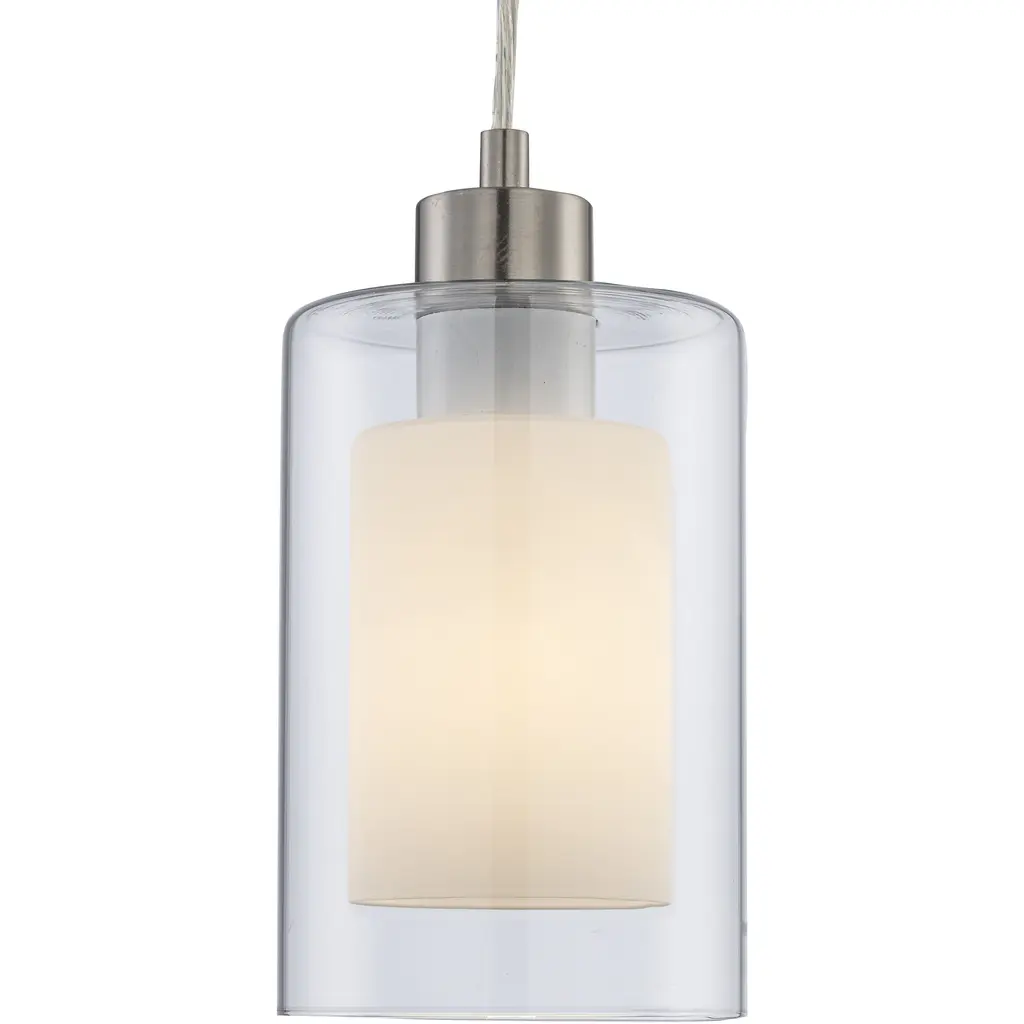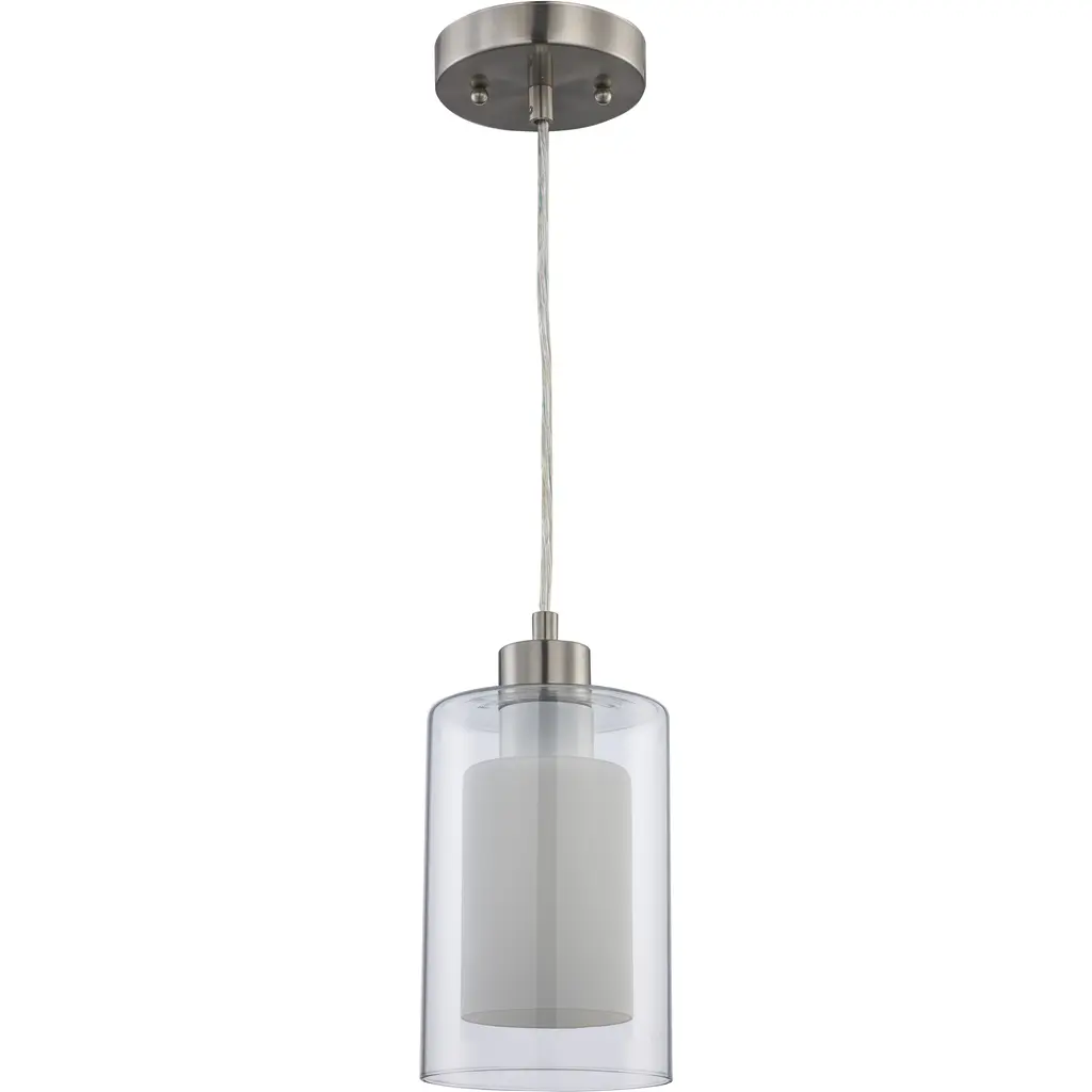 The Modesto Collection offers a beautiful, 5” diameter, 1-Light Contemporary indoor mini pendant. Crafted from metal and glass, it is unique in that it has a dual cylindrical shade. A white inner glass shade is cover by a clear glass outer shade. The shades cover a single, medium base 60W light bulb (sold separately). This pendant is suspended on an adjustable hanging cord and includes a metal ceiling canopy. With its petite size, you can use this pendant independent as a single source of light or display several over a wide space like a kitchen island, counter, or bar top. It can also be used over a bedroom nightstand or as a reading light.