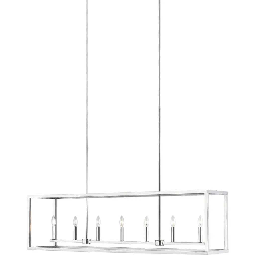 The Moffet Street seven light kitchen island light in Bronze offers a distinctive take on a rustic theme. Built in broad steel frames with hand-applied finish that mimics natural wood. This combination of rustic and urban fits comfortably in a wide variety of environments. The sharp, squared lines of the frame complement a wide variety of settings. The collection includes eight-light foyer, four-light foyer, one- light wall sconce, and a six-light island fixture. The Moffet Street Collection is available in three beautiful finishes Washed Pine, Brushed Nickel and Satin Brass All fixtures are California Title 24 compliant and damp rated for use in sheltered, damp environments.
