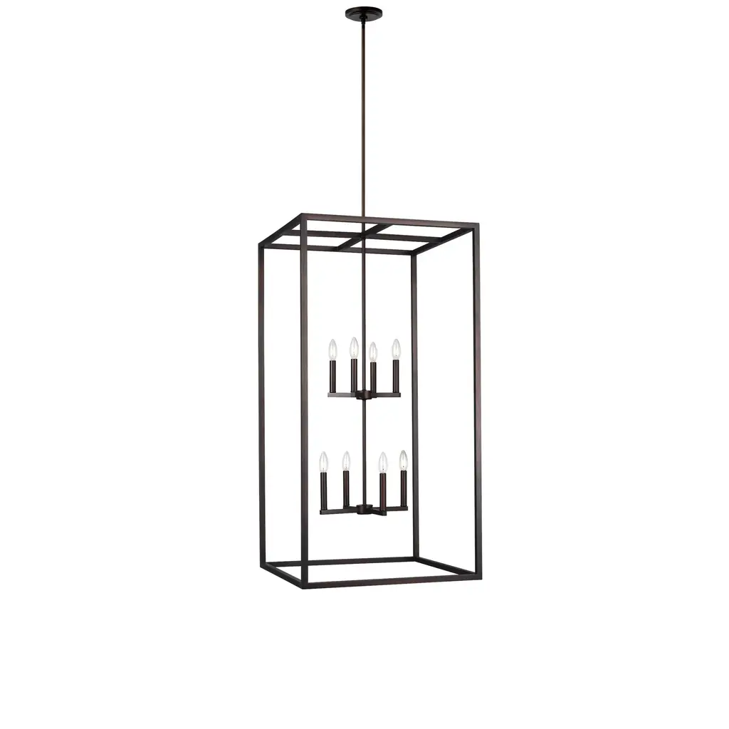 The Sea Gull Collection Moffet Street indoor pendant in bronze, satin brass, washed pine or brushed nickel is the perfect way to achieve your desired fashion or functional needs in your home. Moffet Street offers a distinctive take on a rustic theme. Built in broad steel frames with hand-applied finish that mimics natural wood. This combination of rustic and urban fits comfortably in a wide variety of environments. The sharp, squared lines of the frame complement a wide variety of settings. The collection includes eight-light foyer, four-light foyer, one- light wall sconce, and a six-light island fixture. The Moffet Street Collection is available in three beautiful finishes Brushed Nickel and Satin Brass All fixtures are California Title 24 compliant and damp rated for use in sheltered, damp environments. Features