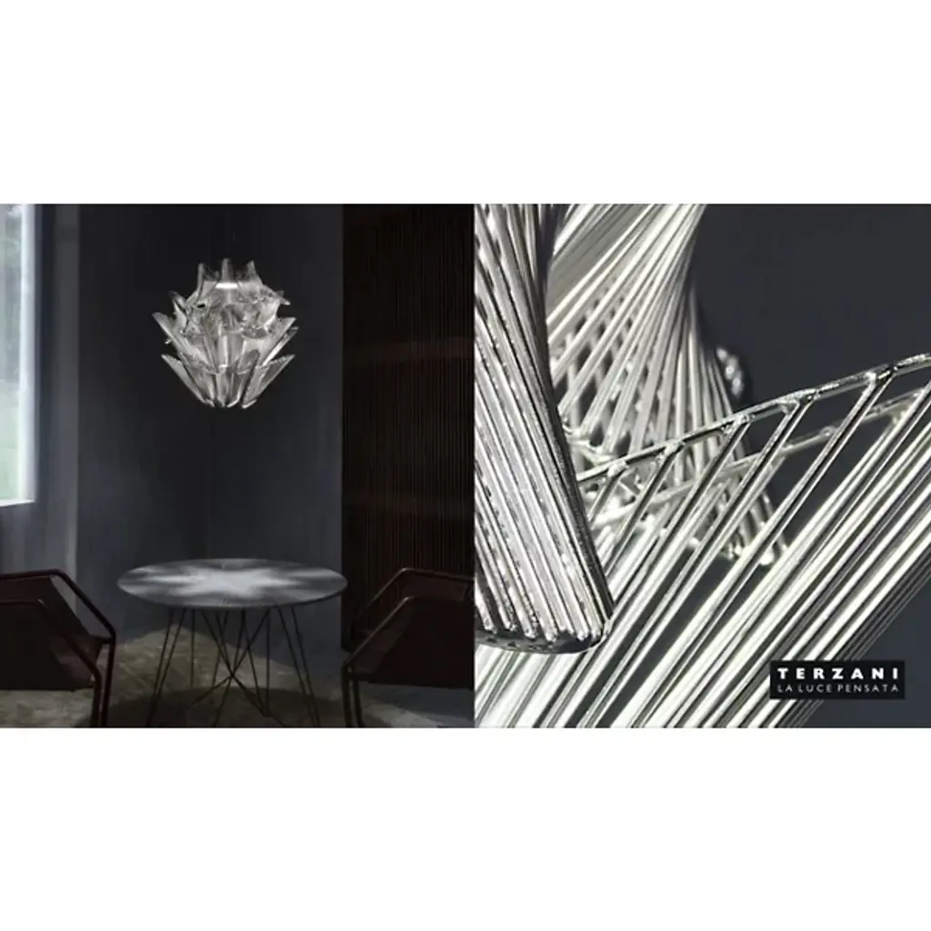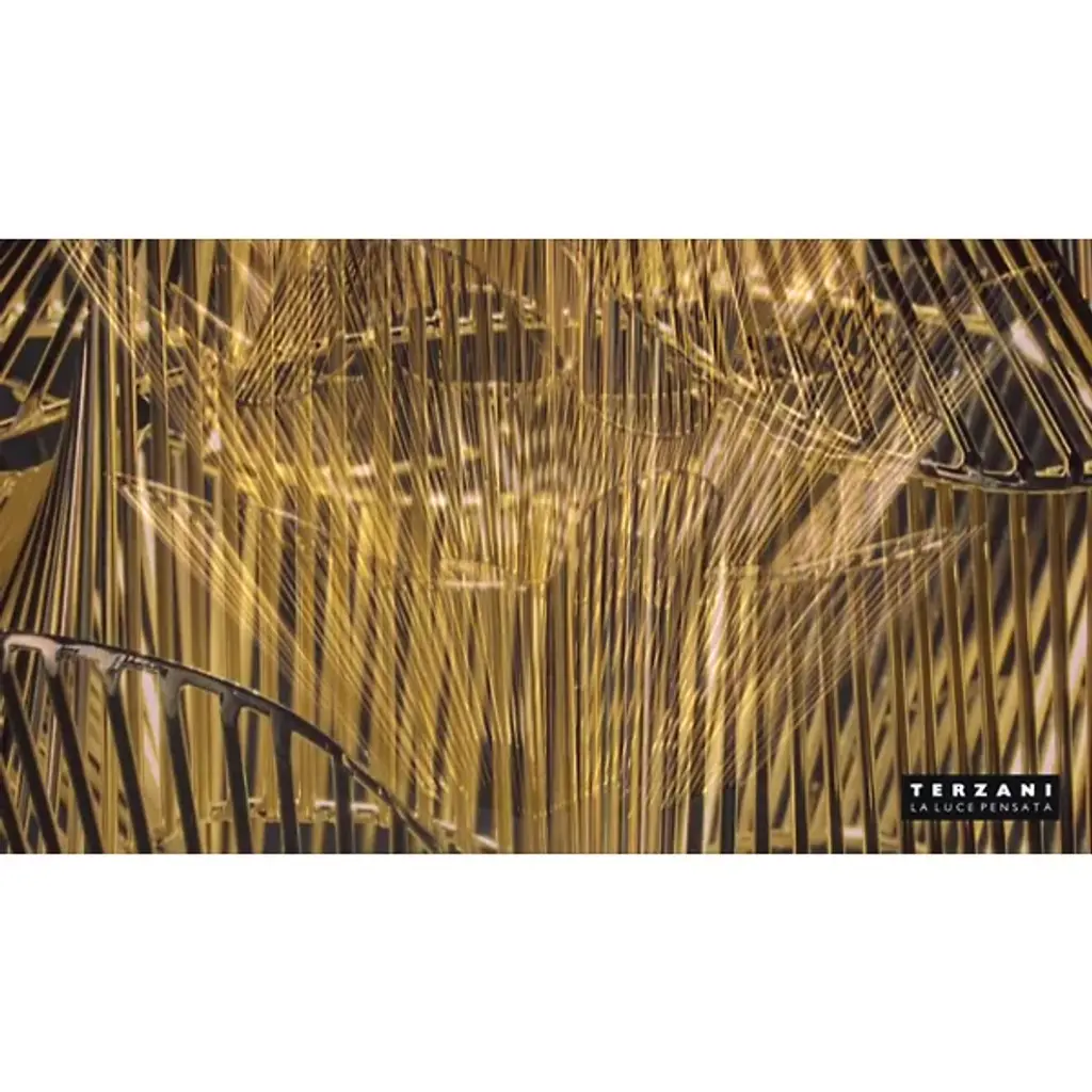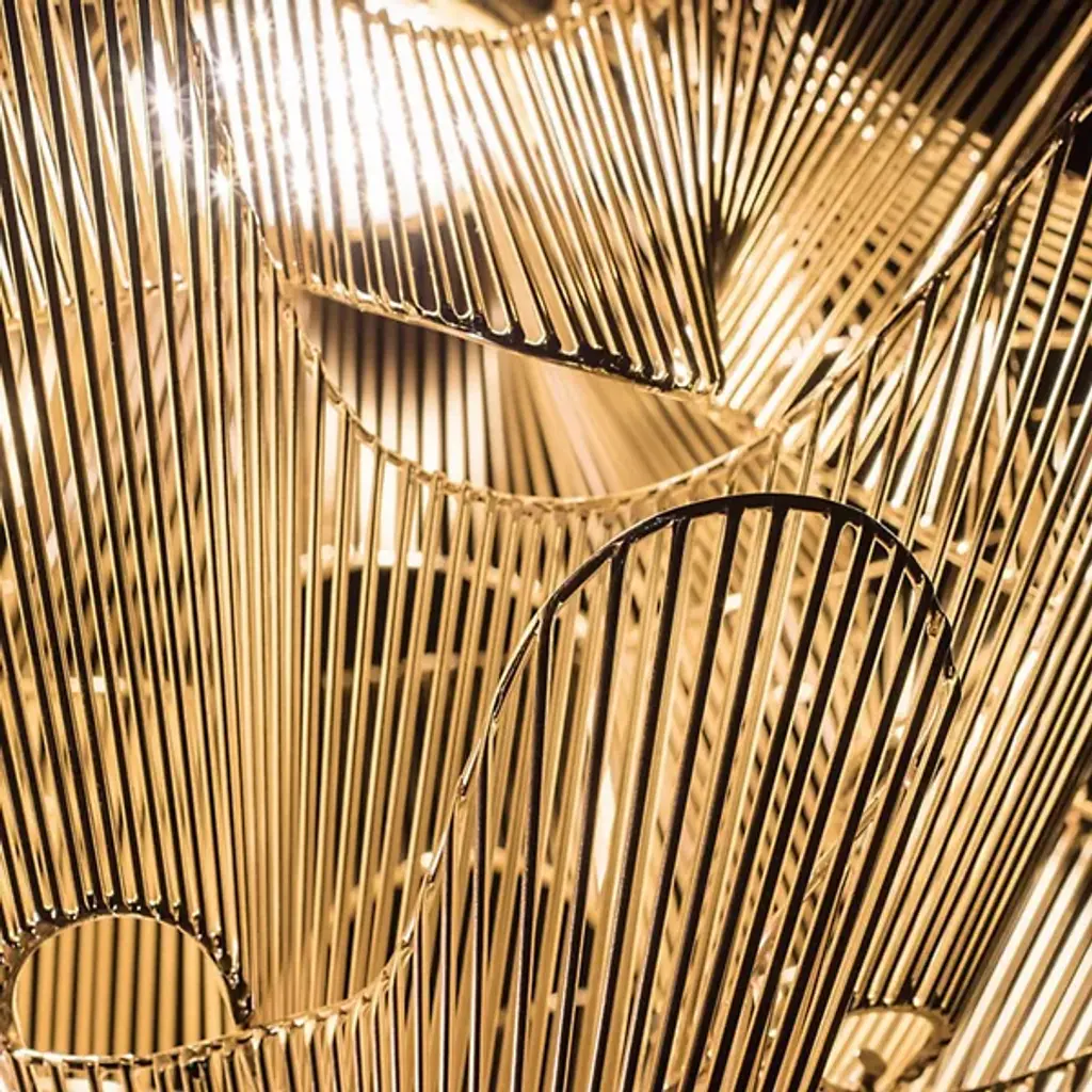 Add a sculptural and appealing elegance to your inside ceiling spaces with the Moire LED Pendant from Terzani. A signature design from the mind of Christian Lava, the sweeping structure incorporates his experience with overlapping layers to create a memorable addition to its surroundings. The Moire derives its name from a watered silk wave, using a sleek disc canopy and slender wire to suspend potent LED lamping inside a swirling ribbon made from metal grids braced by a series of small ladderlike strands that glows with reflected light.