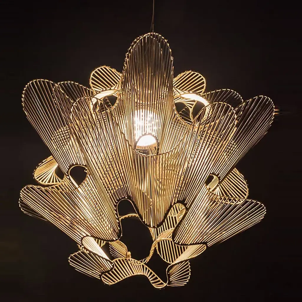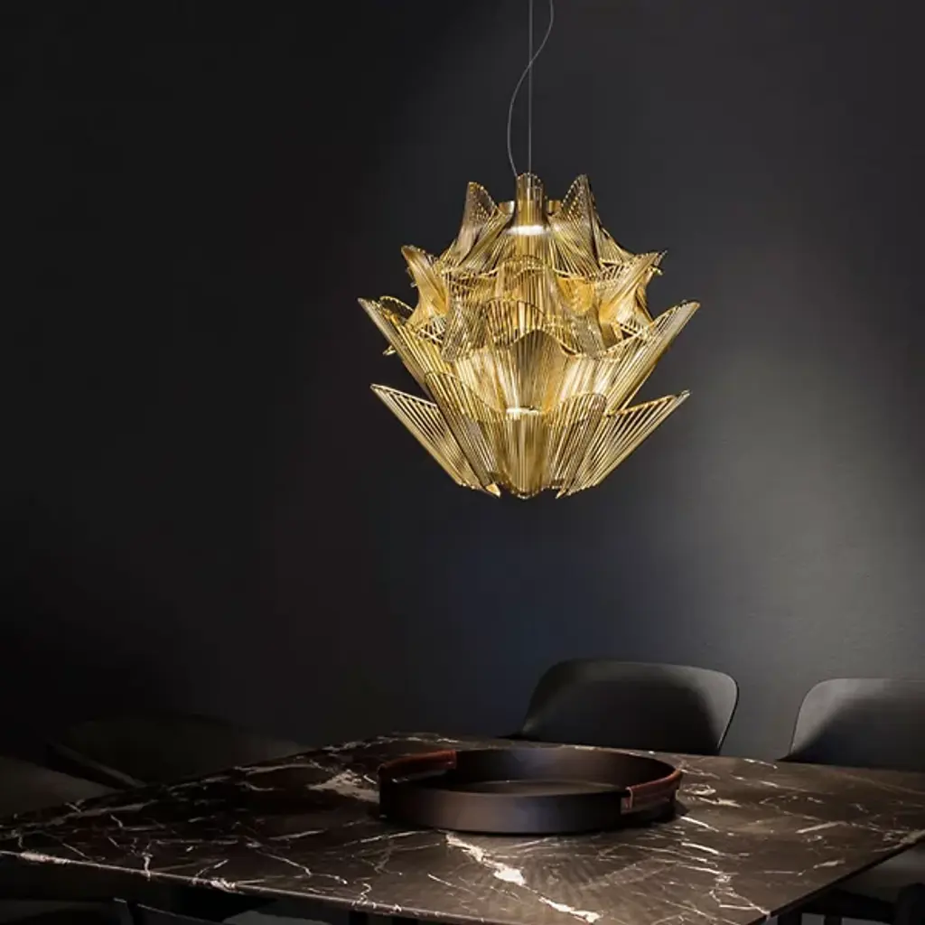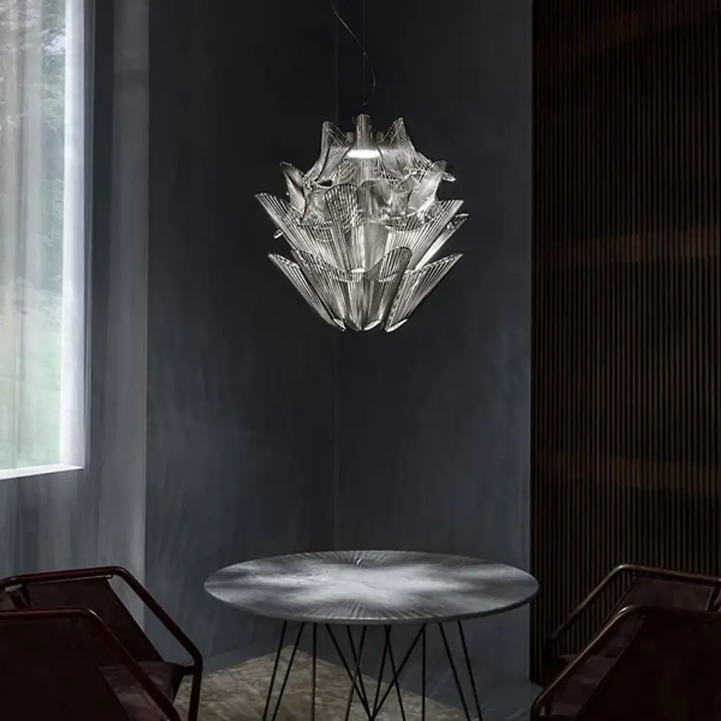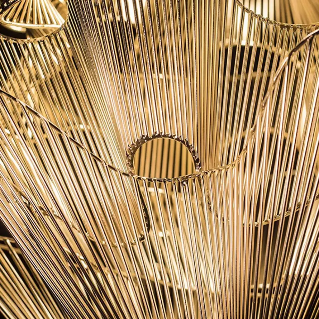 Add a sculptural and appealing elegance to your inside ceiling spaces with the Moire LED Pendant from Terzani. A signature design from the mind of Christian Lava, the sweeping structure incorporates his experience with overlapping layers to create a memorable addition to its surroundings. The Moire derives its name from a watered silk wave, using a sleek disc canopy and slender wire to suspend potent LED lamping inside a swirling ribbon made from metal grids braced by a series of small ladderlike strands that glows with reflected light.