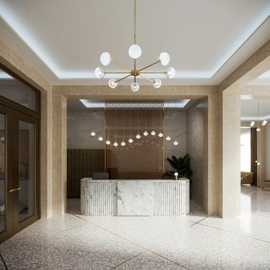 Inspired by Art Deco atmospheres yet clearly contemporary, the Molecola collection combines natural or antique brass elements with glass spheres. The collection includes an Italian brass pendant lamp, floor lamp, ceiling lamp, wall lamp and tablelamp. They can be used individually or combined to create customised compositions.