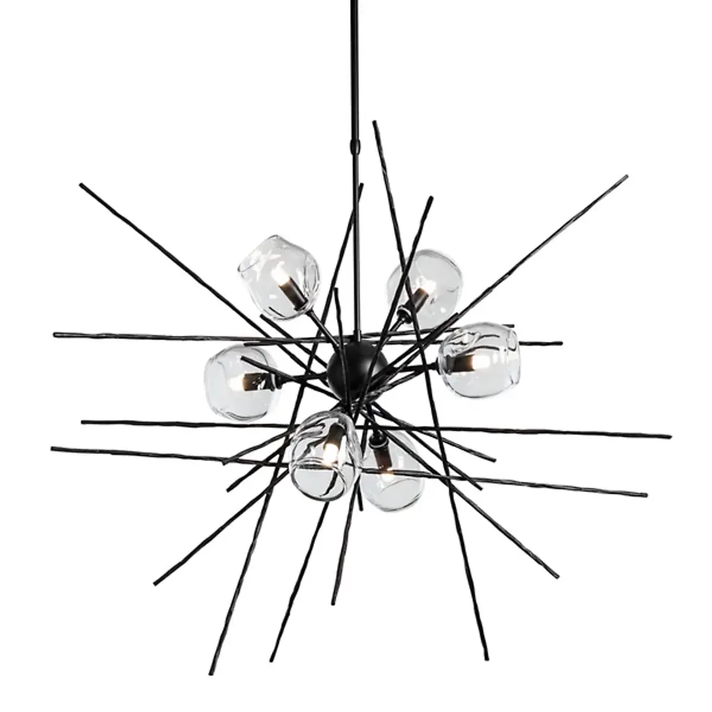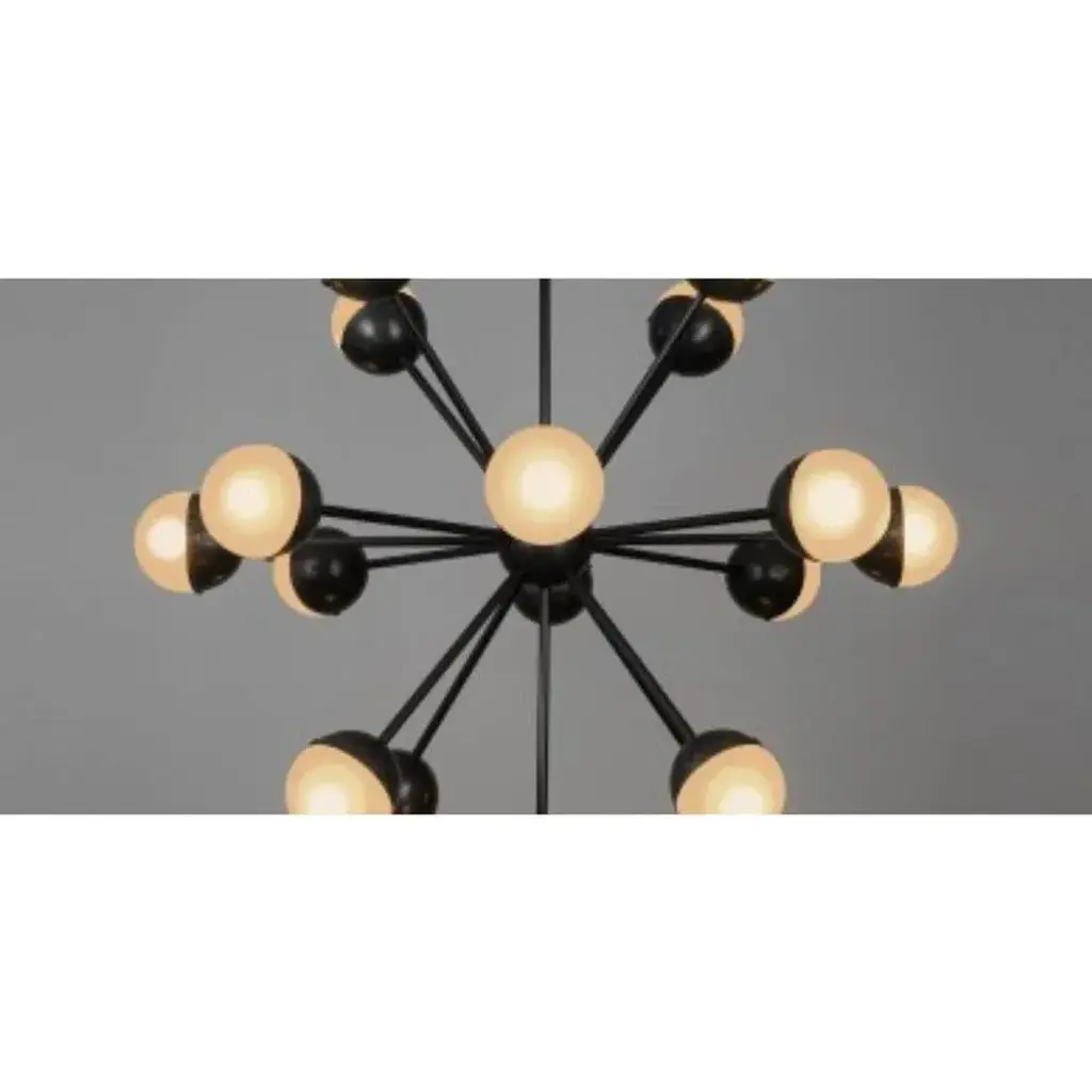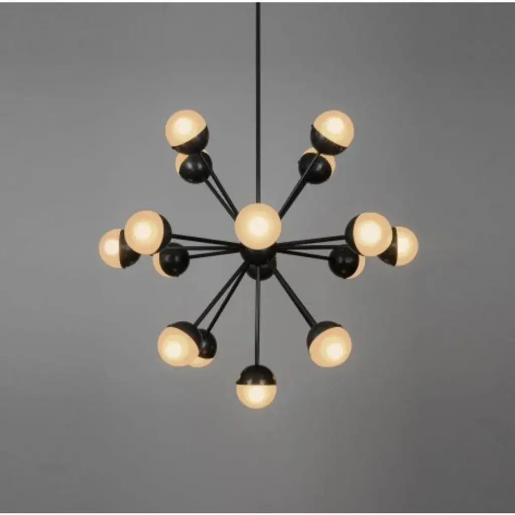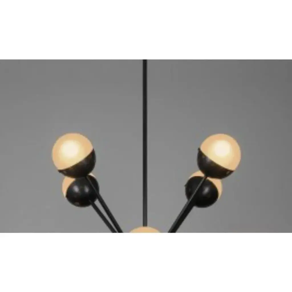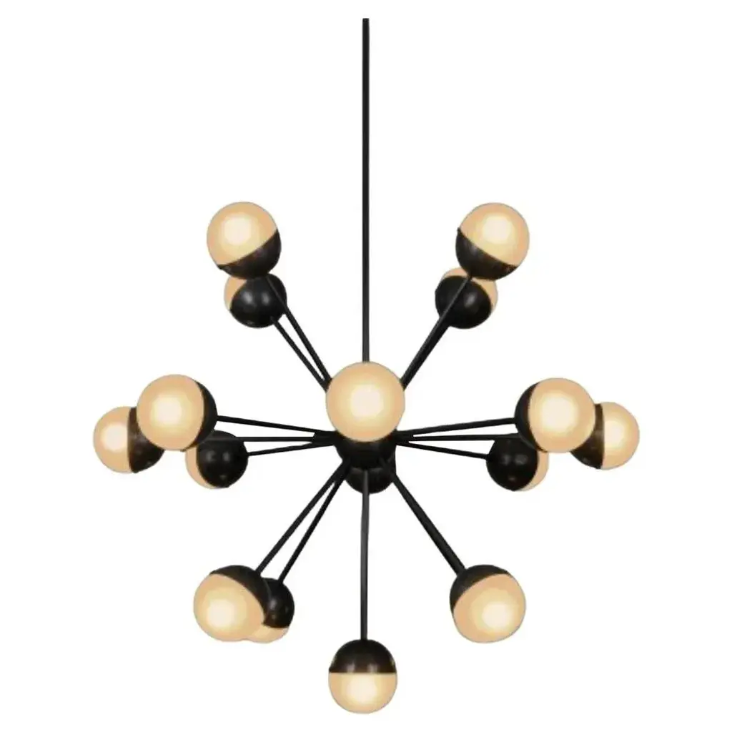 Molecule spark round 17 chandelier by Schwung Dimensions: D97.9 x H 191.4 cm Materials: Brass, Opal glass Weight: 14.2 kg Finishes available: Black gunmetal, polished nickel, brass Other sizes available. Schwung is a german word, and loosely defined, means energy or momentum of a positive manner. synonyms: verve, zest, panache, momentum. Up to 250V (Europe/UK Standard).