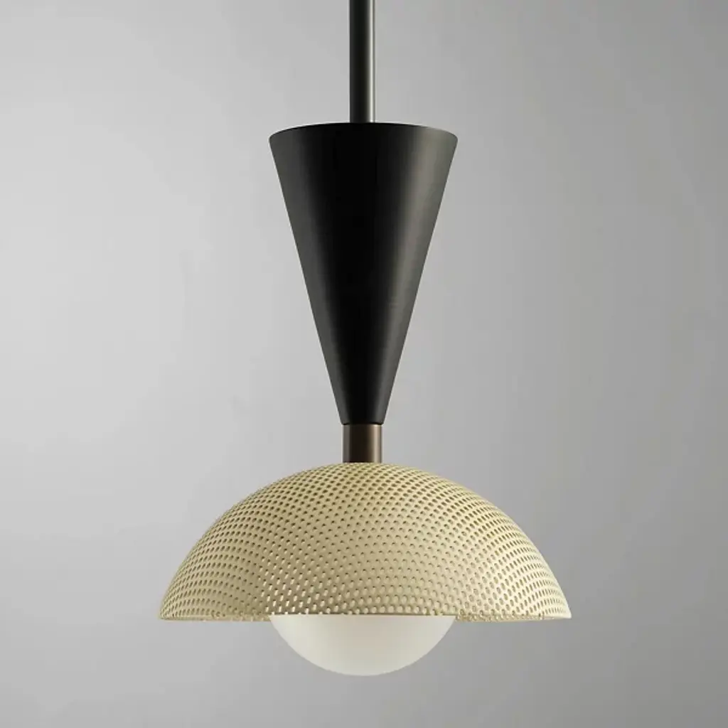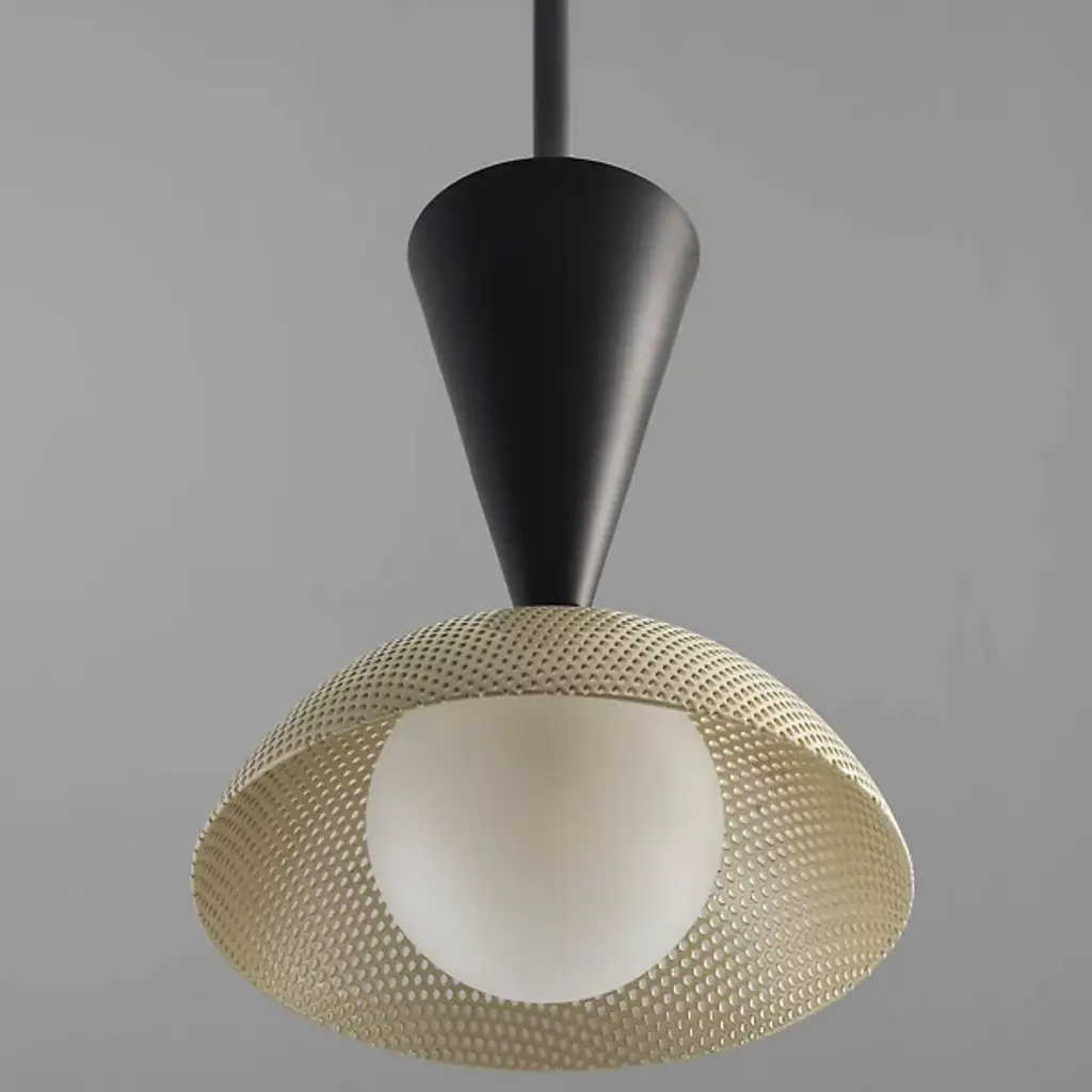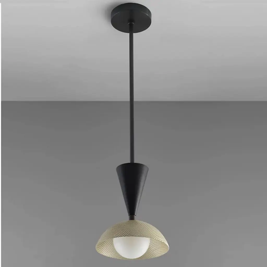 Decorate your living arrangement with the chic Molto Mini Pendant by Blueprint Lighting. This exquisite fixture takes the tradition of Italian modernism and brings it into the 21st century. Fine aluminum has been worked into a conical shape that unites seamlessly with a dome-shaped crema shade. The eye is drawn to the multitude of petite dots that line the shade’s surface. Within this shade is a globe containing a halogen bulb that radiates light throughout your home. This decorative piece is designed by the Blueprint Lighting team headed by Kelly Aaron, who has been creating high-quality fixtures since 2016. Her extensive art gallery background informs her work and the work of the talented artists by which she is surrounded.