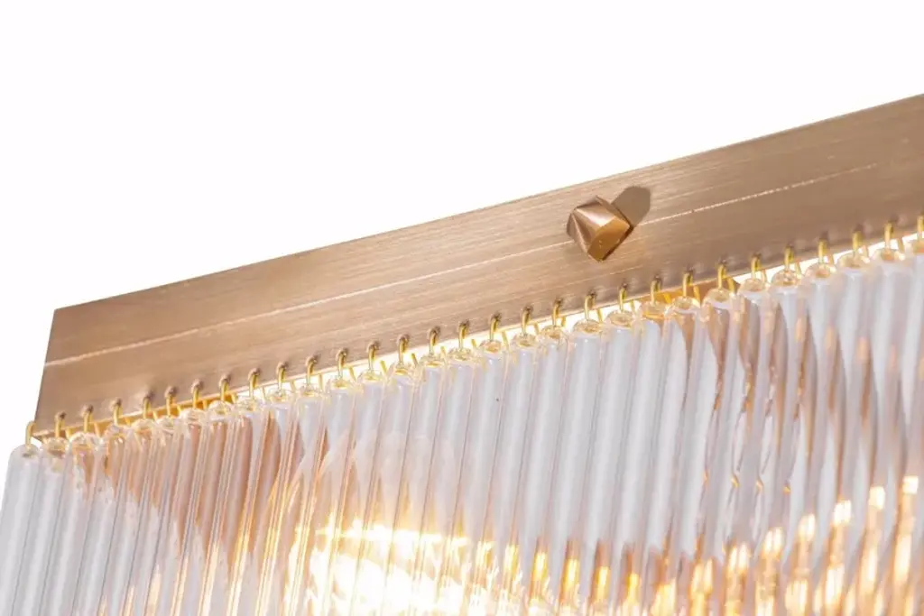 Monaco I is a suspension lamp made of brass and glass tubes.Finishes: Antique, Shiny brass, Matt brass, Shiny nickel, Matt nickelCapacity : 5x75 W E27Monaco collection’s pieces are a mix of elegant square shape frames and crystal clear hand cut glasses. The majority of the lamps are perfect for average height spaces. Some pieces are fitted with more than 1000 glass tubes. Available in antique, shiny brass and nickel finish.