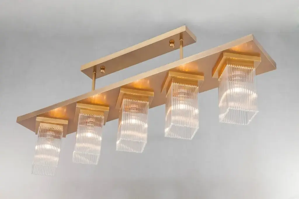 Monaco IX is a suspension lamp made of brass and glass tubes.Finishes: Antique, Shiny brass, Matt brass, Shiny nickel, Matt nickelCapacity : 5x75 W E27Monaco collection’s pieces are a mix of elegant square shape frames and crystal clear hand cut glasses. The majority of the lamps are perfect for average height spaces. Some pieces are fitted with more than 1000 glass tubes. Available in antique, shiny brass and nickel finish.