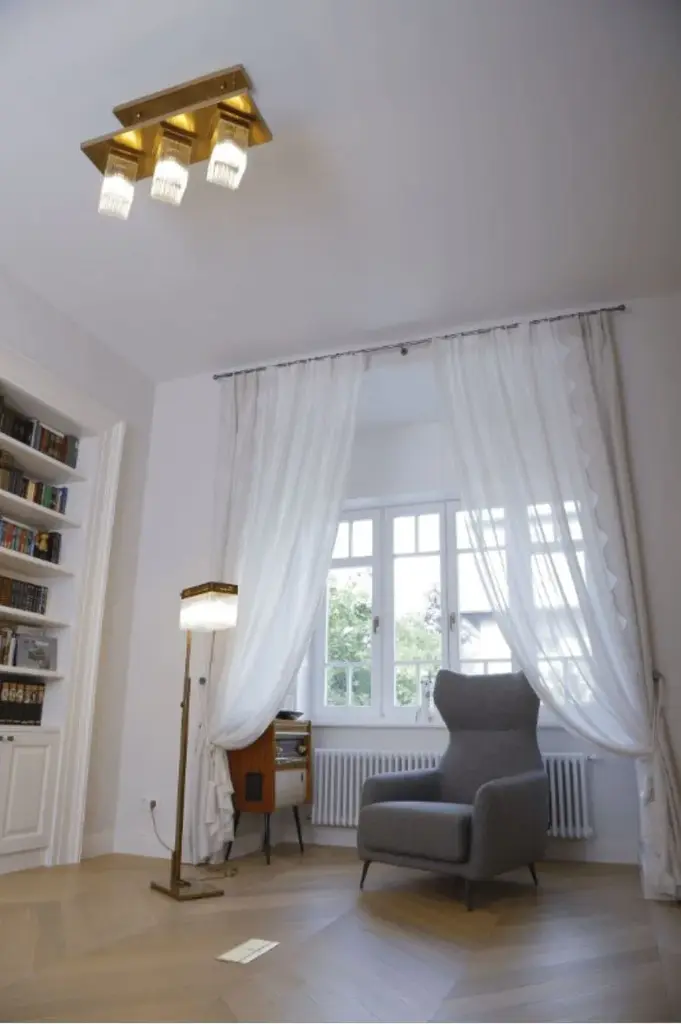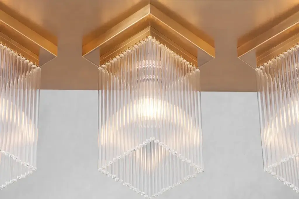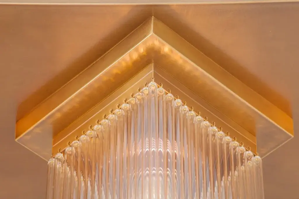 Monaco V is a suspension lamp made of brass and glass tubes.Finishes: Antique, Shiny brass, Matt brass, Shiny nickel, Matt nickelCapacity : 3x75 W E27Monaco collection’s pieces are a mix of elegant square shape frames and crystal clear hand cut glasses. The majority of the lamps are perfect for average height spaces. Some pieces are fitted with more than 1000 glass tubes. Available in antique, shiny brass and nickel finish.