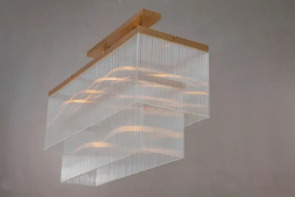 Monaco XI is a suspension lamp made of brass and glass tubes.Finishes: Antique, Shiny brass, Matt brass, Shiny nickel, Matt nickelCapacity : 10x60 W E14Monaco collection’s pieces are a mix of elegant square shape frames and crystal clear hand cut glasses. The majority of the lamps are perfect for average height spaces. Some pieces are fitted with more than 1000 glass tubes. Available in antique, shiny brass and nickel finish.