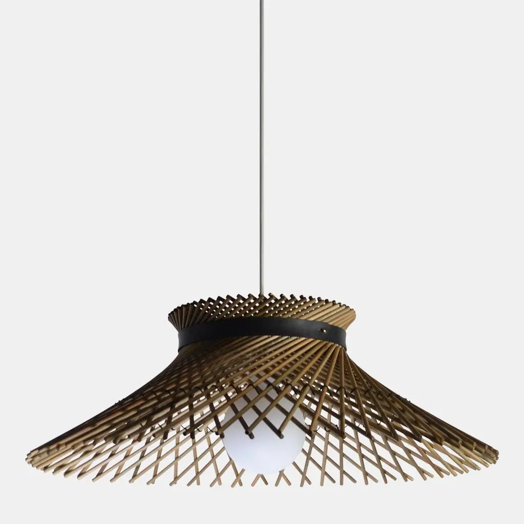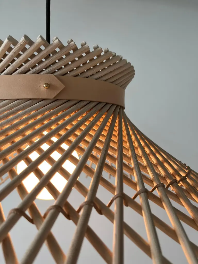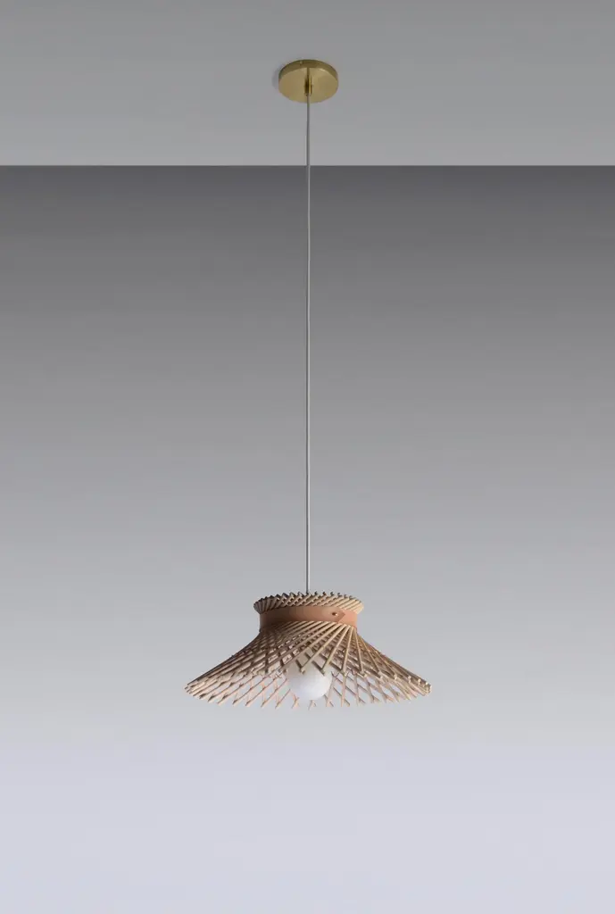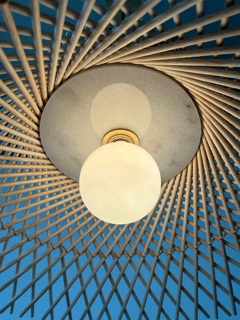 Mooda Bleached Maple pendant 9 by INDO-Dimensions: Ø 66 x H 25.4 cm (Suspension height is made to specification)Materials: Bleached Maple, Mugla White stoneAll our lamps can be wired according to each country. If sold to the USA it will be wired for the USA for instance.ELECTRICALLAMPING100-250V Rated E26 Metal SocketDIMMINGLeading Edge OR Trailing EdgeFits all standard J-BoxesBULBTALA SPHERE IIG24 Matte Glass LED Bulb110-120V 6W95CRI 480Lm 2700KAlso available in other dimensions and materials. Please contact us.Dimension options: Ø 41.9 x H 17.8 cm.Material options:WOODMapleOak FINISHBleachedNaturalOxidizedSTONEMugla WhiteMadurai BlackCrema MarfilNero Marquina Venetian CalacattaLEATHERVachetta NaturalVinegaroon BlackMETALMatte BlackBrushed BrassFABRIC CORDBlackWhiteEach piece is carefully handcrafted by our team using natural materials and traditional processes. Slight variations may occur. INDO- is an award winning interdisciplinary design studio based in Providence, RI. Founded in 2018 by Urvi Sharma and Manan Narang - both grew up in New Delhi and met at the Rhode Island School of Design - INDO- is a product of experiencing both places and cultures. Using a blend of craft and narrative in our creative process, we aim to share the rich cultural and historical identity we bring with us as Indian designers in the rapidly changing landscape of American design. With a focus on re-contextualizing traditional techniques from different disciplines of art and craft into our work, INDO- creates contemporary objects that celebrate the handmade and acknowledge the people and places that inspired them.