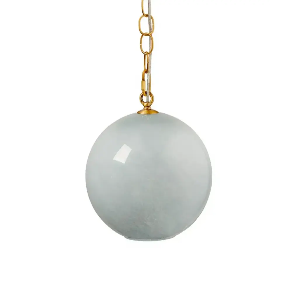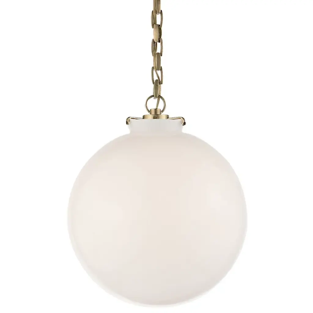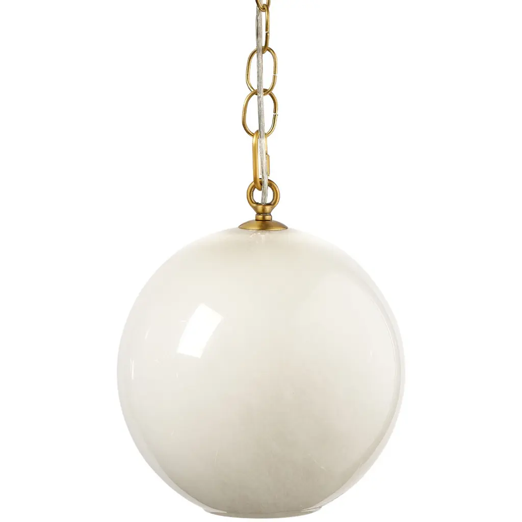 Opaline white glass globe surfaces a tortoise-like texture that feels so unique and ethereal. In true Kara Mann fashion, pendant light hangs from a polished unlacquered brass chain that adds a bit of dimension as the finish ages. Glows beautifully when on. CB2 exclusive.