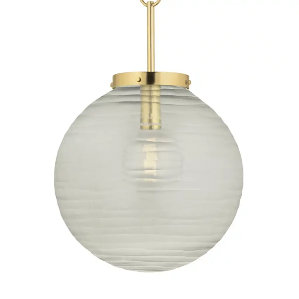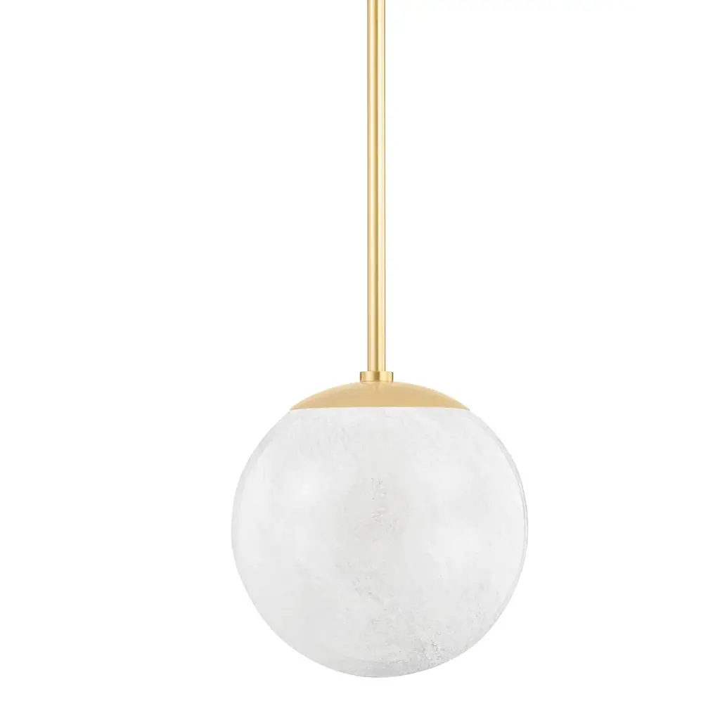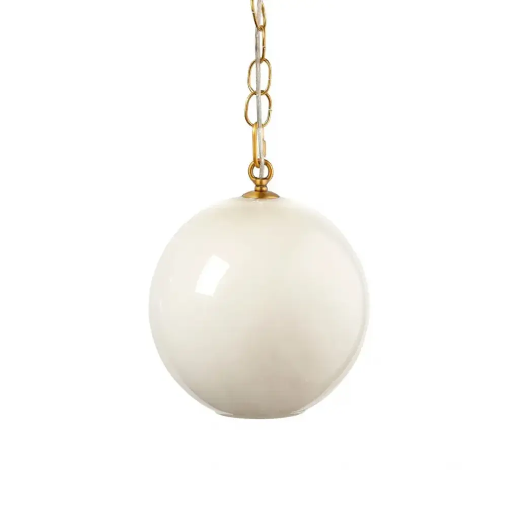 Opaline white glass globe surfaces a tortoise-like texture that feels so unique and ethereal. In true Kara Mann fashion, pendant light hangs from a polished unlacquered brass chain that adds a bit of dimension as the finish ages. Glows beautifully when on. CB2 exclusive.