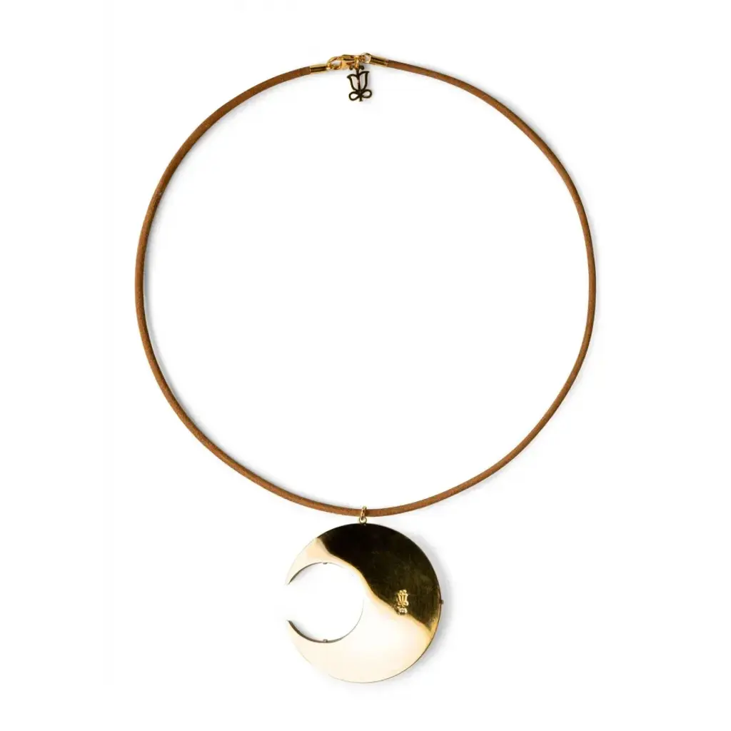Porcelain pendant inspired by the magic moon, the symbol of Diana, the Roman goddess of hunting and the protector of nature. The crescent moon is the central motif of this piece of jewelry made in white porcelain decorated with golden luster and soft nobuk leather. An iconic Spanish brand, Lladro is a world leader in the creation of porcelain art. Started by brothers Juan, Jose and Vicente Lladro in 1953, the ceramic figurines were initially inspired by the works of great European manufacturers like Meissen and Sevres. Over time, a unique style was forged, consisting of elongated lines, a revolutionary single-firing method, and soft pastel tones.