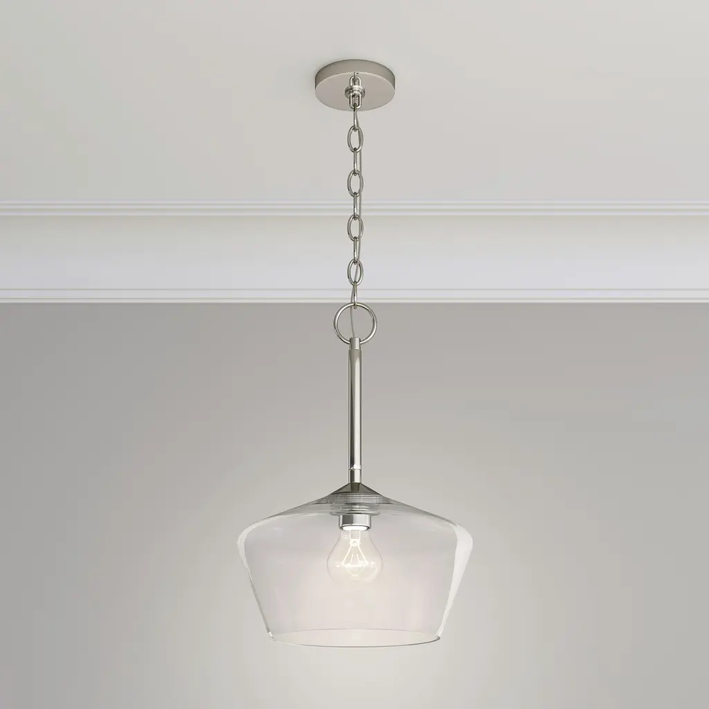 A clear glass, tulip-shaped shade sets a sophisticated tone for the Morbelle Family. Refined bar and chain hardware, finished in either matte black or polished nickel, further enhances the profile and seamlessly melds into the glass dome. These 1-light pendants underscore the elegance of any space and provide ultimate illumination.