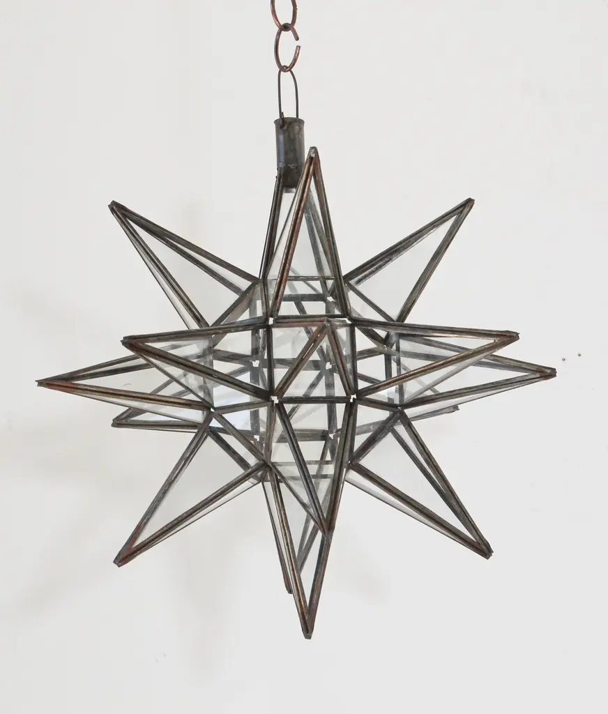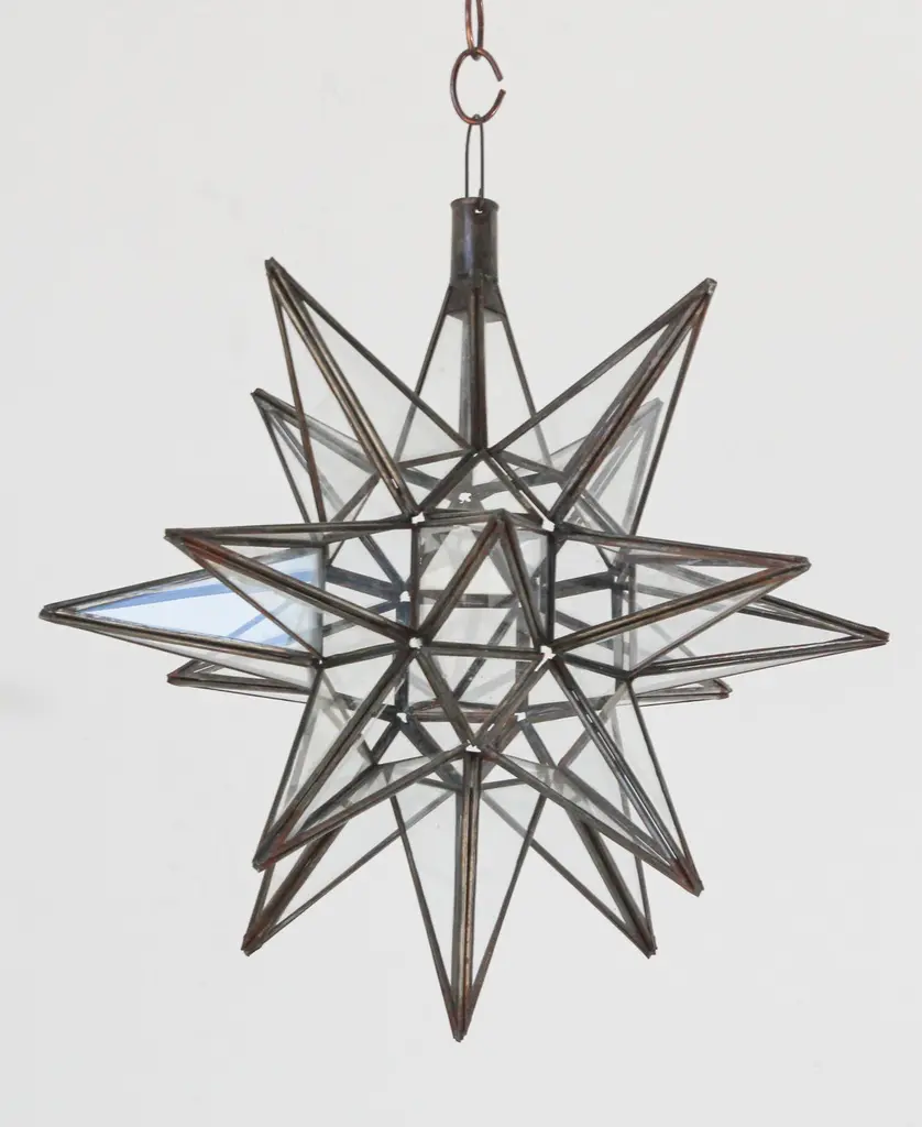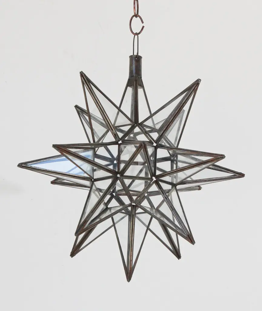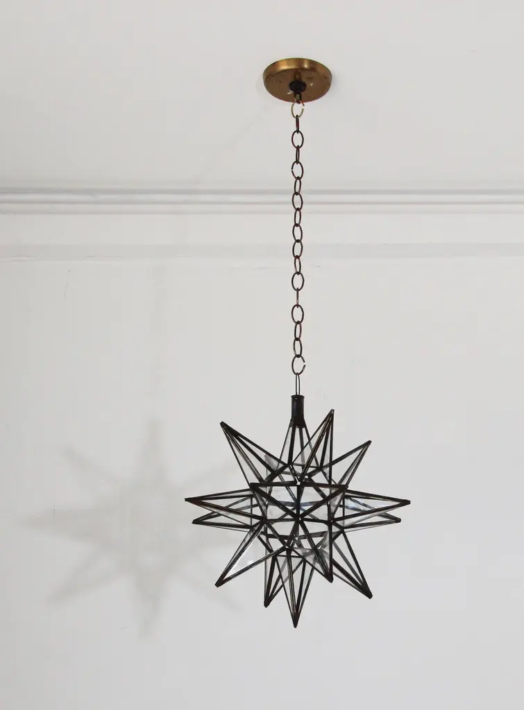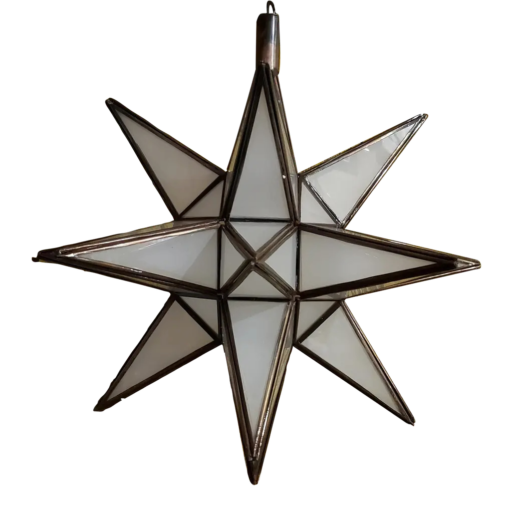 Moroccan clear glass and metal framed Moravian star shape lantern A beautiful vintage geometric metal and glass star pendant. Multifaceted large star lantern with glass panels that form geometrical shapes similar to Moravian stars. The lantern has top-side access to inside lamp. Measures:'Star' is 16 inches in diameter.Not wired for electricity, shade only.For indoor or covered area use only.Metal is rust color.Hand made in Morocco.About the Moroccan lanterns:The metal and glass hand-crafted lantern from Morocco is a captivating pieces of artistry that combines the rich cultural heritage and exquisite craftsmanship of the region. Its design reflects the traditional Moroccan style, which is renowned for its intricate detailing and vibrant aesthetic. This vintage Moroccan lantern is meticulously handcrafted using a combination of metal and glass, resulting in a stunning blend of materials that enhances its overall beauty. The framework of the Moorish lantern is skillfully constructed from metal which provides a sturdy foundation and intricate patterns. The metalwork adorning the Moroccan light fixture features intricate filigree patterns, geometric motifs, and delicate scrollwork, all meticulously hand-cut by skilled Moroccan artisans in Marrakech.These ornate Moorish designs create mesmerizing shadows when the Moroccan hanging lantern is illuminated, casting enchanting patterns that dance across the surroundings. The glass components of the Moroccan lantern add a touch of elegance and brilliance to its appearance.Clear and multicolor glass panels are carefully inserted into the metal framework.These panels may showcase traditional Moroccan geometric Islamic designs. When the Moroccan lantern is lit from within, the glow emanating through the colorful glass panels transforms the surrounding space into a warm and inviting atmosphere.The interplay of light and shadow created by the intricate metalwork and the translucent glass adds depth and allure to the lantern's overall charm. The craftsmanship of this Moroccan light fixture is a testament to the dedication and skill of the artisans who meticulously handcraft each piece. The attention to detail, the artistic flair, and the fusion of metal and glass make this Moroccan lantern a true work of art, capturing the essence of Moroccan culture and heritage.Whether displayed as a centerpiece or hung from a hook, this metal and glass handcrafted lantern from Morocco effortlessly evokes a sense of enchantment, transporting you to the vibrant streets and magical ambiance of Moroccan nights.