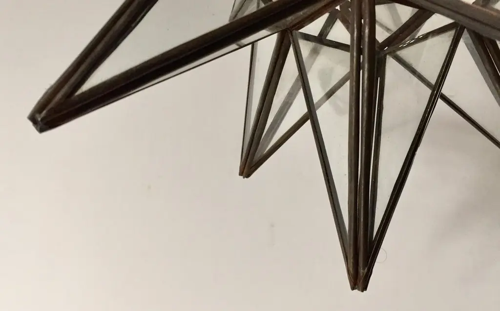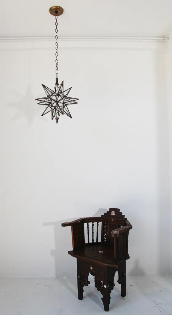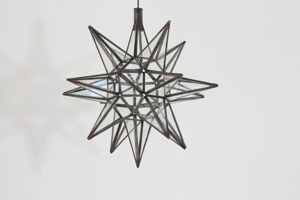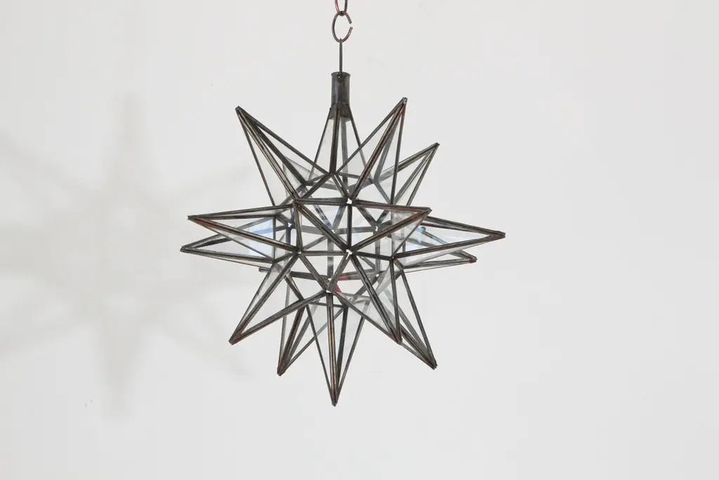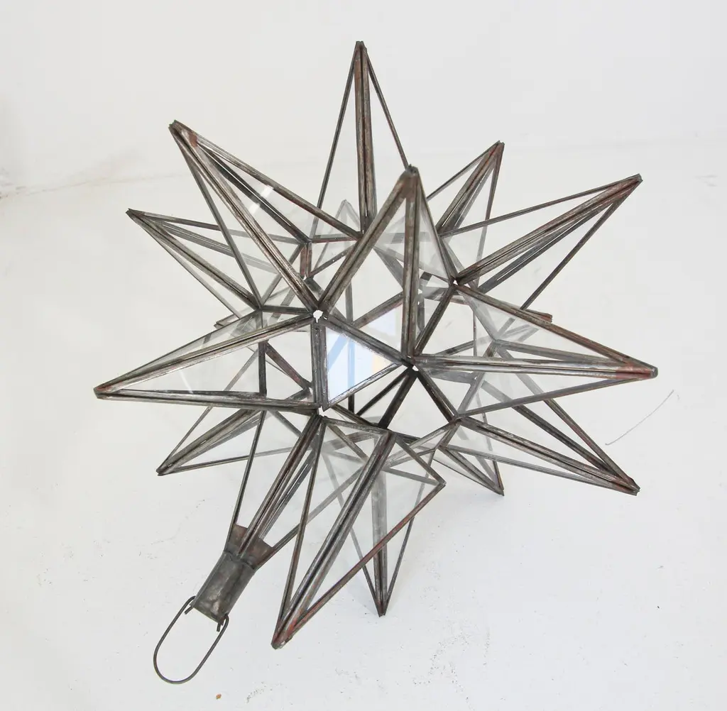Moroccan clear glass and metal framed Moravian star shape lantern A beautiful vintage geometric metal and glass star pendant. Multifaceted large star lantern with glass panels that form geometrical shapes similar to Moravian stars. The lantern has top-side access to inside lamp. Measures:'Star' is 16 inches in diameter.Not wired for electricity, shade only.For indoor or covered area use only.Metal is rust color.Hand made in Morocco.About the Moroccan lanterns:The metal and glass hand-crafted lantern from Morocco is a captivating pieces of artistry that combines the rich cultural heritage and exquisite craftsmanship of the region. Its design reflects the traditional Moroccan style, which is renowned for its intricate detailing and vibrant aesthetic. This vintage Moroccan lantern is meticulously handcrafted using a combination of metal and glass, resulting in a stunning blend of materials that enhances its overall beauty. The framework of the Moorish lantern is skillfully constructed from metal which provides a sturdy foundation and intricate patterns. The metalwork adorning the Moroccan light fixture features intricate filigree patterns, geometric motifs, and delicate scrollwork, all meticulously hand-cut by skilled Moroccan artisans in Marrakech.These ornate Moorish designs create mesmerizing shadows when the Moroccan hanging lantern is illuminated, casting enchanting patterns that dance across the surroundings. The glass components of the Moroccan lantern add a touch of elegance and brilliance to its appearance.Clear and multicolor glass panels are carefully inserted into the metal framework.These panels may showcase traditional Moroccan geometric Islamic designs. When the Moroccan lantern is lit from within, the glow emanating through the colorful glass panels transforms the surrounding space into a warm and inviting atmosphere.The interplay of light and shadow created by the intricate metalwork and the translucent glass adds depth and allure to the lantern's overall charm. The craftsmanship of this Moroccan light fixture is a testament to the dedication and skill of the artisans who meticulously handcraft each piece. The attention to detail, the artistic flair, and the fusion of metal and glass make this Moroccan lantern a true work of art, capturing the essence of Moroccan culture and heritage.Whether displayed as a centerpiece or hung from a hook, this metal and glass handcrafted lantern from Morocco effortlessly evokes a sense of enchantment, transporting you to the vibrant streets and magical ambiance of Moroccan nights.