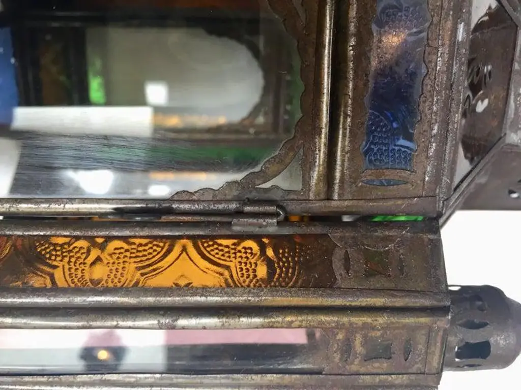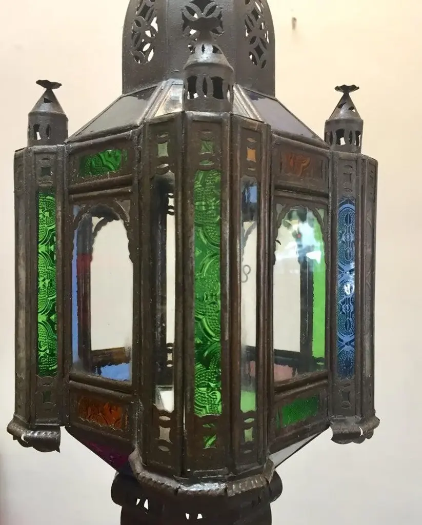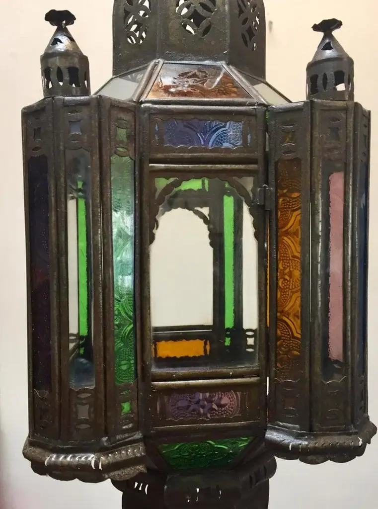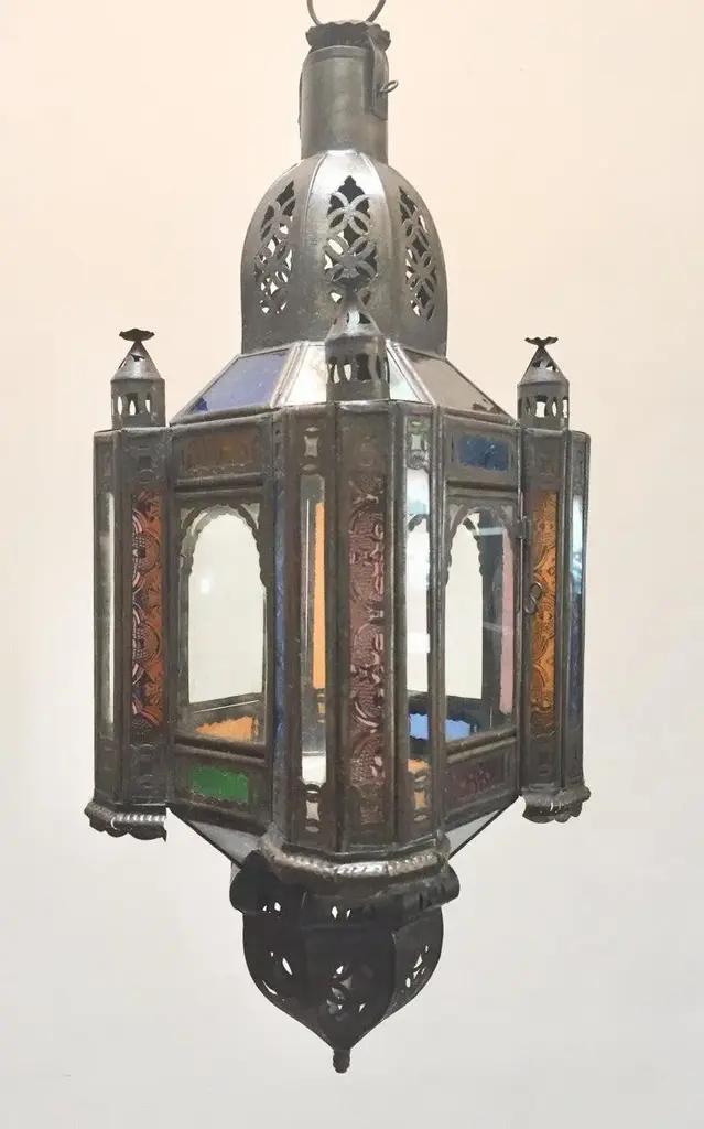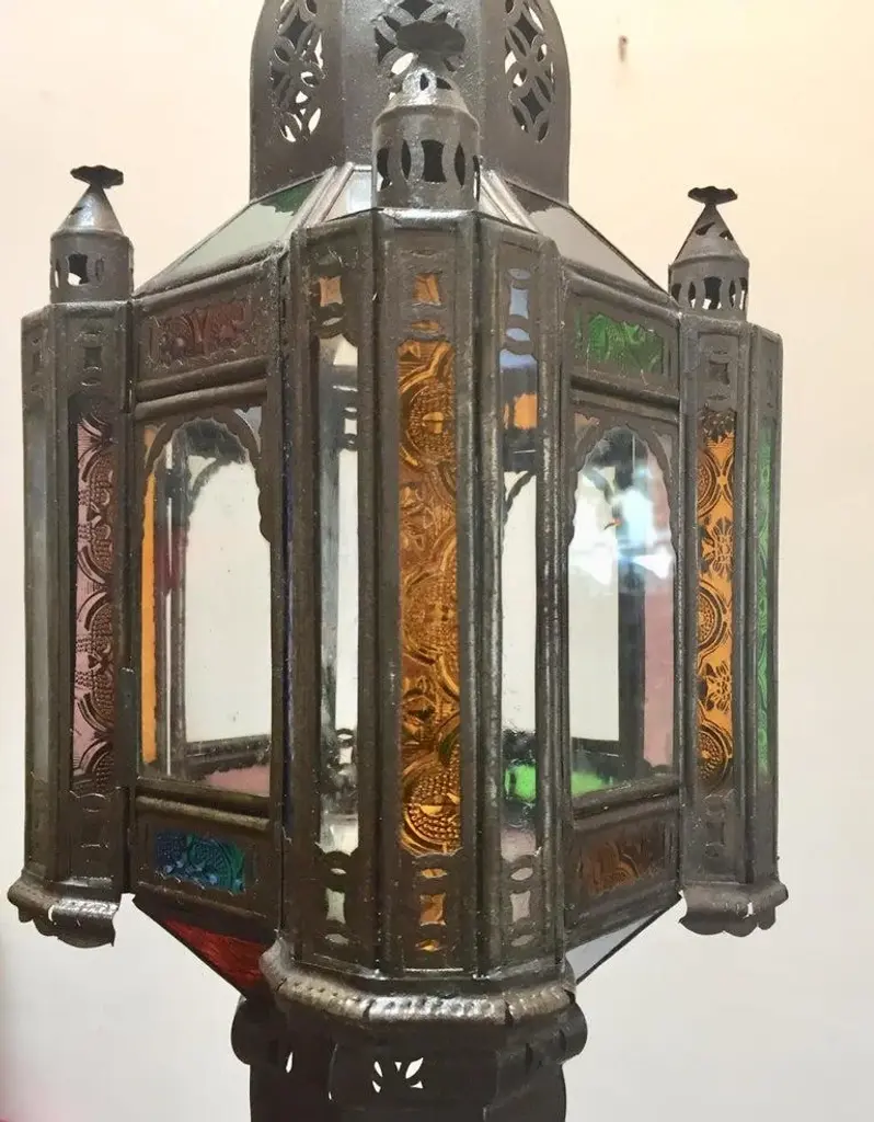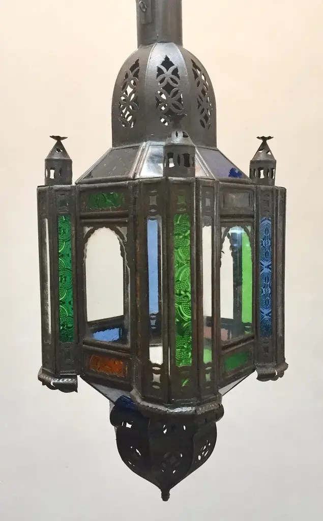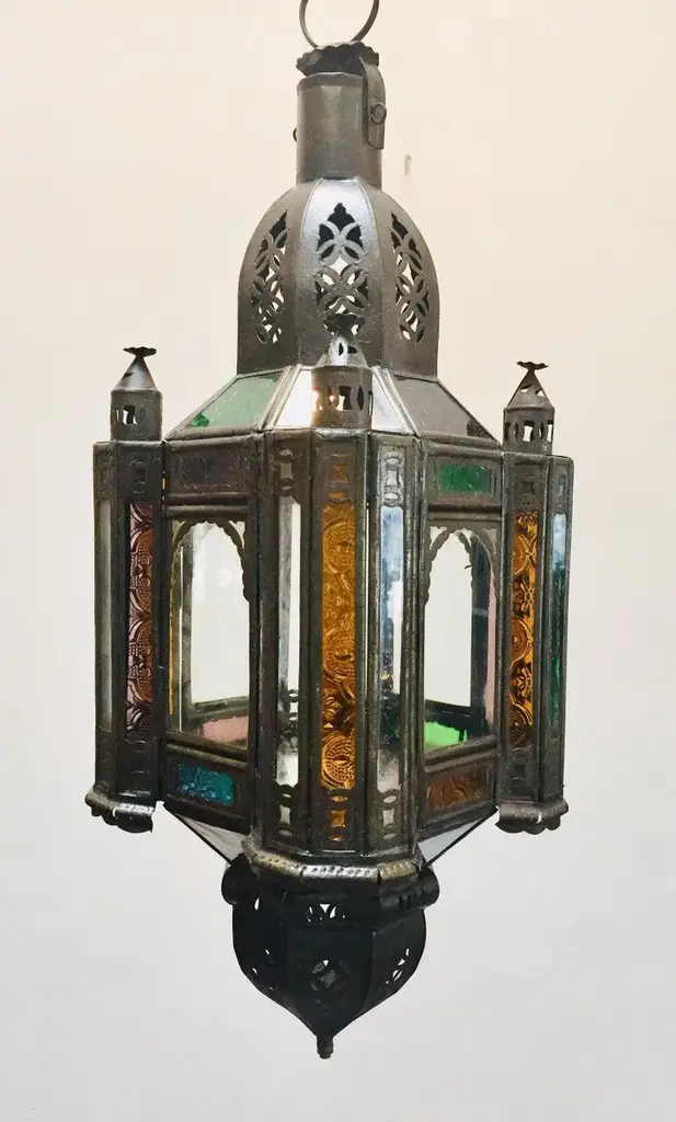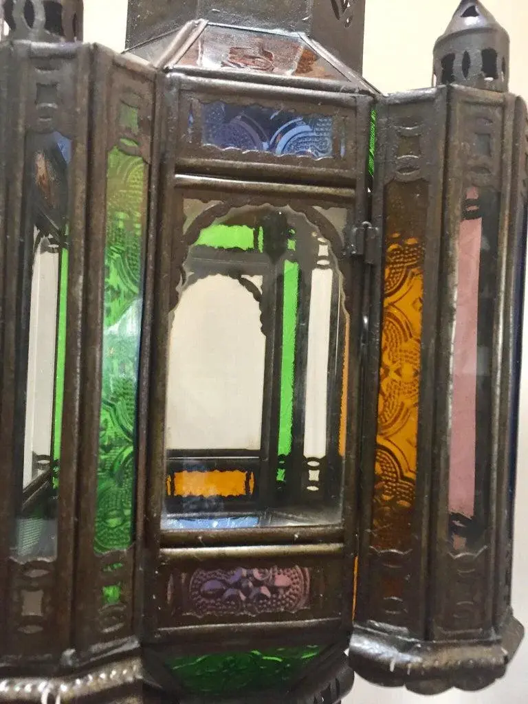 Stylish handcrafted Moroccan lantern pendant with multi-color molded glass and metal with an antique bronze finish. Handmade with small cut-glass with Moorish filigree metal designs. For indoor or covered area use. Dimensions: Height: 18 in Width: 6.5 in Depth: 6.5 in. About the Moroccan lanterns: The metal and glass handcrafted lantern from Morocco is a captivating pieces of artistry that combines the rich cultural heritage and exquisite craftsmanship of the region. Its design reflects the traditional Moroccan style, which is renowned for its intricate detailing and vibrant aesthetic. This vintage Moroccan lantern is meticulously handcrafted using a combination of metal and glass, resulting in a stunning blend of materials that enhances its overall beauty. The framework of the Moorish lantern is skillfully constructed from metal which provides a sturdy foundation and intricate patterns. The metalwork adorning the Moroccan light fixture features intricate filigree patterns, geometric motifs, and delicate scrollwork, all meticulously hand-cut by skilled Moroccan artisans in Marrakech. These ornate Moorish designs create mesmerizing shadows when the Moroccan hanging lantern is illuminated, casting enchanting patterns that dance across the surroundings. The glass components of the Moroccan lantern add a touch of elegance and brilliance to its appearance. Clear and multicolor glass panels are carefully inserted into the metal framework. These panels may showcase traditional Moroccan geometric Islamic designs. When the Moroccan lantern is lit from within, the glow emanating through the colorful glass panels transforms the surrounding space into a warm and inviting atmosphere. The interplay of light and shadow created by the intricate metalwork and the translucent glass adds depth and allure to the lantern's overall charm. The craftsmanship of this Moroccan light fixture is a testament to the dedication and skill of the artisans who meticulously handcraft each piece. The attention to detail, the artistic flair, and the fusion of metal and glass make this Moroccan lantern a true work of art, capturing the essence of Moroccan culture and heritage. Whether displayed as a centerpiece or hung from a hook, this metal and glass handcrafted lantern from Morocco effortlessly evokes a sense of enchantment, transporting you to the vibrant streets and magical ambiance of Moroccan nights.