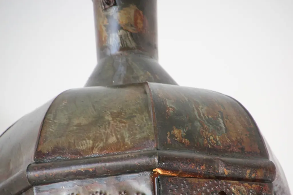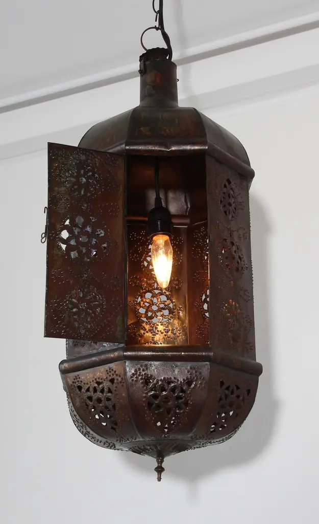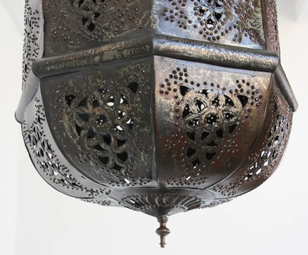 Moroccan handcrafted metal lantern pendant.Amazing Moorish light fixture hand-pierced with thousands of small holes to diffuse the light through.Handmade of metal open work with dark bronze rust patina.Very light metal lantern.Handcrafted by skilled artisans in Morocco, North Africa.Ready to use rewired use with a 60-watt maximum light bulb.Dimensions without chains.( chains could be adjusted to your needs)Height: 32 in. (81.28 cm)Width: 14 in. (35.56 cm)Depth: 14 in. (35.56 cm)For indoor or covered area use only.