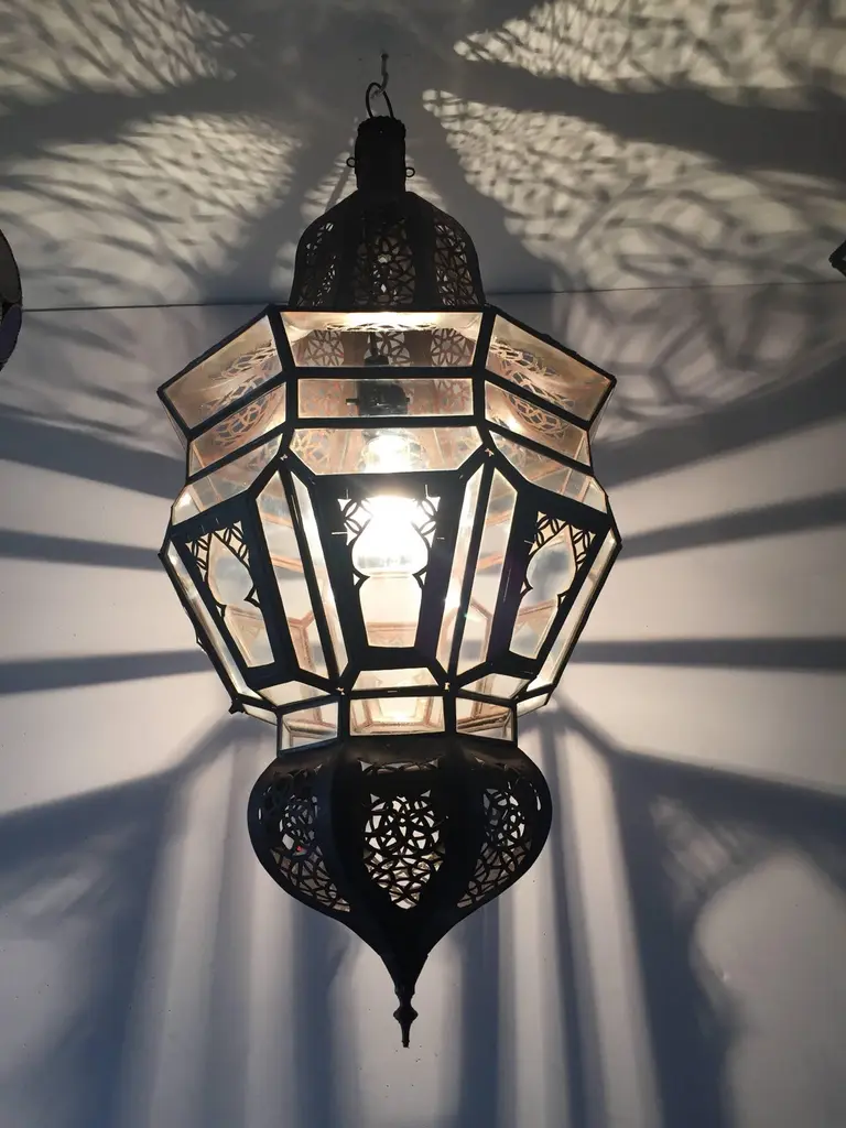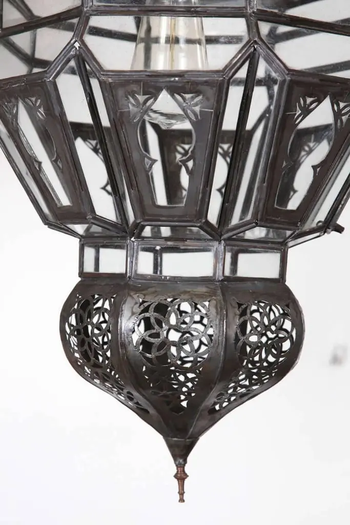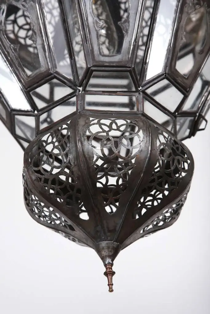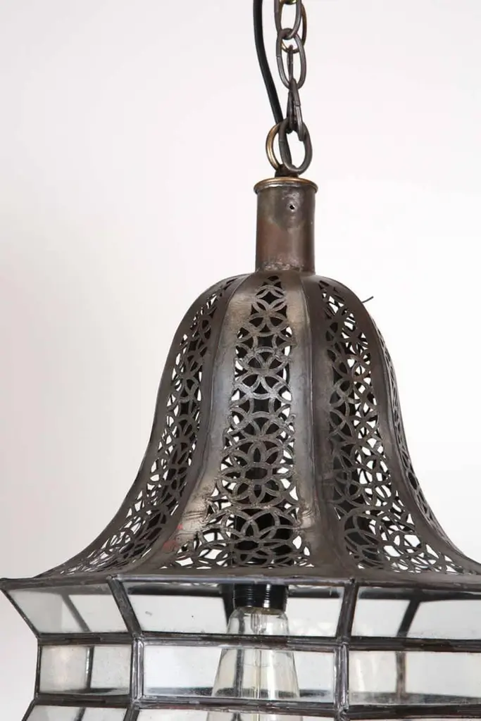 Moroccan Moorish clear glass with intricate metal filigree hanging chandelier. Delicately handcrafted by artisans in Morocco. Bronze metal color finish and clear glass. This Moorish Harem pendant chandelier will add style to any Moroccan or Mediterranean decor.Single light source one socket up to 60 watt max. Comes with 3 feet chains and canopy, chains could be adjusted to your needs.