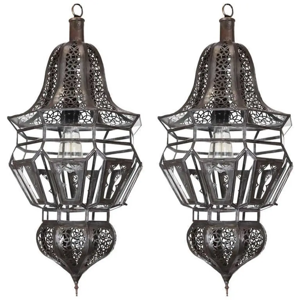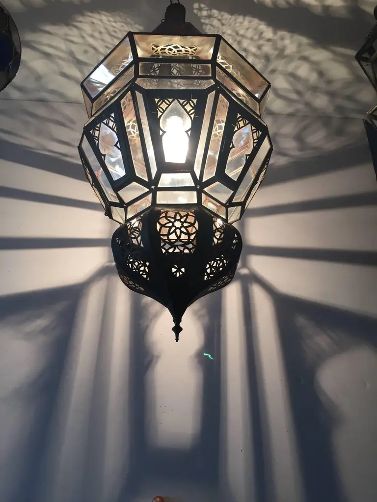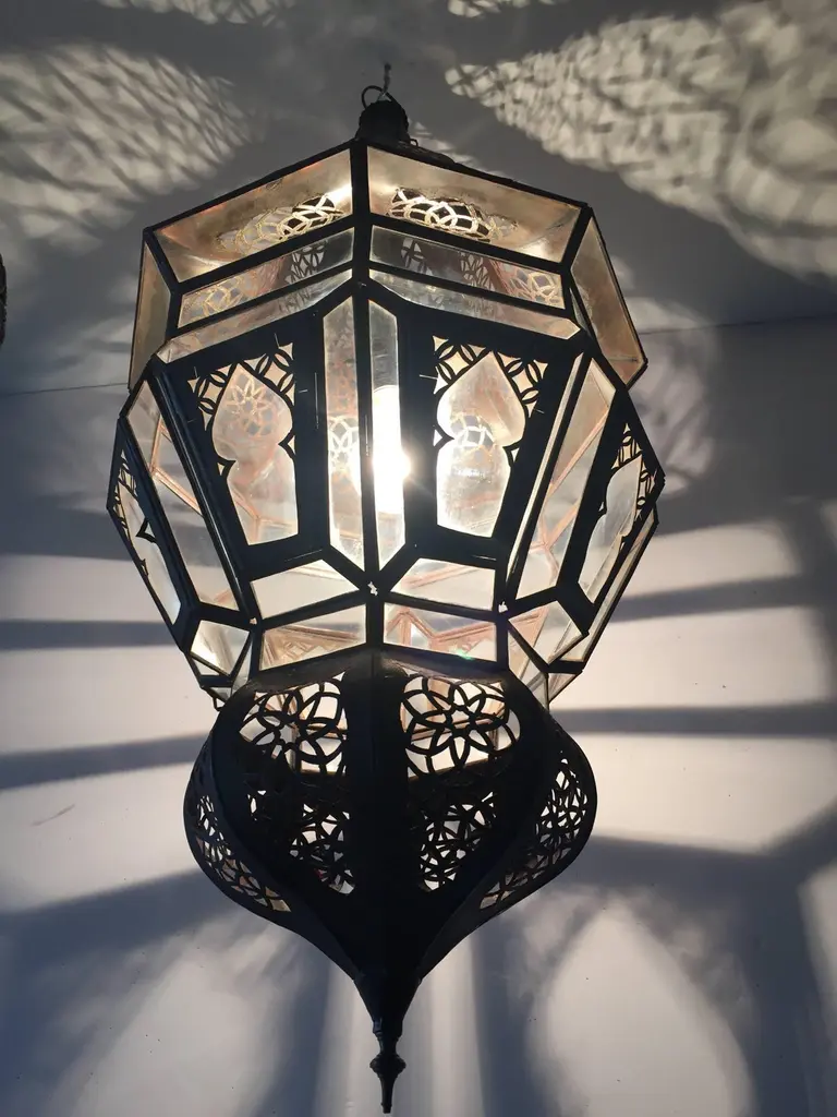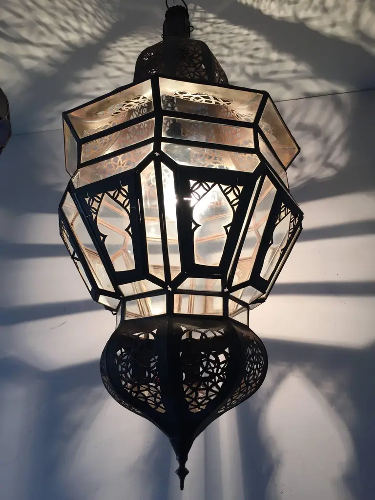 Moroccan Moorish clear glass with intricate metal filigree hanging chandelier. Delicately handcrafted by artisans in Morocco. Bronze metal color finish and clear glass. This Moorish Harem pendant chandelier will add style to any Moroccan or Mediterranean decor.Single light source one socket up to 60 watt max. Comes with 3 feet chains and canopy, chains could be adjusted to your needs.