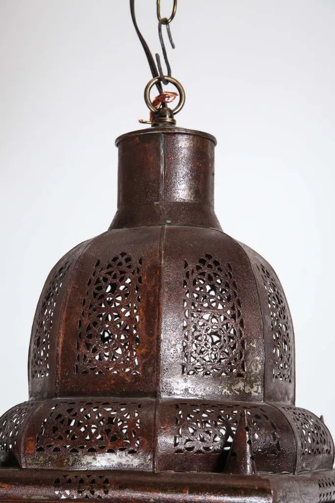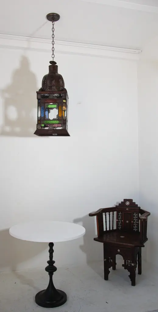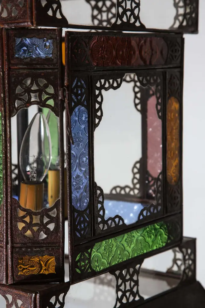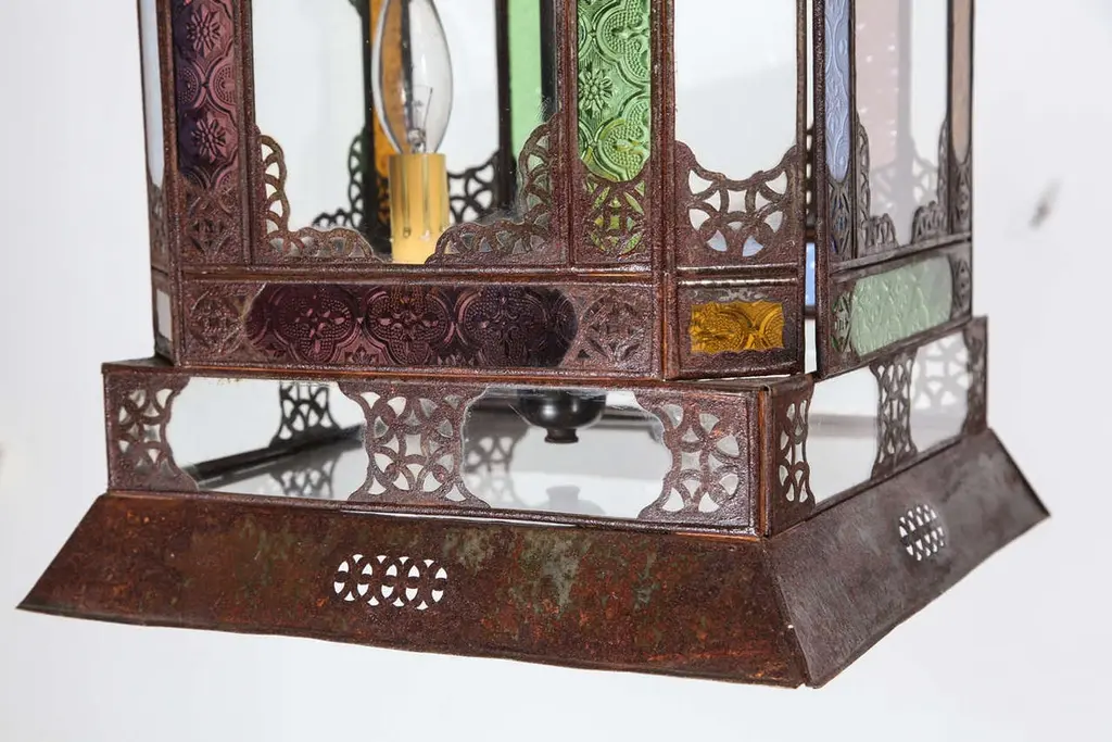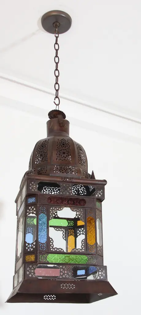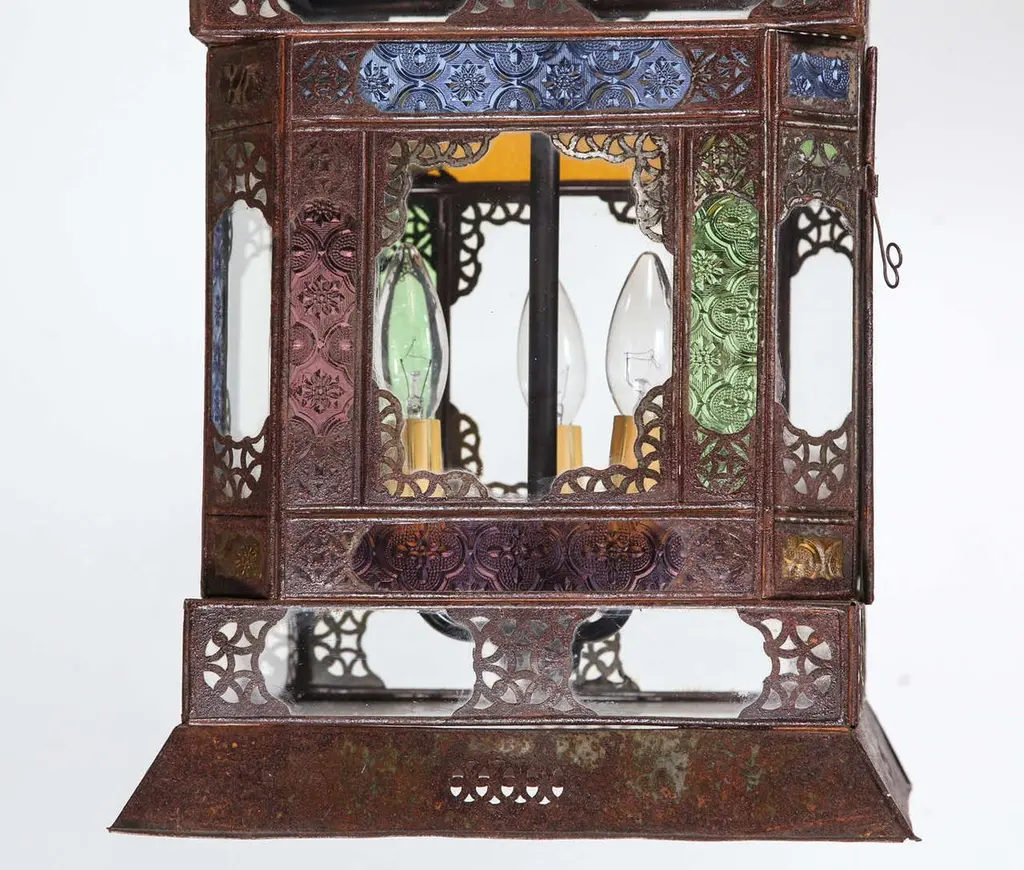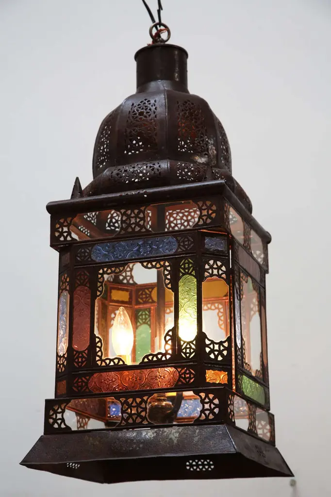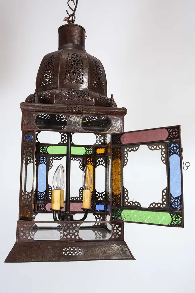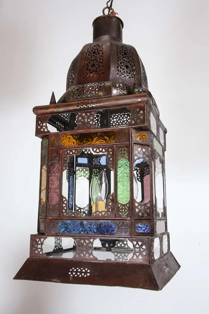 Very nice craftsmanship Moroccan glass light fixture, could be used as a table lamp or hanging light fixture. Multicolored glass in blue, green, amber and purple, Moorish arches on each side, adorned with filigree design, clear glass in the bottom. Unusual Moroccan Moorish square handcrafted metal and glass lantern. Metal is finished in bronze rust color patina. Wired with 3 lights and ready to use with 3 feet chains and canopy. DimensionsHeight: 26 in. (66.04 cm)Width: 12 in. (30.48 cm)Depth: 12 in. (30.48 cm) For indoor use or covered area use only.About the Moroccan lanterns:The metal and glass hand-crafted lantern from Morocco is a captivating pieces of artistry that combines the rich cultural heritage and exquisite craftsmanship of the region. Its design reflects the traditional Moroccan style, which is renowned for its intricate detailing and vibrant aesthetic. This vintage Moroccan lantern is meticulously handcrafted using a combination of metal and glass, resulting in a stunning blend of materials that enhances its overall beauty. The framework of the Moorish lantern is skillfully constructed from metal which provides a sturdy foundation and intricate patterns. The metalwork adorning the Moroccan light fixture features intricate filigree patterns, geometric motifs, and delicate scrollwork, all meticulously hand-cut by skilled Moroccan artisans in Marrakech. These ornate Moorish designs create mesmerizing shadows when the Moroccan hanging lantern is illuminated, casting enchanting patterns that dance across the surroundings. The glass components of the Moroccan lantern add a touch of elegance and brilliance to its appearance. Clear and multicolor glass panels are carefully inserted into the metal framework. These panels may showcase traditional Moroccan geometric Islamic designs. When the Moroccan lantern is lit from within, the glow emanating through the colorful glass panels transforms the surrounding space into a warm and inviting atmosphere. The interplay of light and shadow created by the intricate metalwork and the translucent glass adds depth and allure to the lantern's overall charm. The craftsmanship of this Moroccan light fixture is a testament to the dedication and skill of the artisans who meticulously handcraft each piece. The attention to detail, the artistic flair, and the fusion of metal and glass make this Moroccan lantern a true work of art, capturing the essence of Moroccan culture and heritage. Whether displayed as a centerpiece or hung from a hook, this metal and glass handcrafted lantern from Morocco effortlessly evokes a sense of enchantment, transporting you to the vibrant streets and magical ambiance of Moroccan nights.