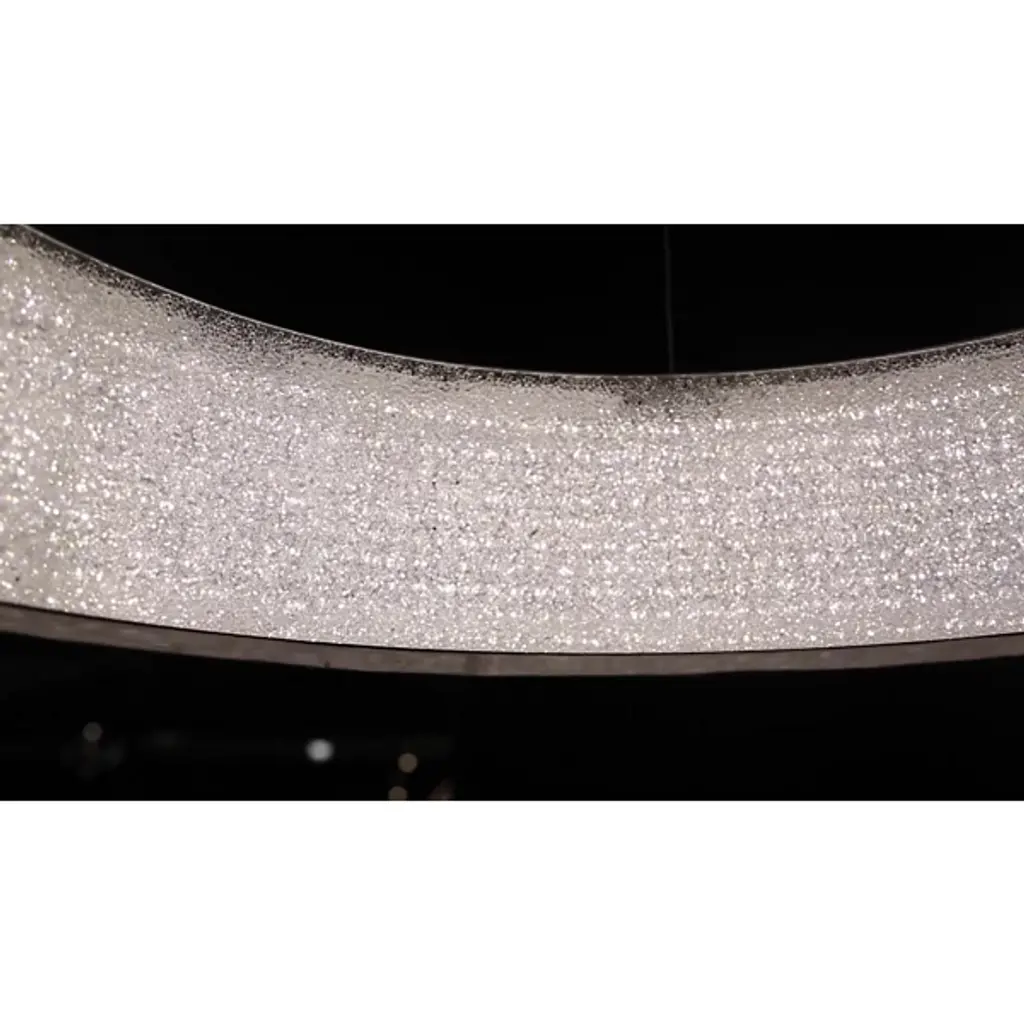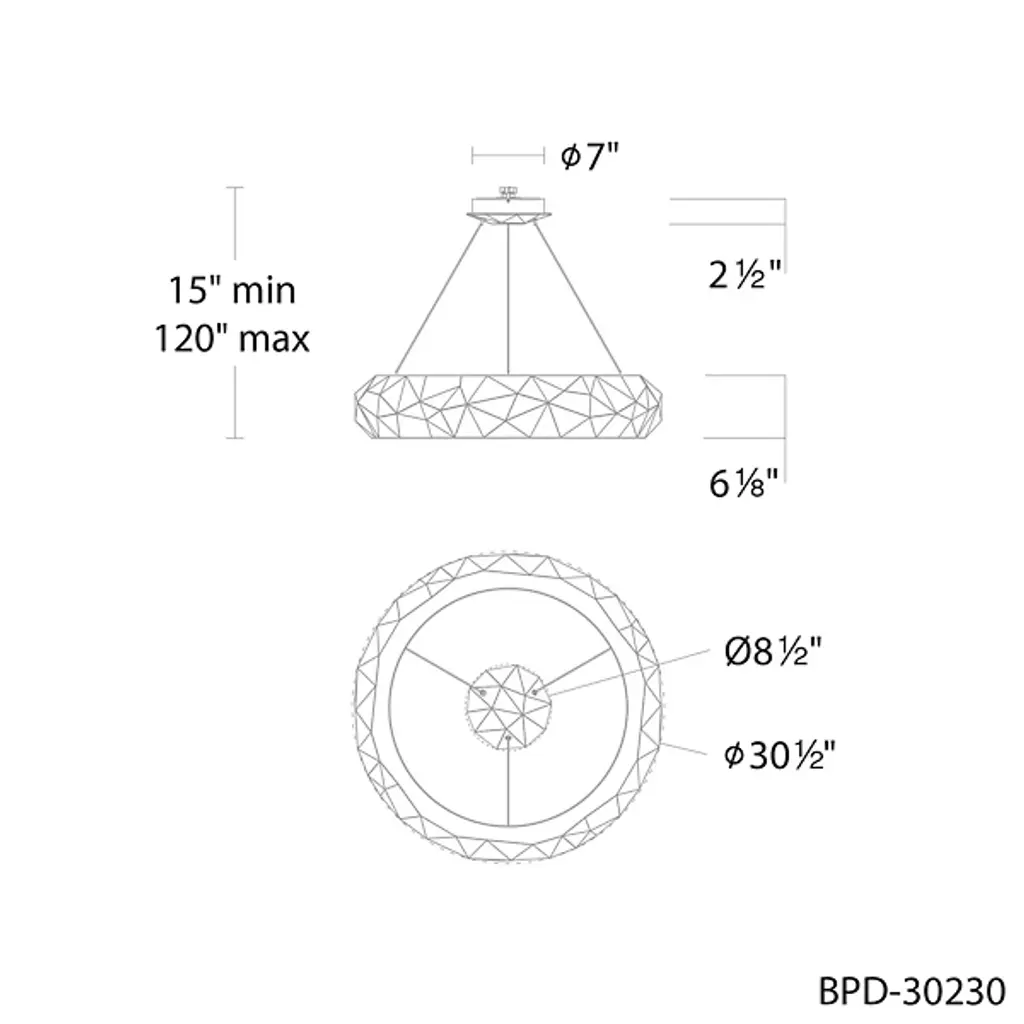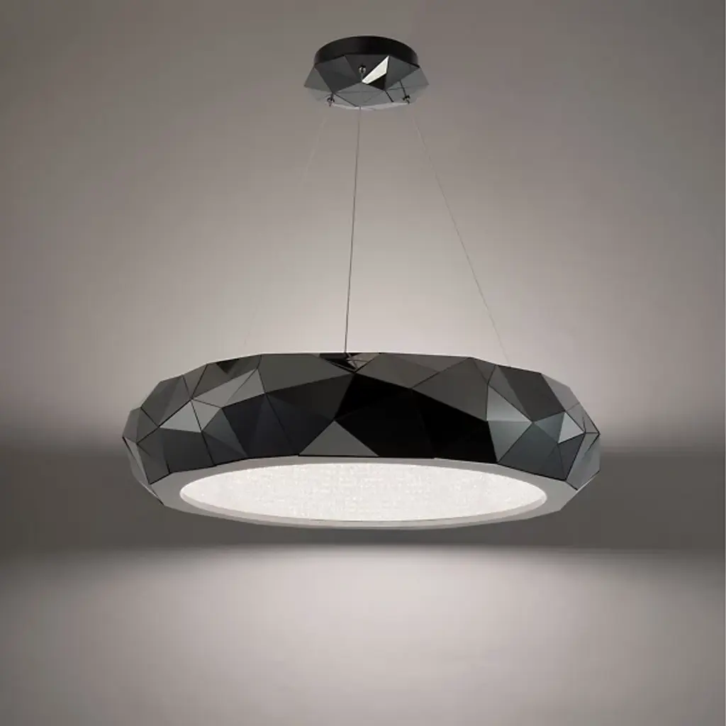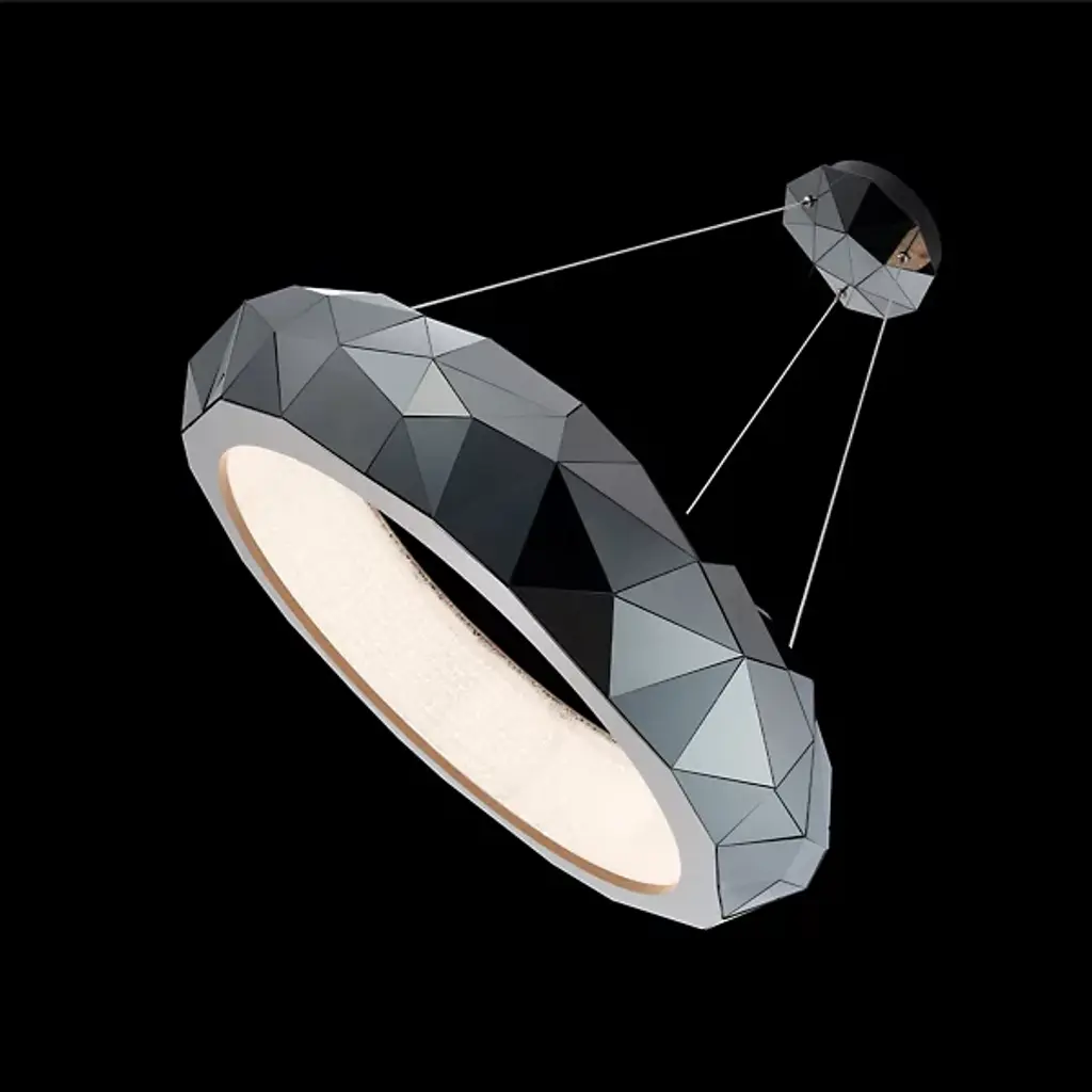 Bring a clever contemporary addition to inside spaces with the fabulous, faceted shape of the Mosaic LED Pendant Light from Schonbek Beyond. A captivating contemporary design retained by a round canopy surfaced with steel mosaic tiles, it dispatches three slender cables to LED lamping held inside a ring structure surfaced with the same smooth tiles. The damp-listed lamping can be adjusted for temperature when it is installed and is further moderated by a clear crystal diffuser tucked into the inside of the housing, pouring out a warm ambiance below the fixture that glitters off the smooth surface outside the fixture.