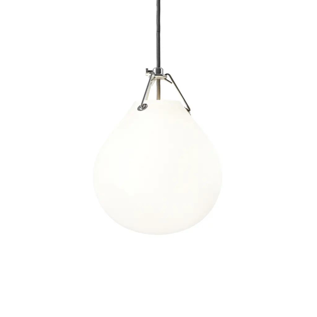The Moser Pendant was designed by Swedish ceramic artist, Anu Moser, in 2002. The designer drew inspiration for the various shapes in the light from observing how molten glass develops when you first start to blow it. The light was developed for energy-saving bulbs, and Anu Moser chose an enclosed drop shape to shield direct view of the light source 100%. The mounting mechanism is patented. Features