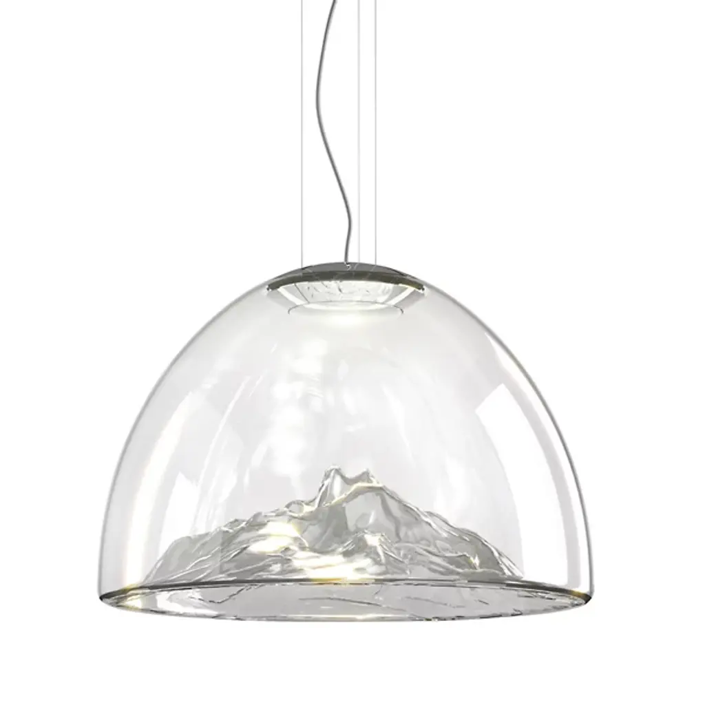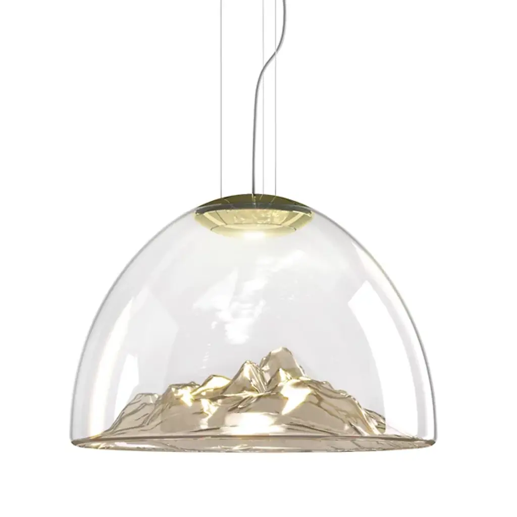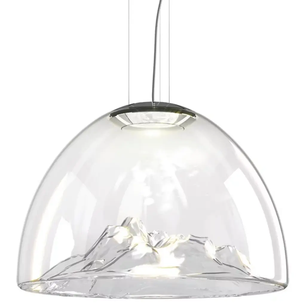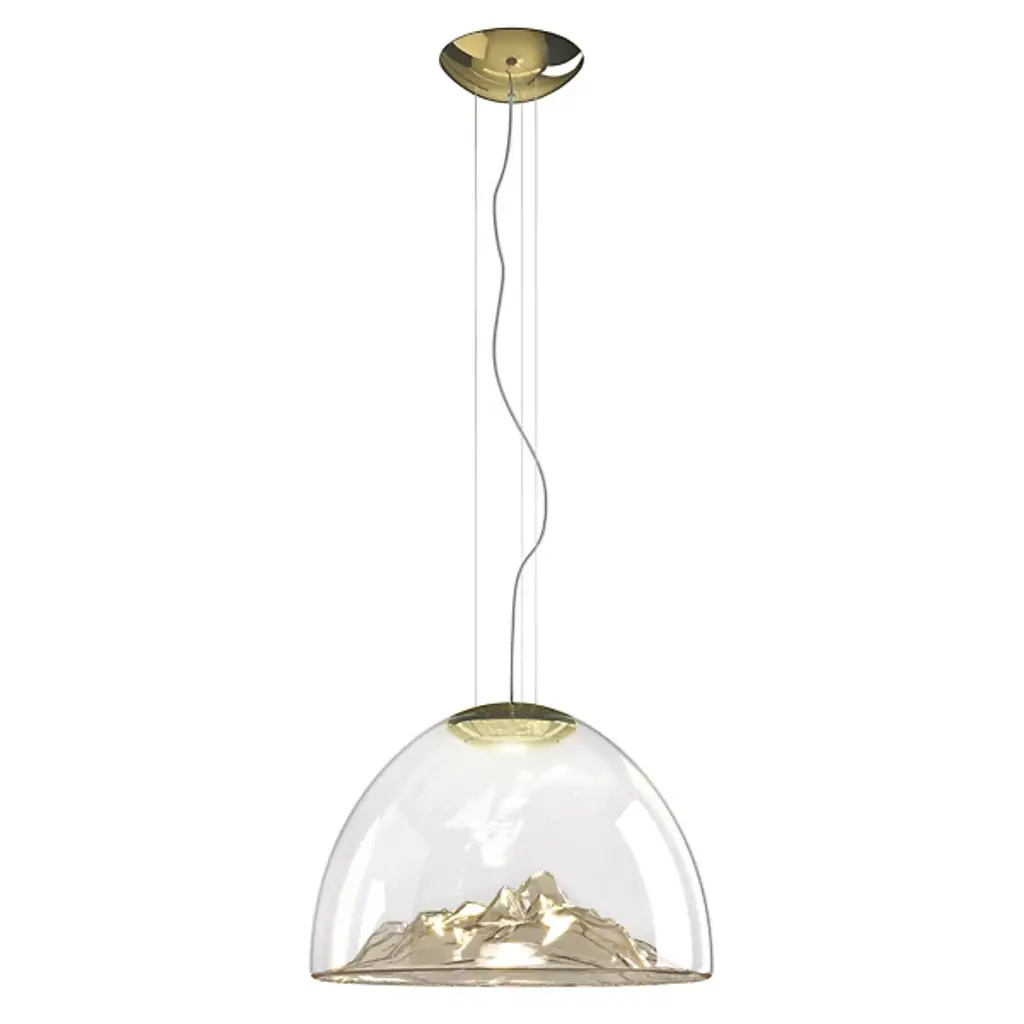 As light reaches the peaks of the Axo Light Mountain View LED Pendant, an awe-inspiring vista of blown-glass comes in to view, sparkling from the warm light source above. Incredibly skilled craftsmen produce the fixture from a single piece of glass, seamlessly executing this purely decorative design by Dima Loginoff. The topography of the small mountain range changes with every view of the dome enclosure, which is made more dramatic by the LED light focused directly above. Left clear or tinted with translucent Amber or Grey, each rocky formation artfully diffuses the light with stunning effects.