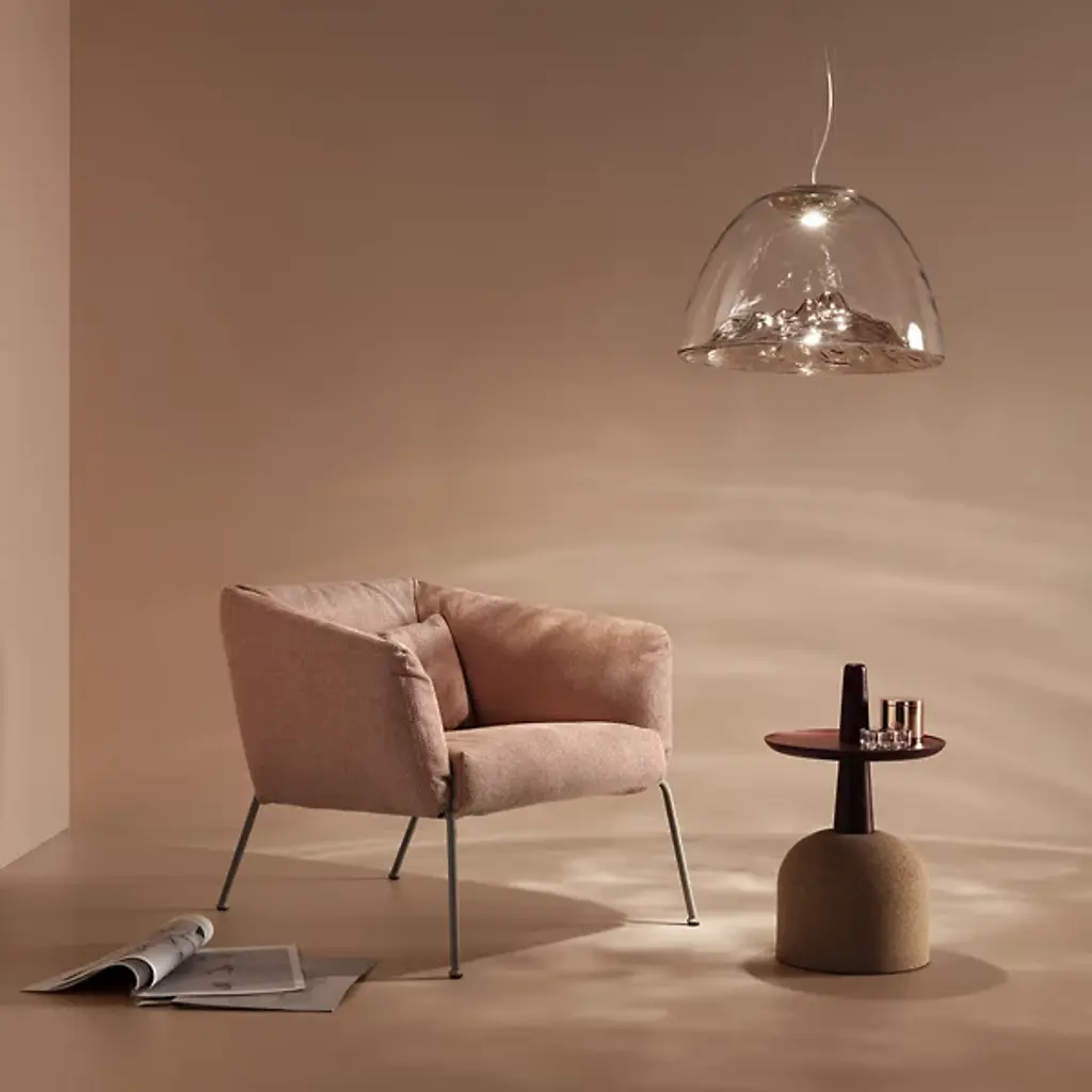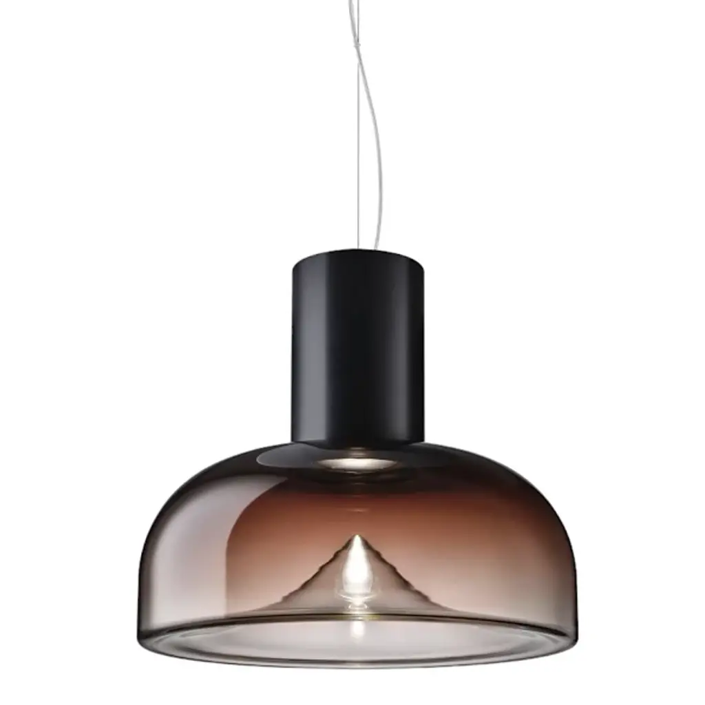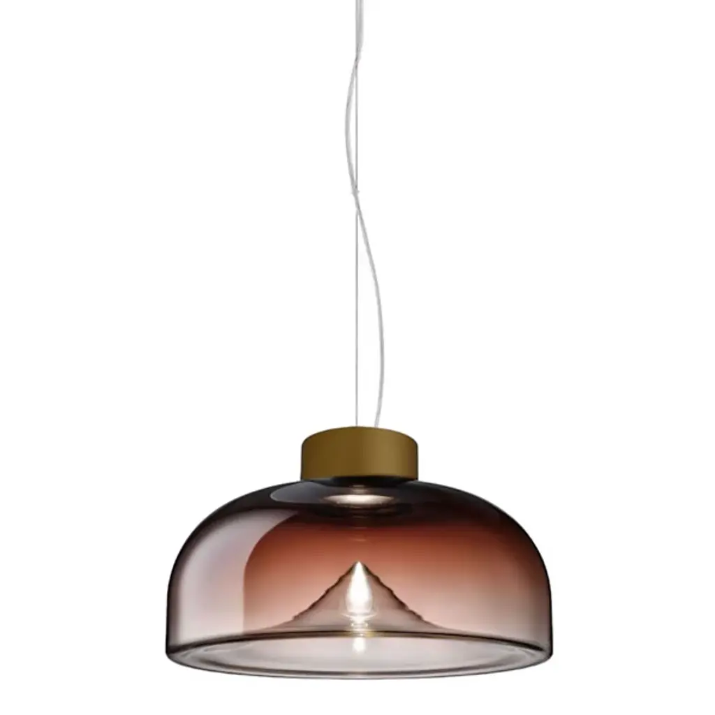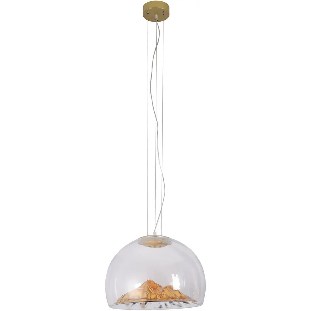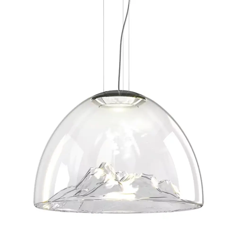 As light reaches the peaks of the Axo Light Mountain View LED Pendant, an awe-inspiring vista of blown-glass comes in to view, sparkling from the warm light source above. Incredibly skilled craftsmen produce the fixture from a single piece of glass, seamlessly executing this purely decorative design by Dima Loginoff. The topography of the small mountain range changes with every view of the dome enclosure, which is made more dramatic by the LED light focused directly above. Left clear or tinted with translucent Amber or Grey, each rocky formation artfully diffuses the light with stunning effects.