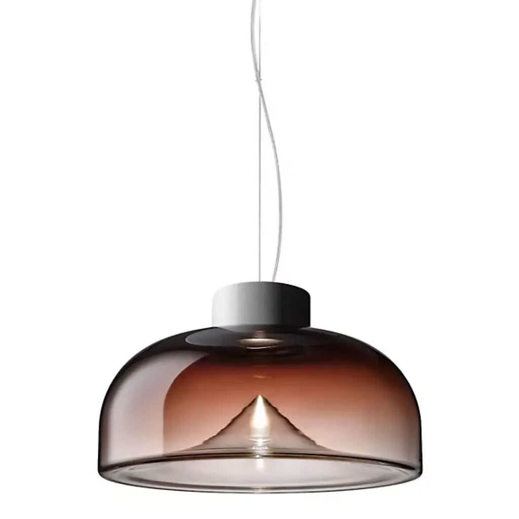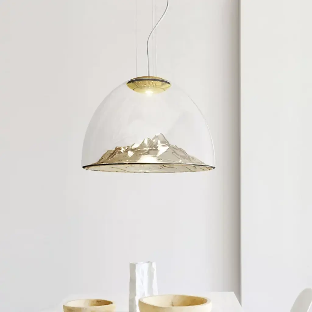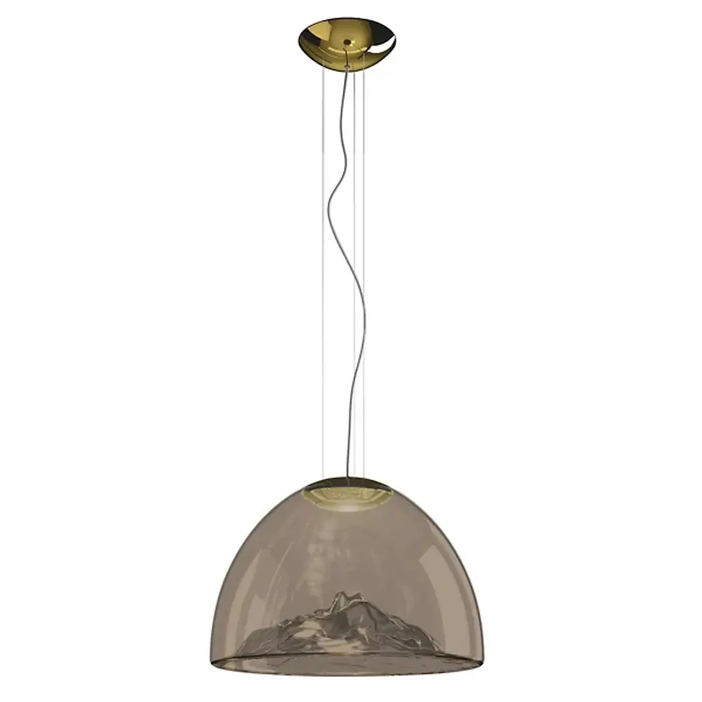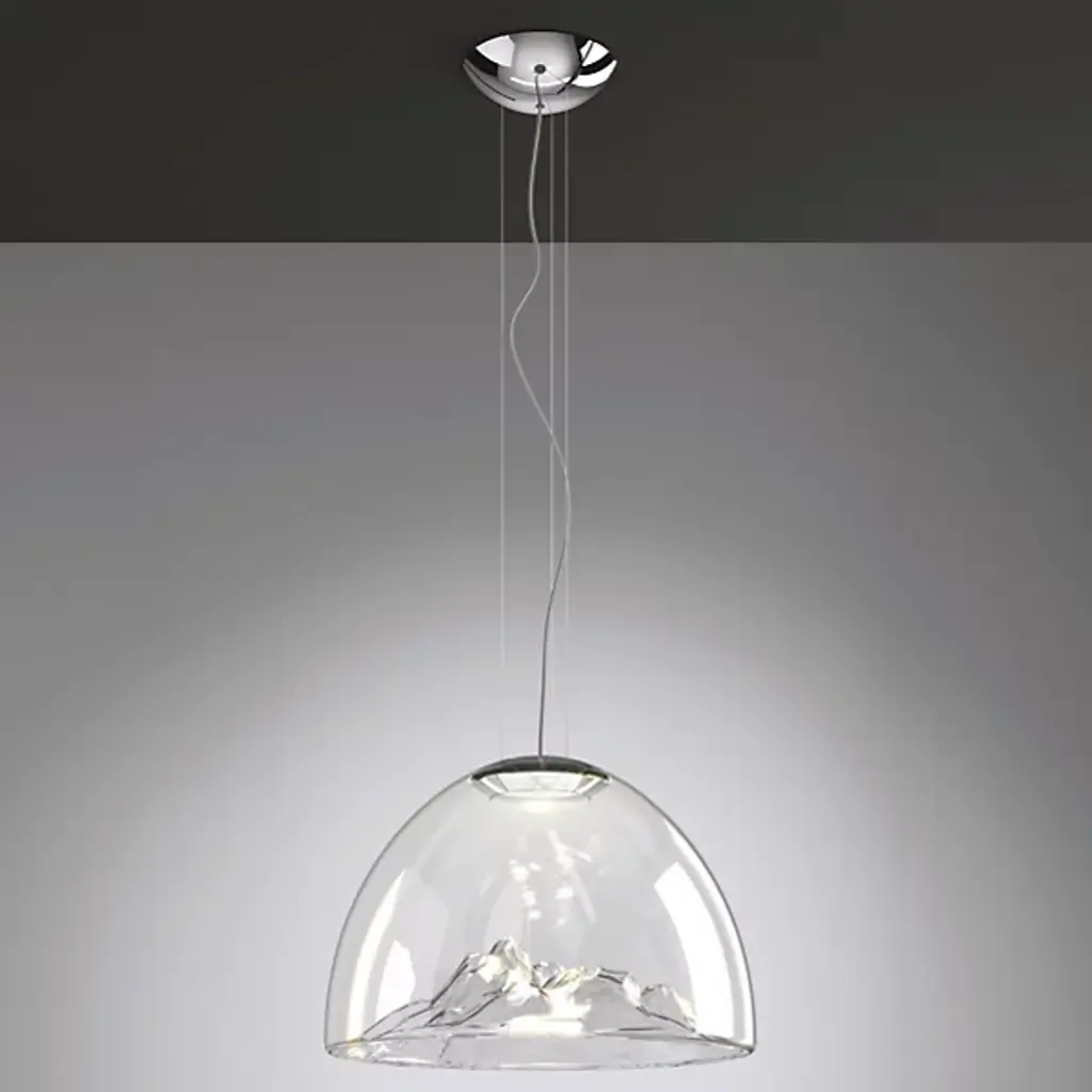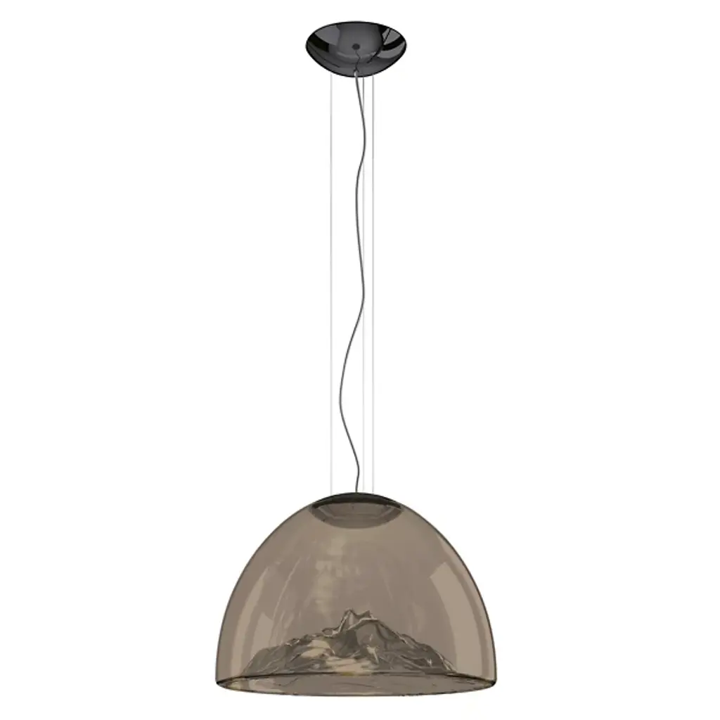 As light reaches the peaks of the Axo Light Mountain View LED Pendant, an awe-inspiring vista of blown-glass comes in to view, sparkling from the warm light source above. Incredibly skilled craftsmen produce the fixture from a single piece of glass, seamlessly executing this purely decorative design by Dima Loginoff. The topography of the small mountain range changes with every view of the dome enclosure, which is made more dramatic by the LED light focused directly above. Left clear or tinted with translucent Amber or Grey, each rocky formation artfully diffuses the light with stunning effects.