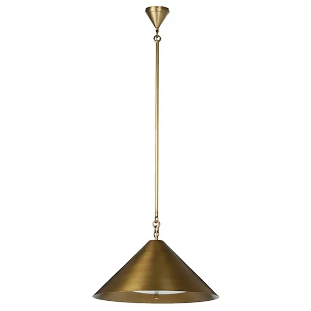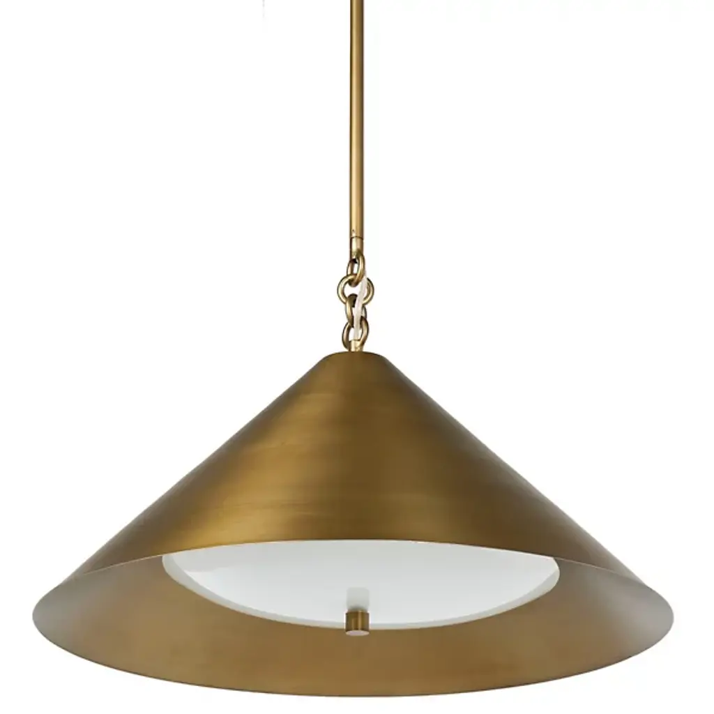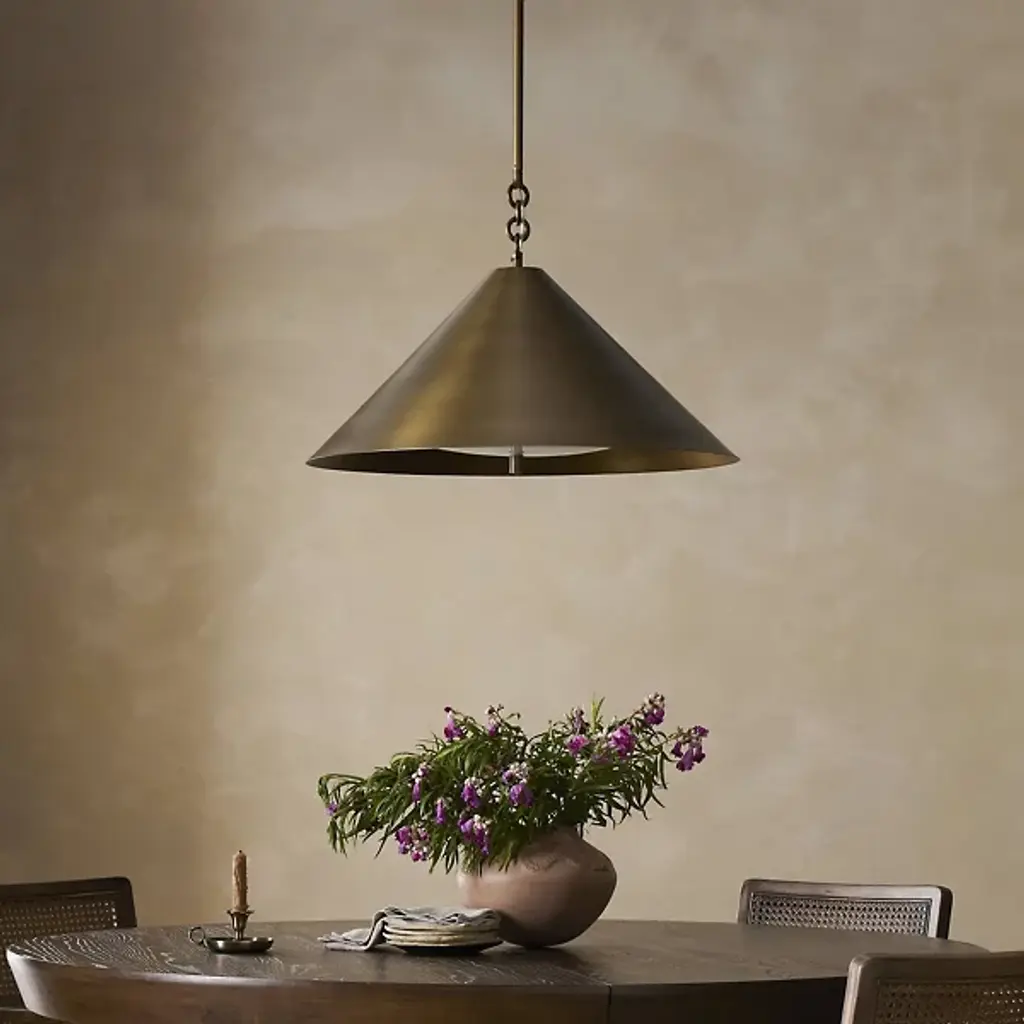 The Mozelle Pendant from Four Hands is a study in refined industrial chic. This fixture combines the warmth of aged brass with the cool sophistication of milk glass, creating a remarkable balance of elements. The tapered metal frame cradles the glass diffuser like a precious gem. Decorative pipes and rounded hooks add subtle nods to industrial aesthetics without overwhelming the design. The cone-shaped canopy echoes the shade's form, creating a cohesive profile.