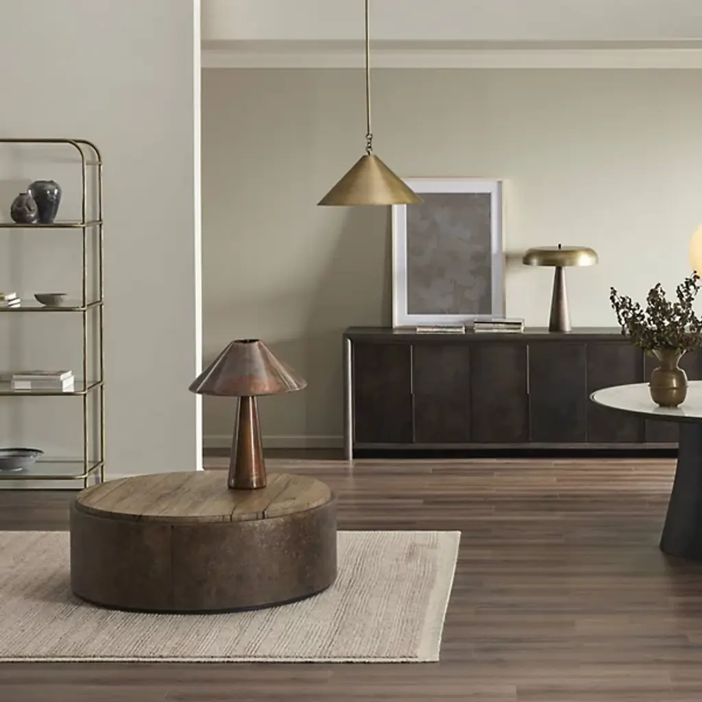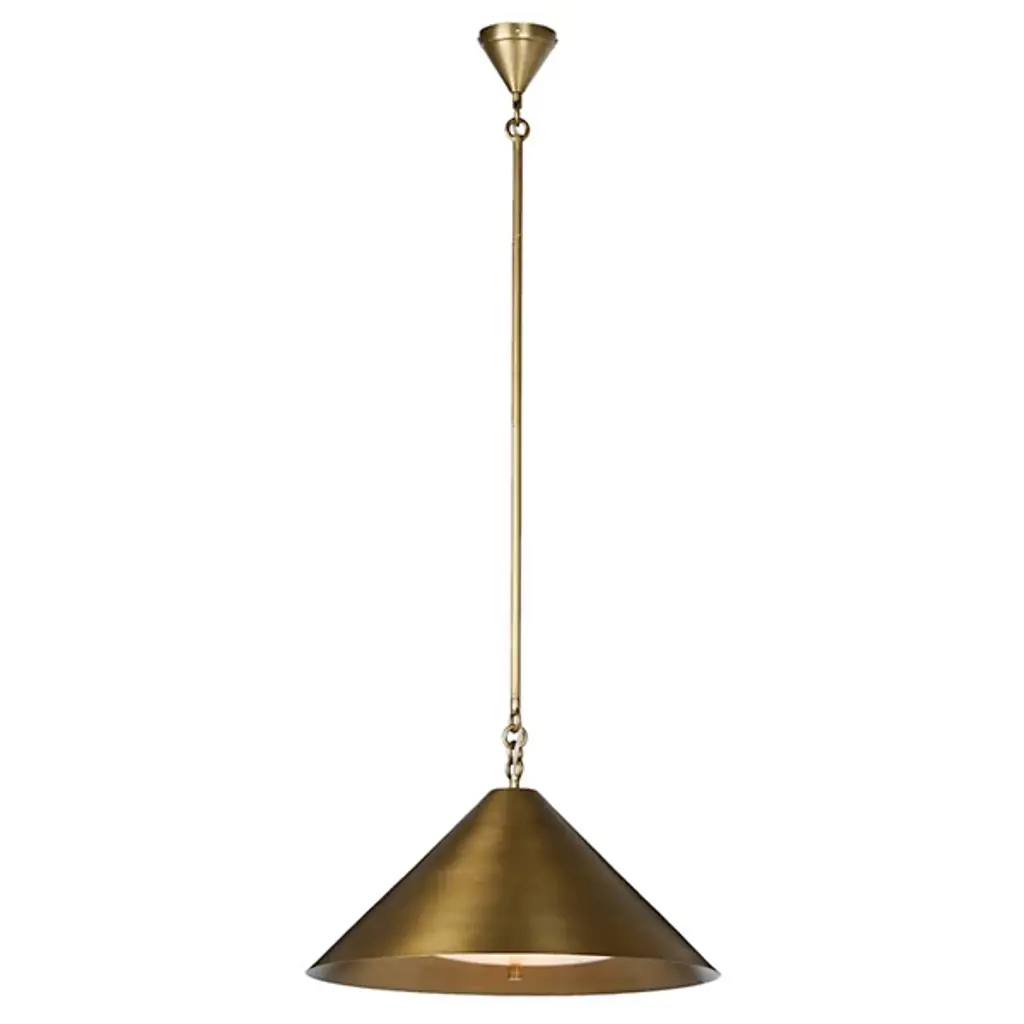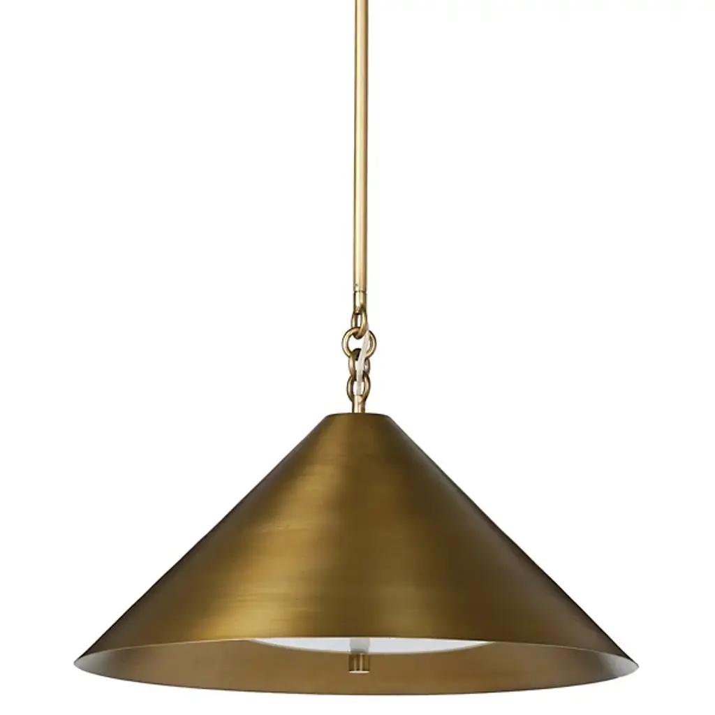 The Mozelle Pendant from Four Hands is a study in refined industrial chic. This fixture combines the warmth of aged brass with the cool sophistication of milk glass, creating a remarkable balance of elements. The tapered metal frame cradles the glass diffuser like a precious gem. Decorative pipes and rounded hooks add subtle nods to industrial aesthetics without overwhelming the design. The cone-shaped canopy echoes the shade's form, creating a cohesive profile.
