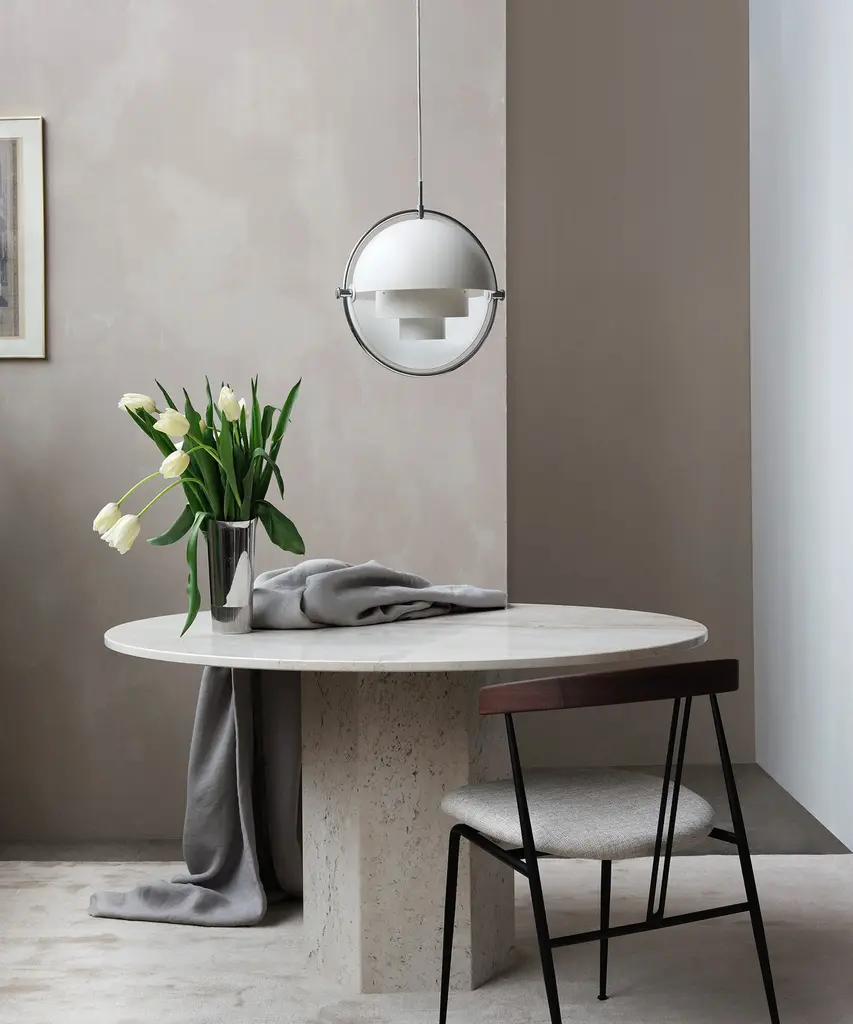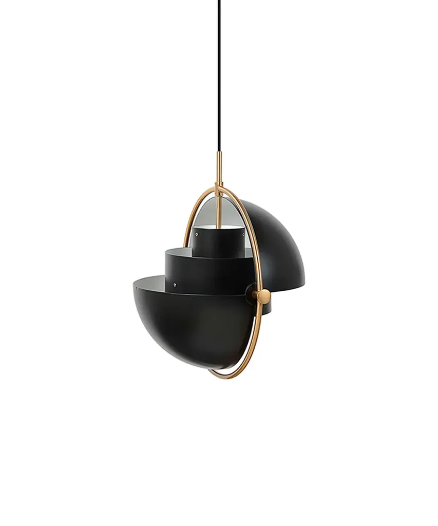 Designed in 1972, the Multi-Lite Pendant can be directed upwards, downwards or project an asymmetrical art light. Composed of two individual rotating shades, the Multi-Lite pendant and can be transformed into multiple combinations for different directionality. The lamp is available in several colors, but all the shades are white lacquered inside. The fixture is produced to the designer's original specifications by Danish design company Gubi.