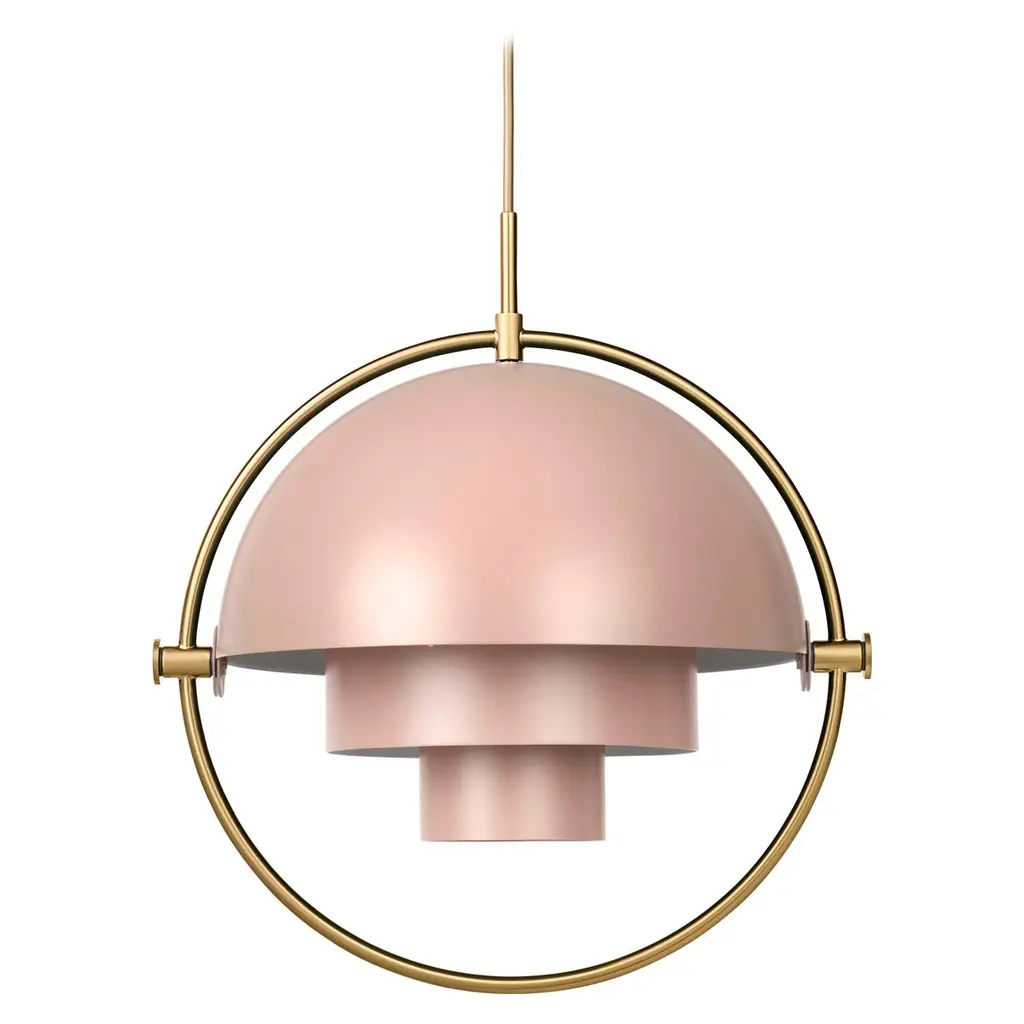 Designed in 1972, the Multi-Lite Pendant can be directed upwards, downwards or project an asymmetrical art light. Composed of two individual rotating shades, the Multi-Lite pendant and can be transformed into multiple combinations for different directionality. The lamp is available in several colors, but all the shades are white lacquered inside. The fixture is produced to the designer's original specifications by Danish design company Gubi.