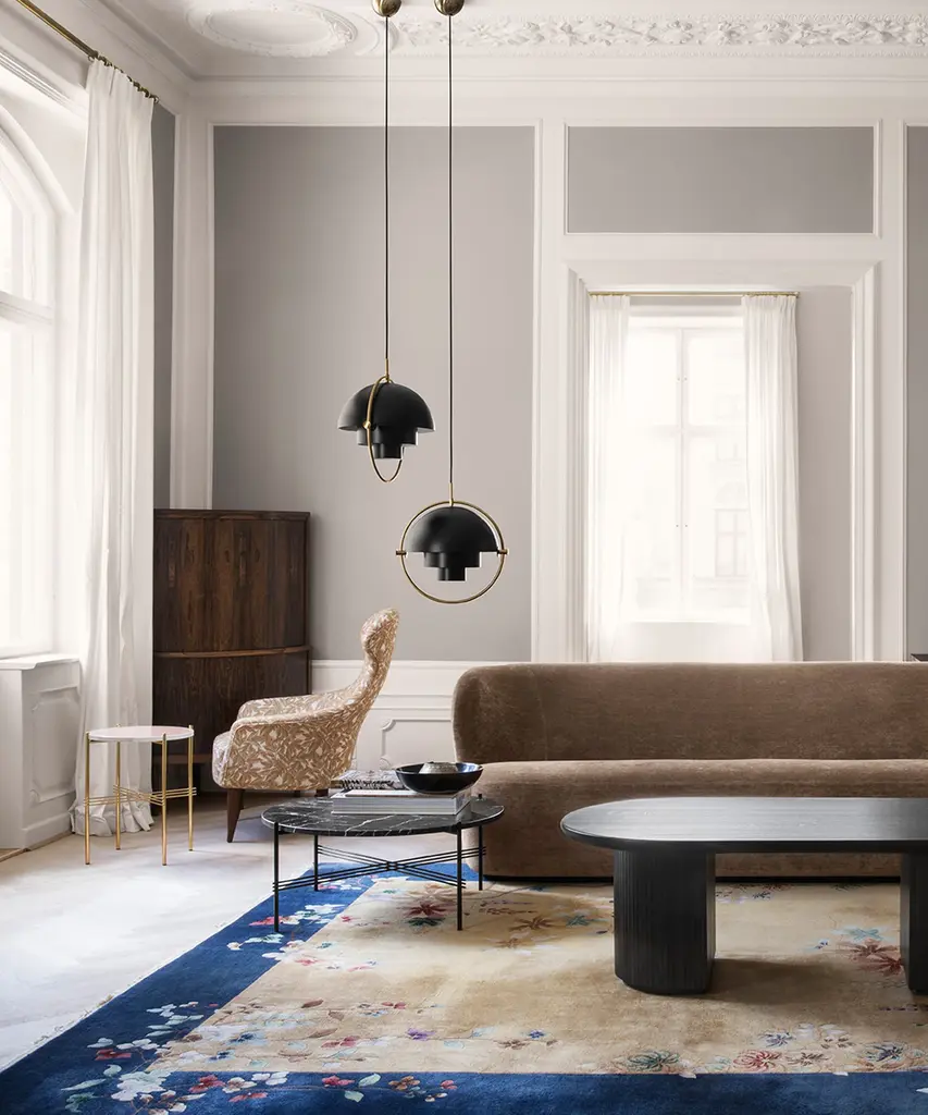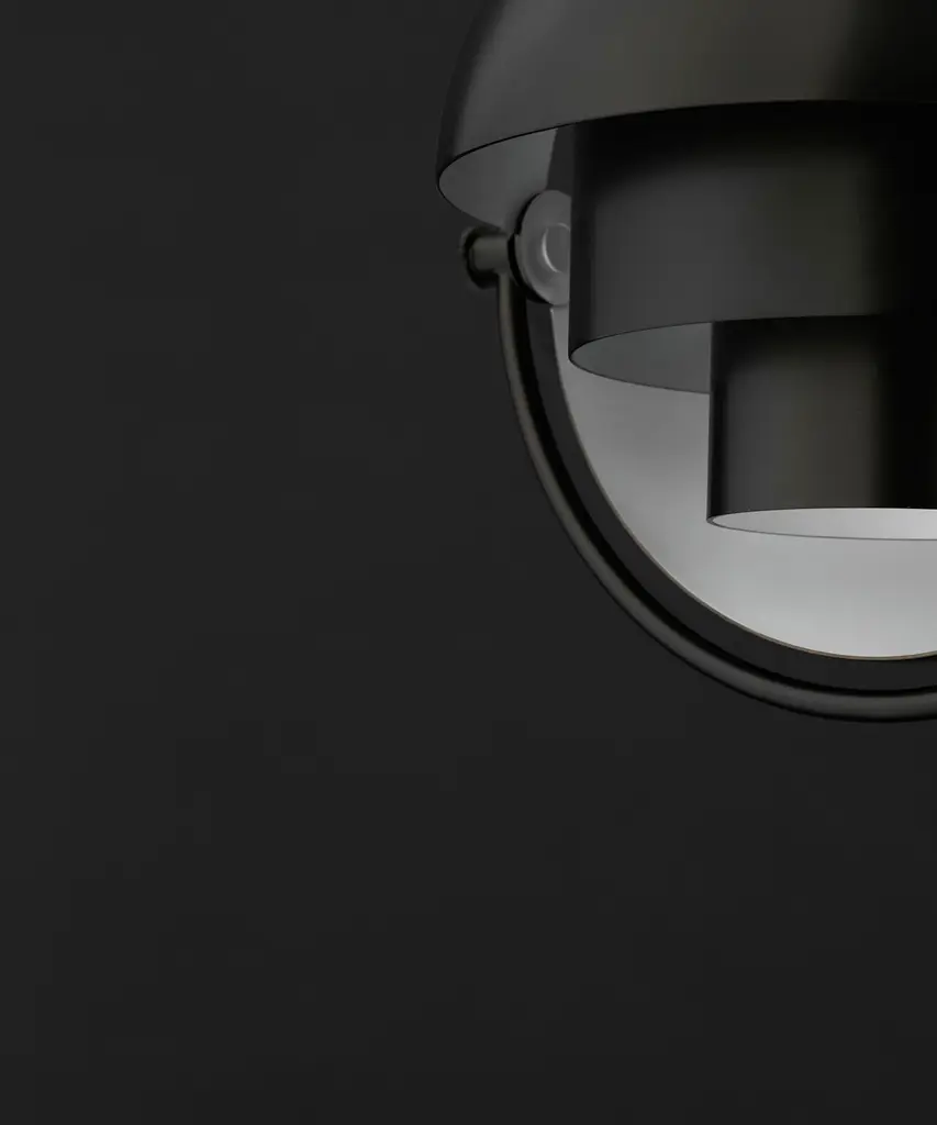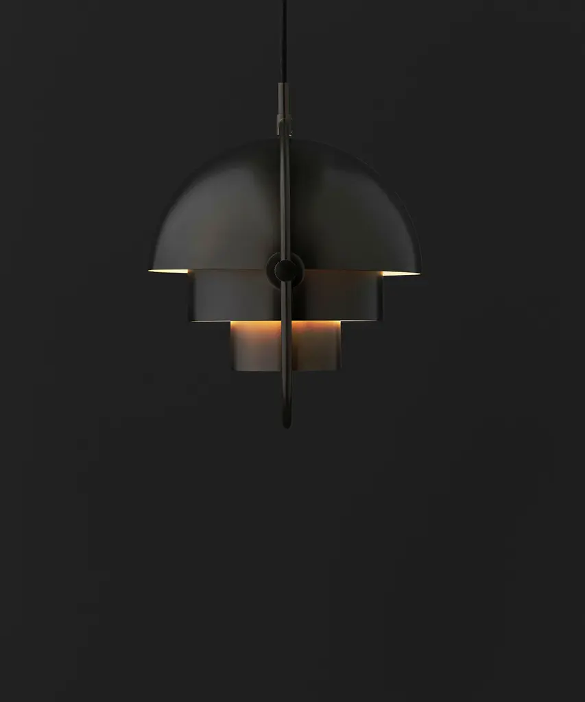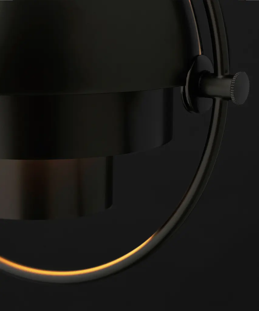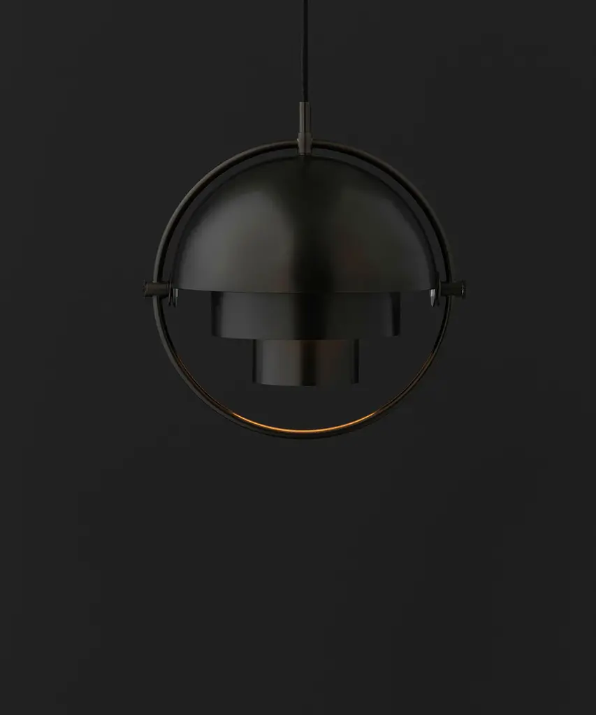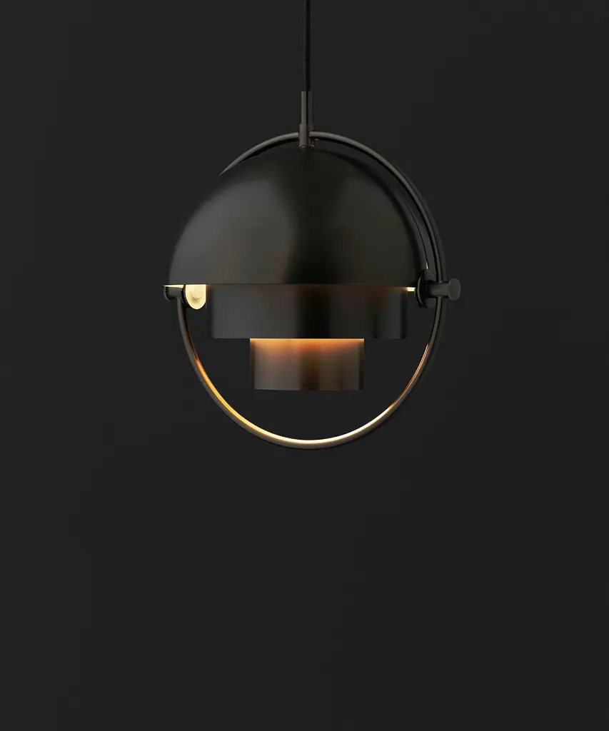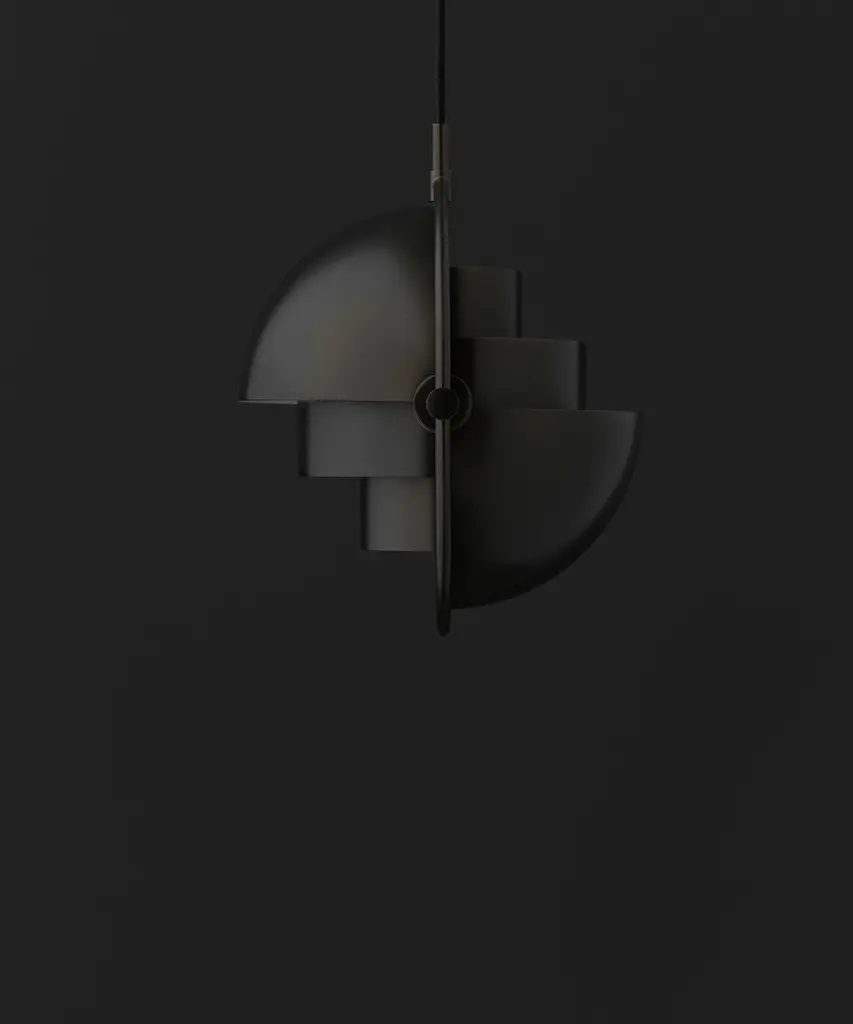 Designed in 1972, the Multi-Lite Pendant can be directed upwards, downwards or project an asymmetrical art light. Composed of two individual rotating shades, the Multi-Lite pendant and can be transformed into multiple combinations for different directionality. The lamp is available in several colors, but all the shades are white lacquered inside. The fixture is produced to the designer's original specifications by Danish design company Gubi.