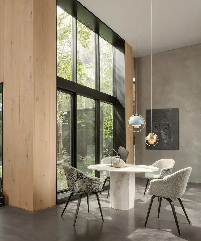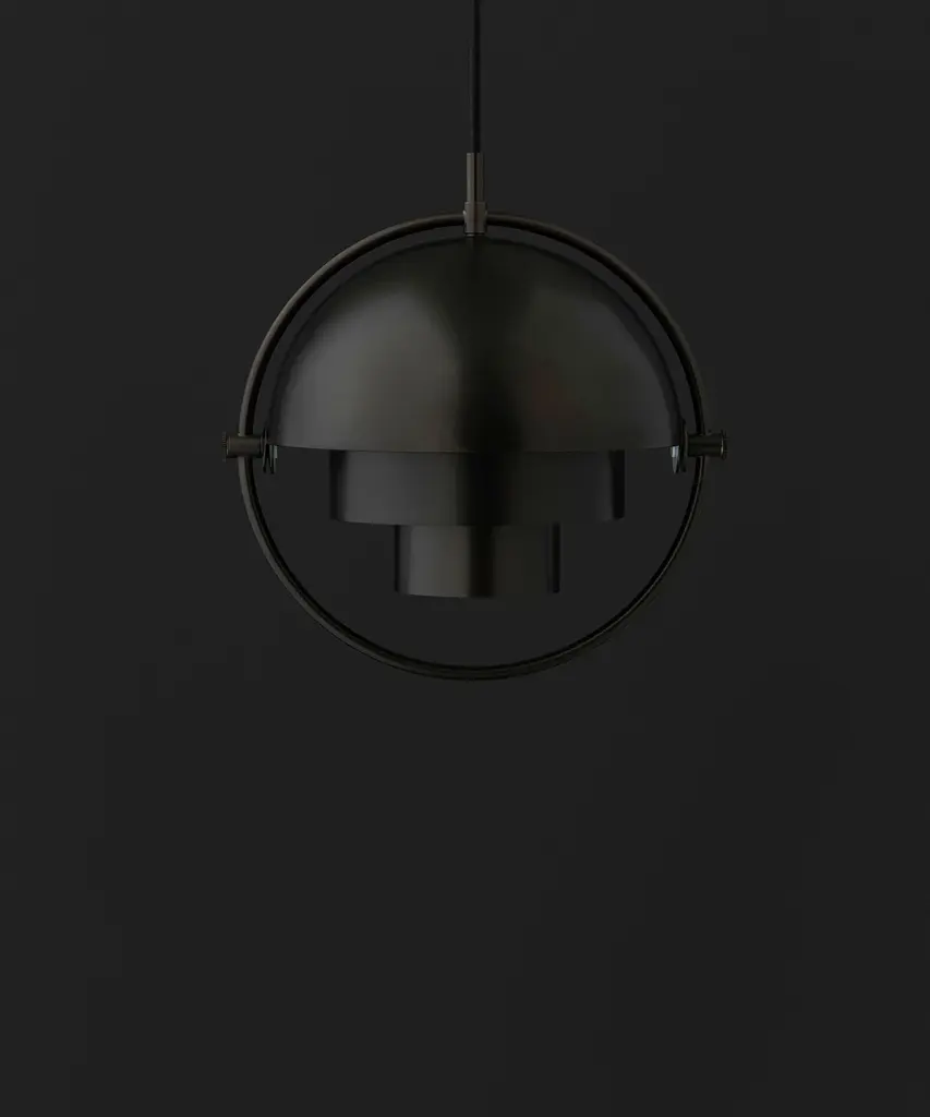 Designed in 1972, the Multi-Lite Pendant can be directed upwards, downwards or project an asymmetrical art light. Composed of two individual rotating shades, the Multi-Lite pendant and can be transformed into multiple combinations for different directionality. The lamp is available in several colors, but all the shades are white lacquered inside. The fixture is produced to the designer's original specifications by Danish design company Gubi.