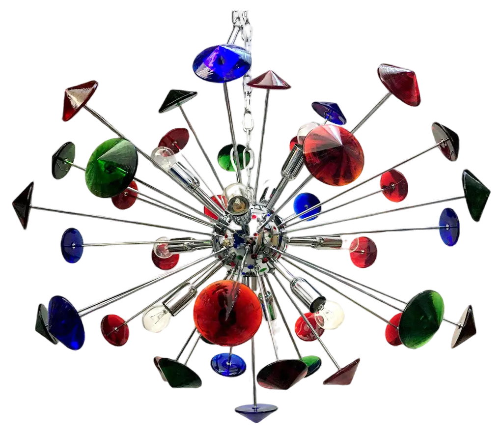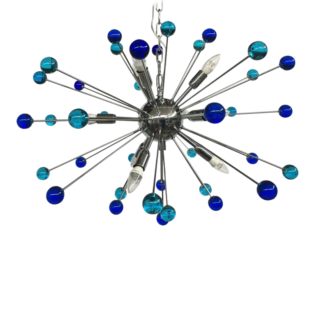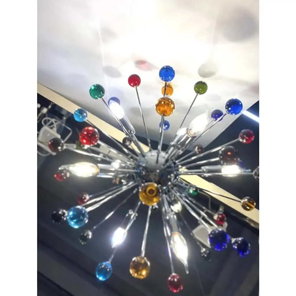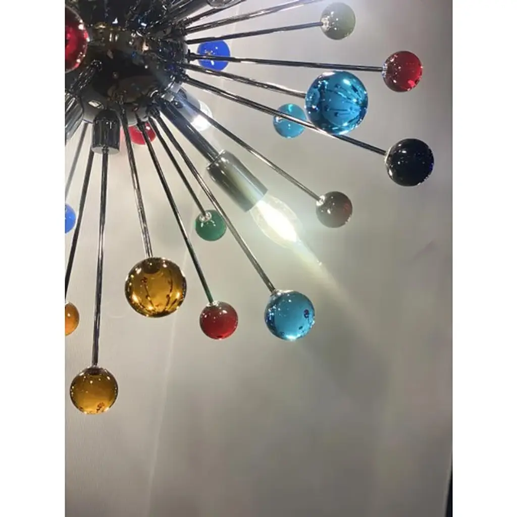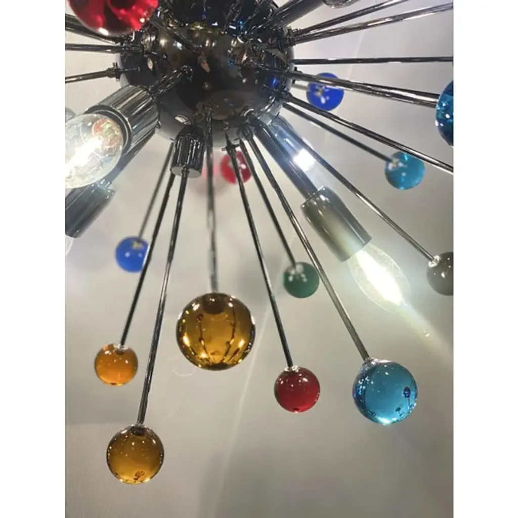 Multicolor “spheres” murano glass sputnik chandelier. little “spheres” elements of murano glass , compose a very lively and bright chandelier. entirely made in italy, fruit of murano glass of high italian know-how . metal frame in chrome plating bath. spare parts are included. all ship from italy d 60 cm / d 29.5″ chain 19.7″ more canopy very bright and elegant chandelier. dimensions (cm/in): d 60cm /d 23.6″ chromed metal frame with 9 bulbs.they are not included, they are compatible with led sustainability up to 250v (europe/uk standard).