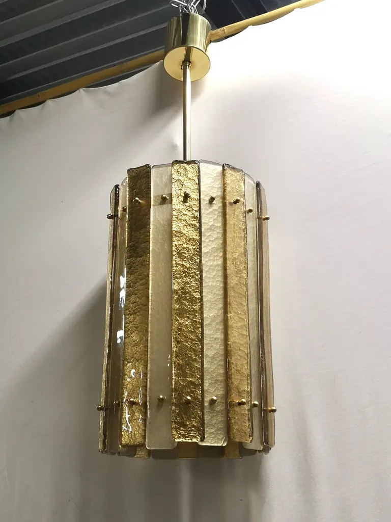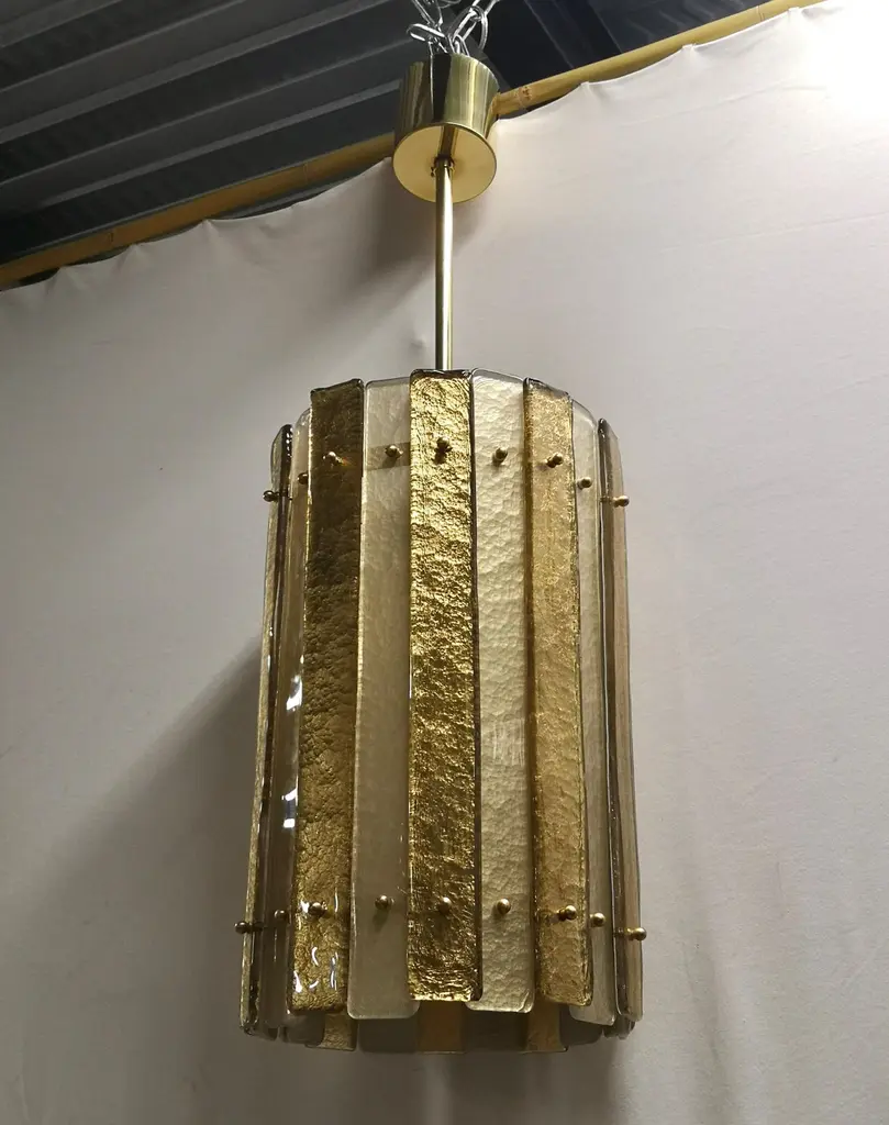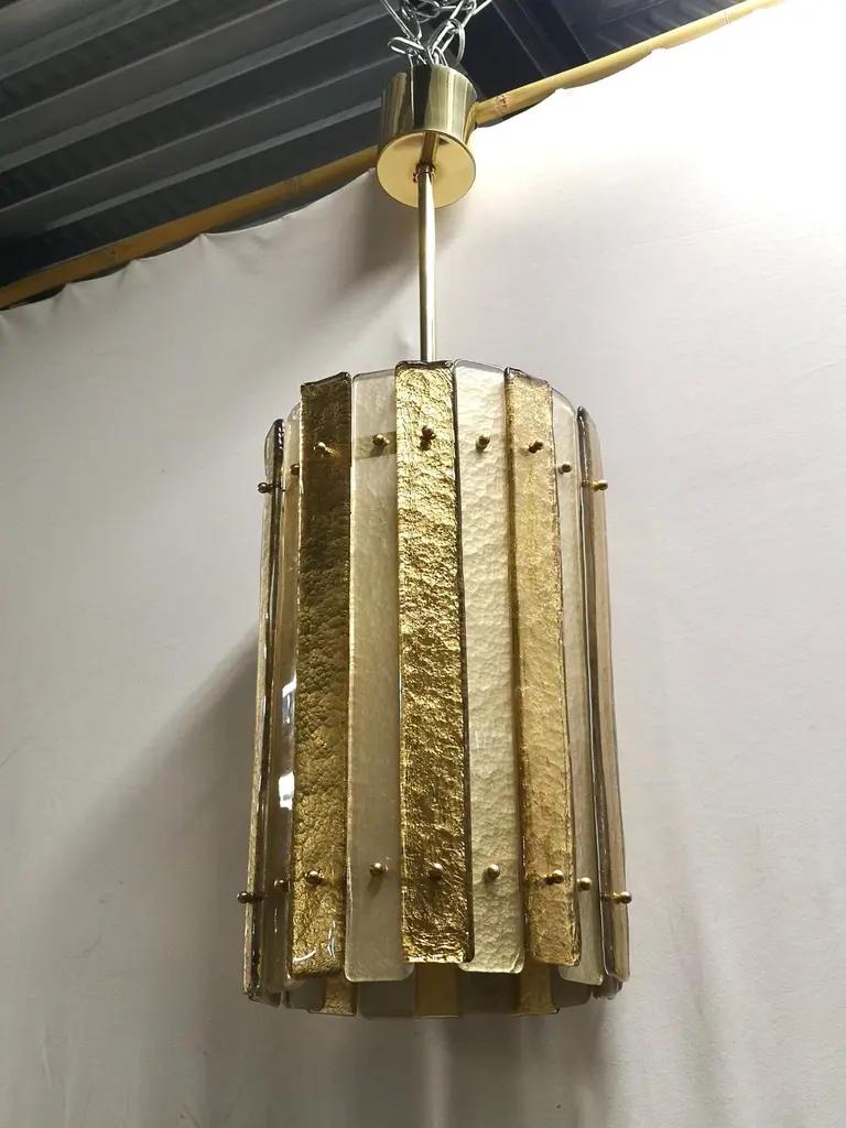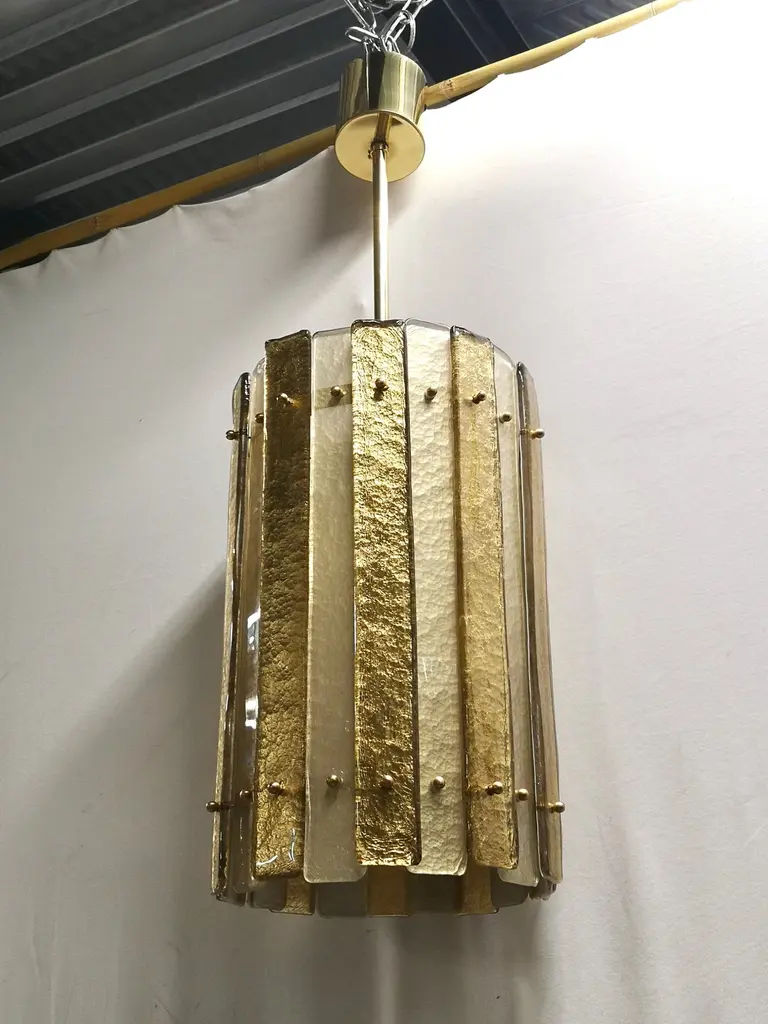 Special and very original lantern in Murano glass and brass, unique design enriched by a particular glass with a very original band workmanship.The chandelier/lantern has a cylindrical brass structure to which long bands of Murano glass in different shades of gold have been attached. There are about twenty bands hanging all around the structure, positioned alternately one above the other. The structure is that of an elongated cylinder. The bands are perforated and allow the brass screws to attach to the metal structure. The lantern is hung from the ceiling by means of a rod and a brass rosette. In the lower part there is a small Murano glass disk that is fixed to the structure to close the chandelier. Inside there are 4 light bulbs.Wear consistent with age and use. Each item offered by the HannauRoma warehouse is checked by our team of craftsmen. We guarantee a very high quality standard, ask our design specialists for detailed information.