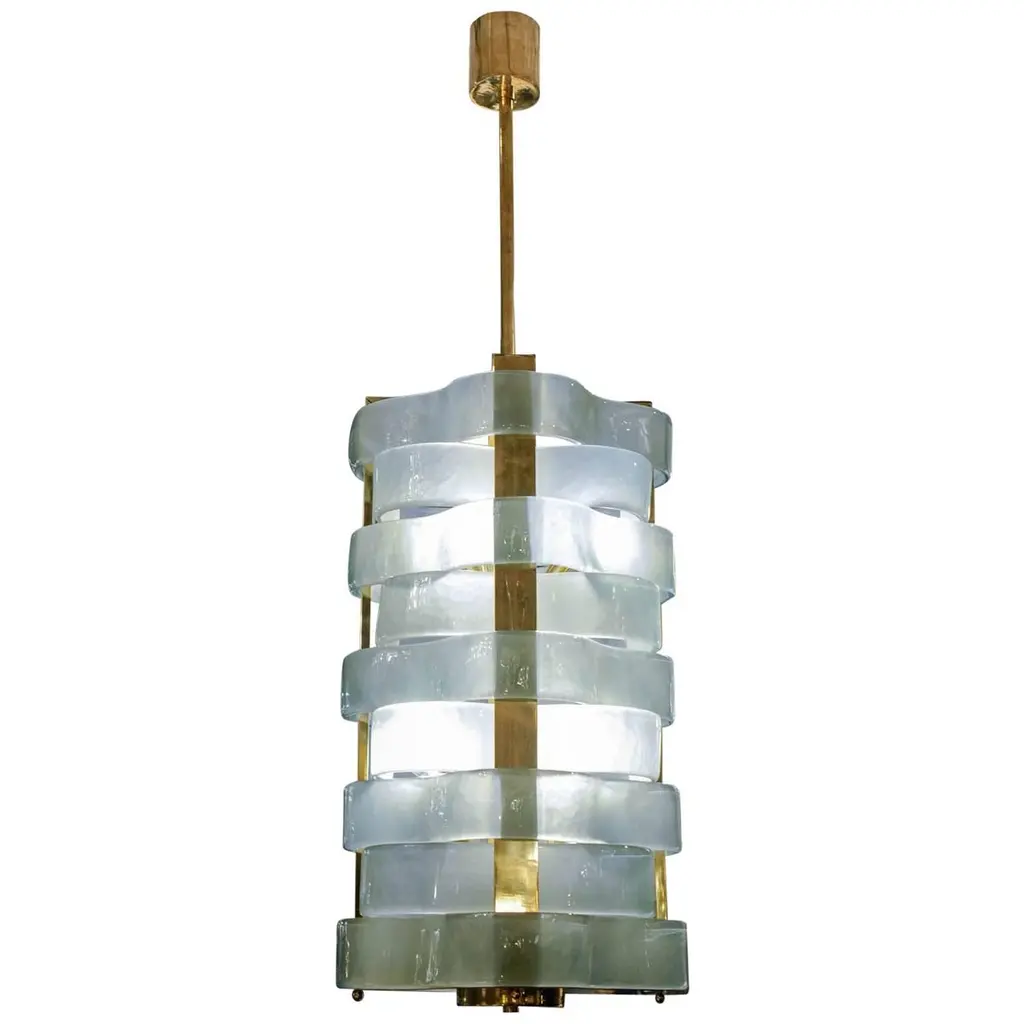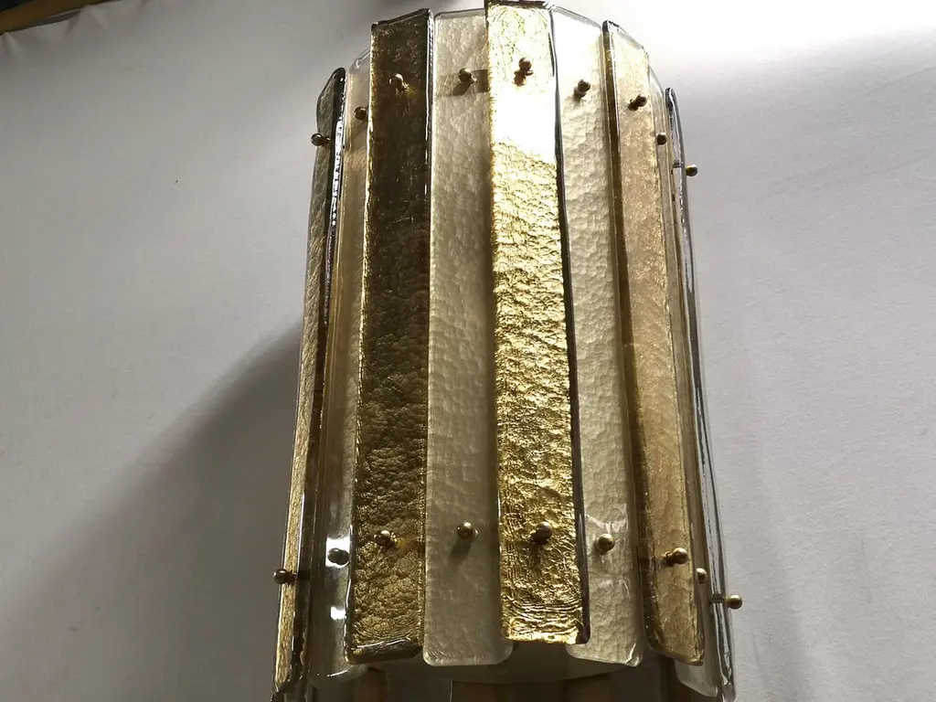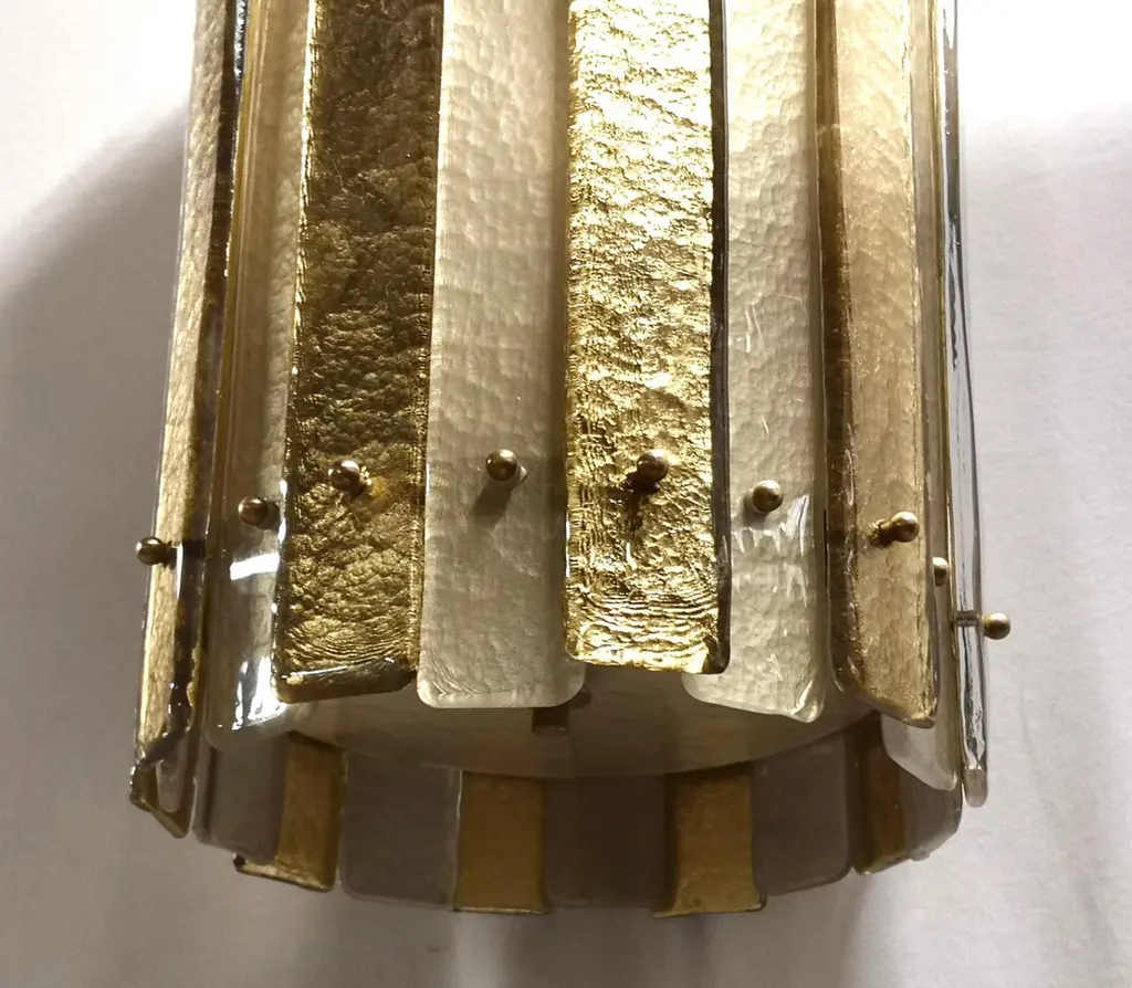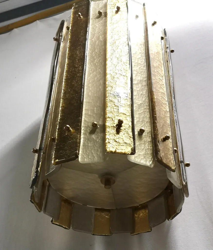Special and very original lantern in Murano glass and brass, unique design enriched by a particular glass with a very original band workmanship.The chandelier/lantern has a cylindrical brass structure to which long bands of Murano glass in different shades of gold have been attached. There are about twenty bands hanging all around the structure, positioned alternately one above the other. The structure is that of an elongated cylinder. The bands are perforated and allow the brass screws to attach to the metal structure. The lantern is hung from the ceiling by means of a rod and a brass rosette. In the lower part there is a small Murano glass disk that is fixed to the structure to close the chandelier. Inside there are 4 light bulbs.Wear consistent with age and use. Each item offered by the HannauRoma warehouse is checked by our team of craftsmen. We guarantee a very high quality standard, ask our design specialists for detailed information.