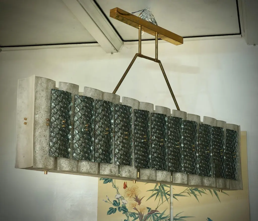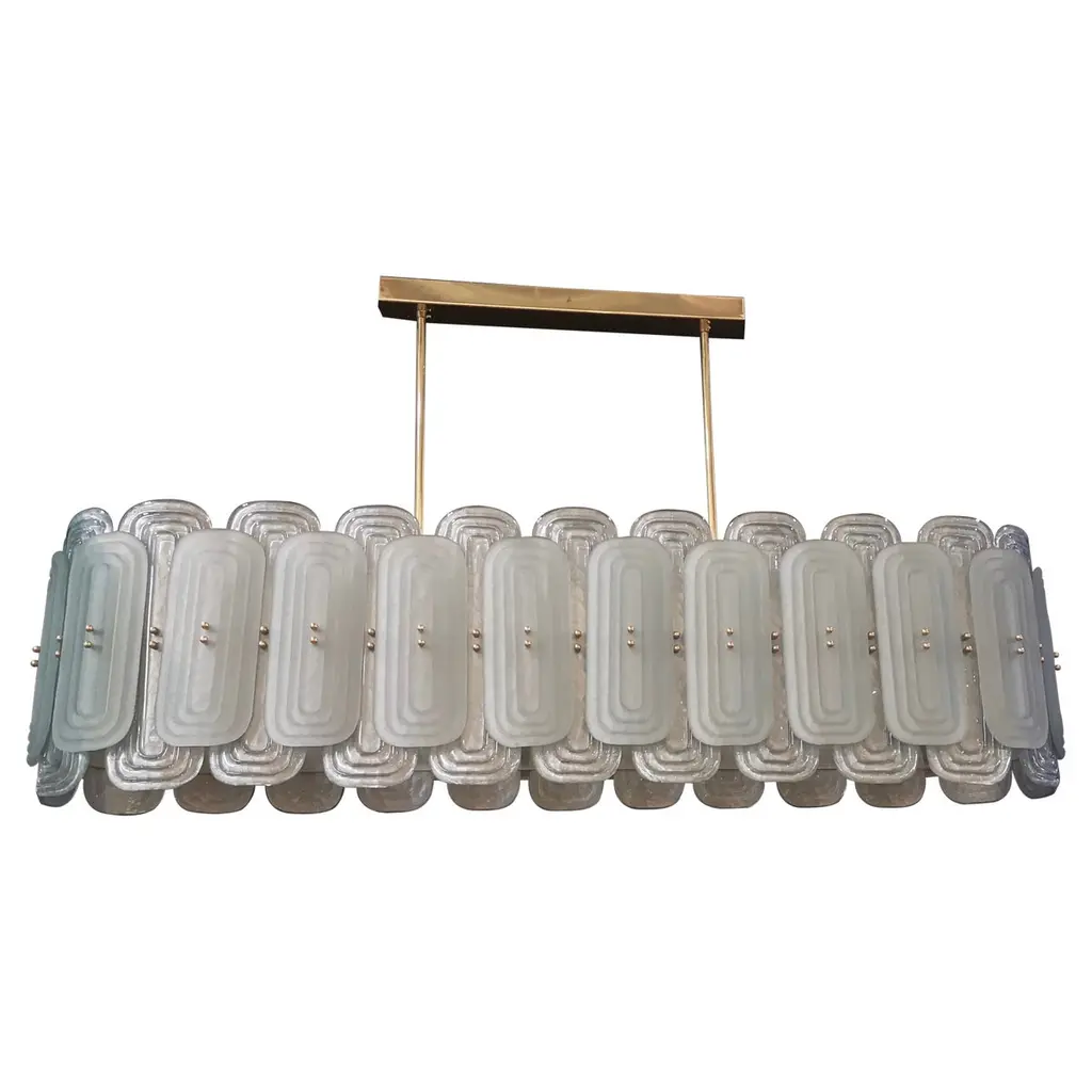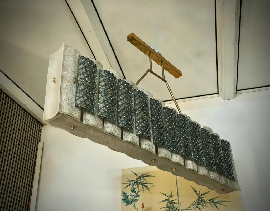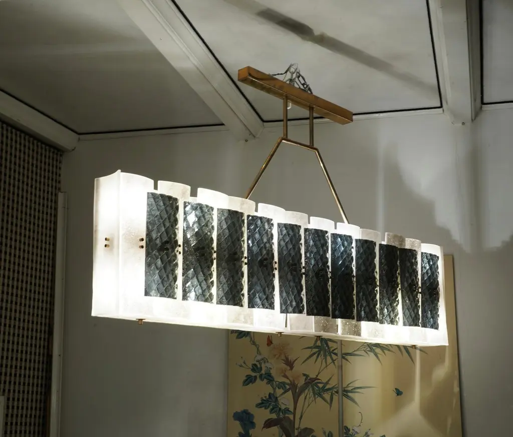 Murano chandelier with an elongated design with a brass structure and unique glass color. The Murano furnaces create an indisputable timeless design, simple but elegant at the same time.All in Murano glass with a brass structure. The glasses are treated with a particular color that makes them antiqued. As you can see from the photos, its color is dark green for the glasses below, while the glasses above are of off-white color. Twelve are the interior lights, six above and six below. Each Murano glass plate is fixed to the structure with two brass screws. The two glass plates have a different curvature, one is concave while the other is convex.Wear consistent with age and use. Each item offered by the HannauRoma warehouse is checked by our team of craftsmen. We guarantee a very high quality standard, ask our design specialists for detailed information.