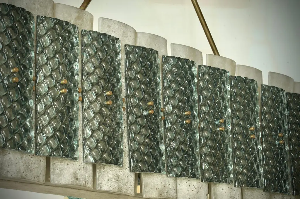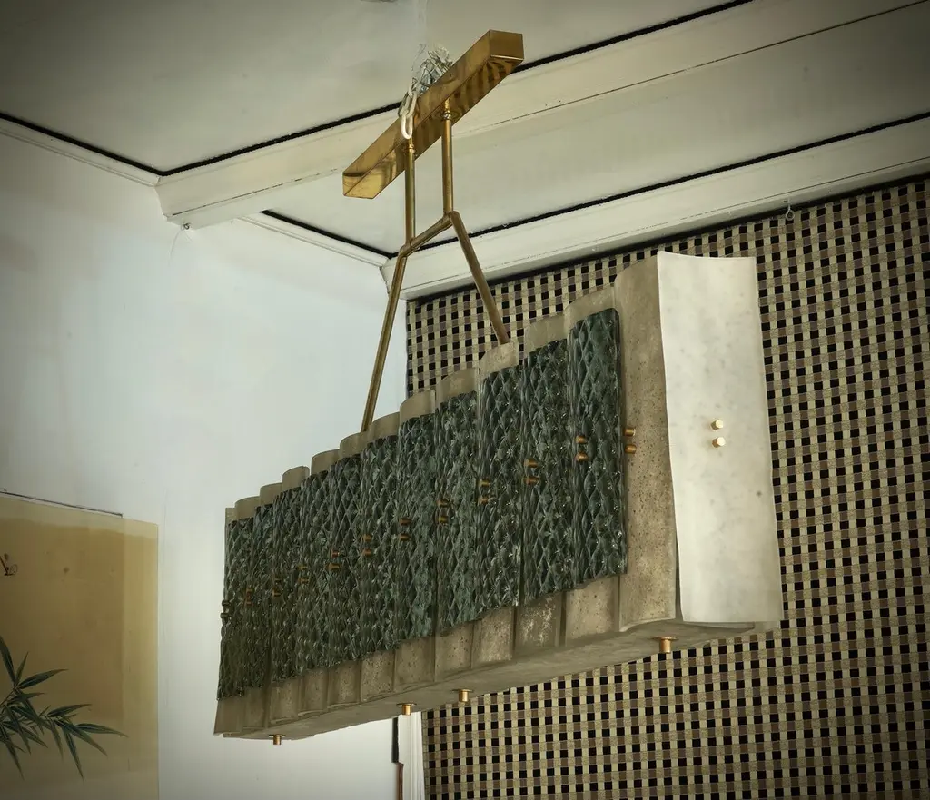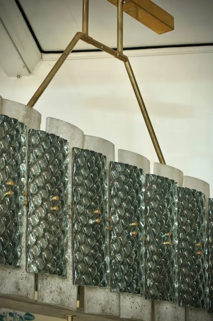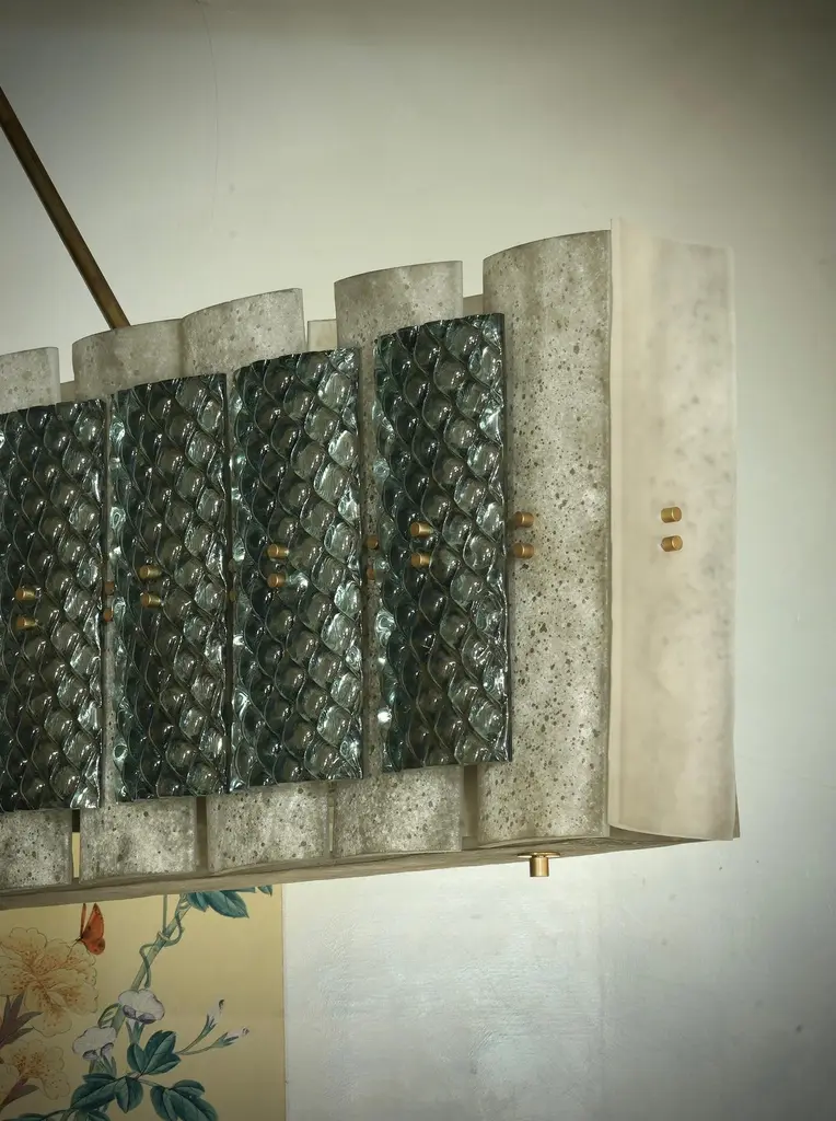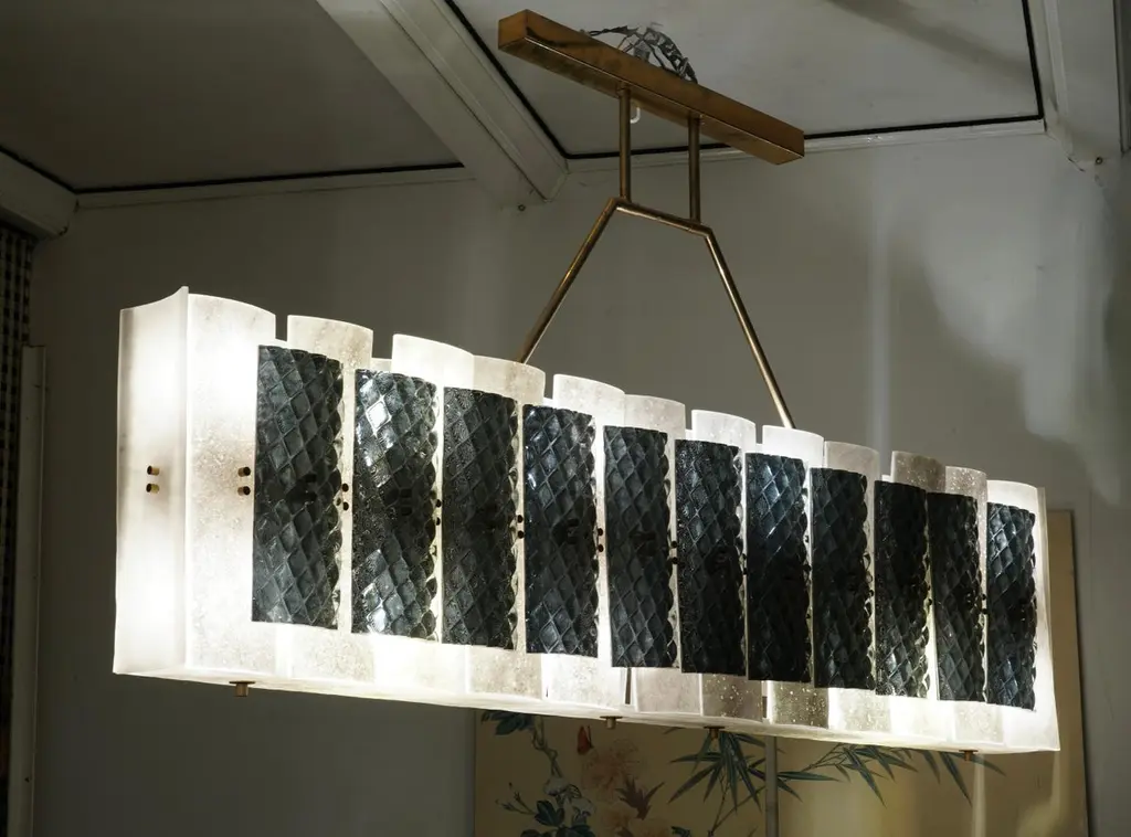 Murano chandelier with an elongated design with a brass structure and unique glass color. The Murano furnaces create an indisputable timeless design, simple but elegant at the same time.All in Murano glass with a brass structure. The glasses are treated with a particular color that makes them antiqued. As you can see from the photos, its color is dark green for the glasses below, while the glasses above are of off-white color. Twelve are the interior lights, six above and six below. Each Murano glass plate is fixed to the structure with two brass screws. The two glass plates have a different curvature, one is concave while the other is convex.Wear consistent with age and use. Each item offered by the HannauRoma warehouse is checked by our team of craftsmen. We guarantee a very high quality standard, ask our design specialists for detailed information.