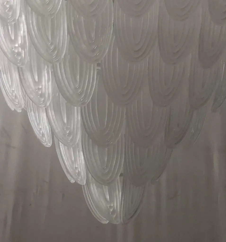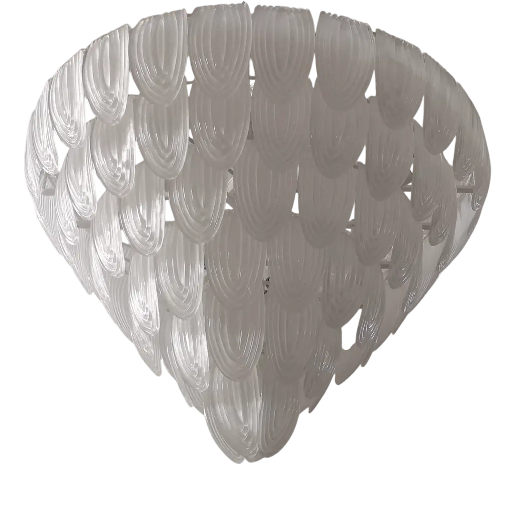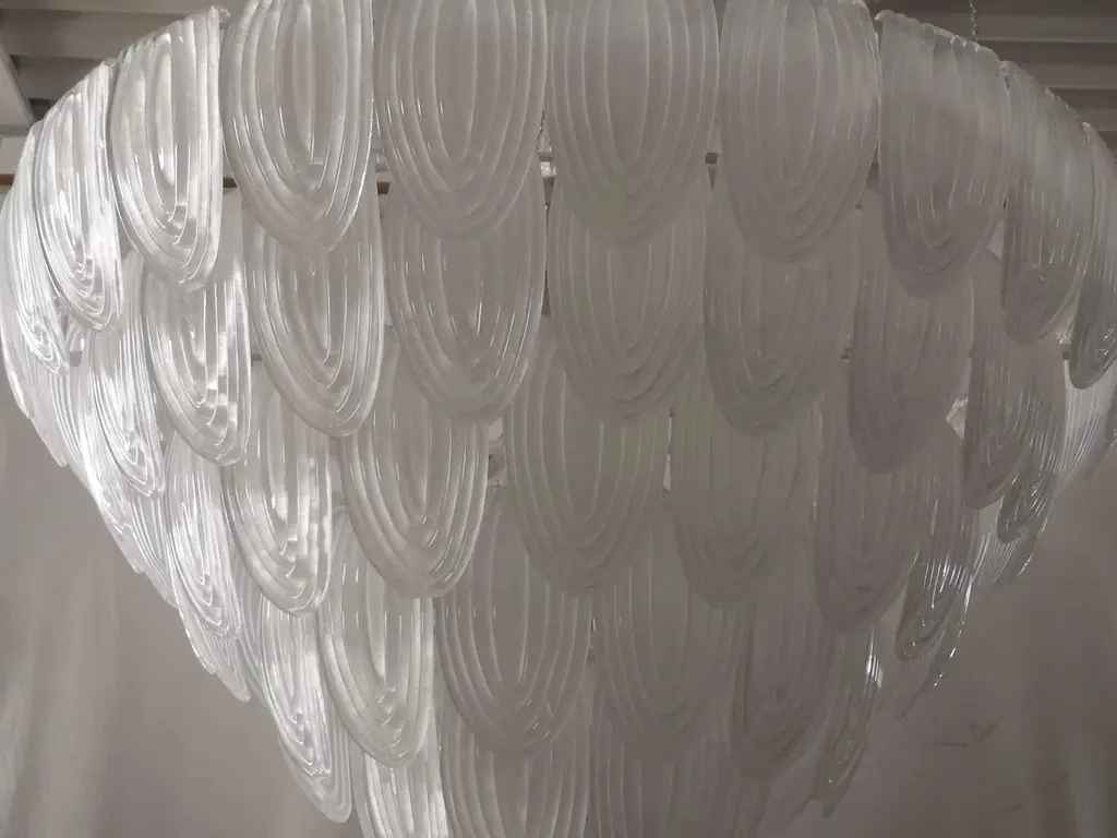 Fantastic transparent Venetian color for a cascade of Murano leaves. A surprising color for this chandelier.All in artistic Murano glass with transparent white leaves arranged all around. Its construction is made of curved leaves hanging around a white iron structure. Its transparent color is really successful for a chandelier different and original from the others. A beautiful splash of color above your ceiling will drive anyone who enters your home crazy. Note the particularity of the workmanship of the leaf; a curved leaf with a particular ribbed glass. Refinement and style as is in the Murano style, unique pieces that always remain precious. When turned on, the chandelier is very bright having twelve bulbs inside, it will perfectly illuminate your home.Wear consistent with age and use. Every item the warehouse HannauRoma offers is checked by our team of craftsmen. We guarantee a very high-quality standard, ask our design specialists for detailed information.