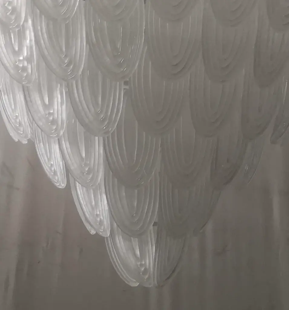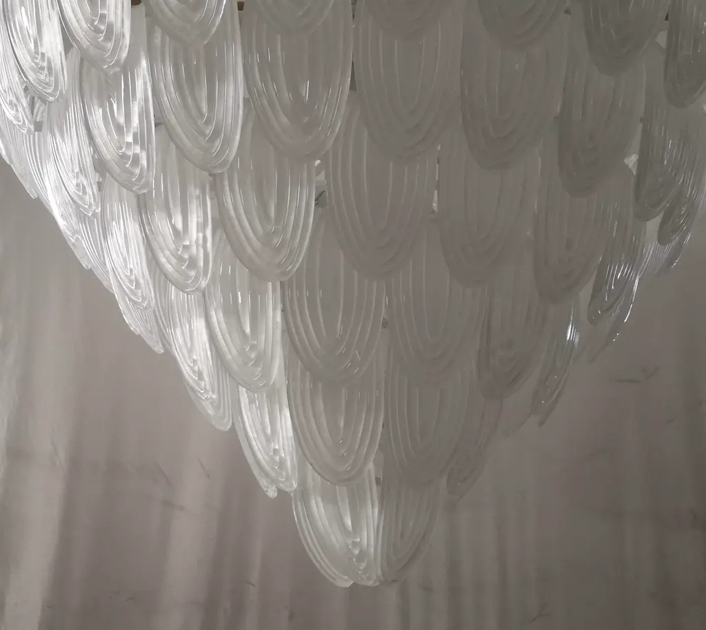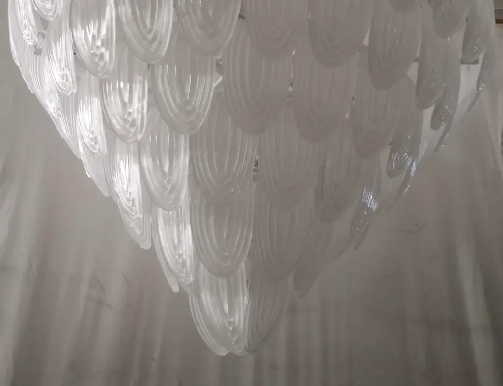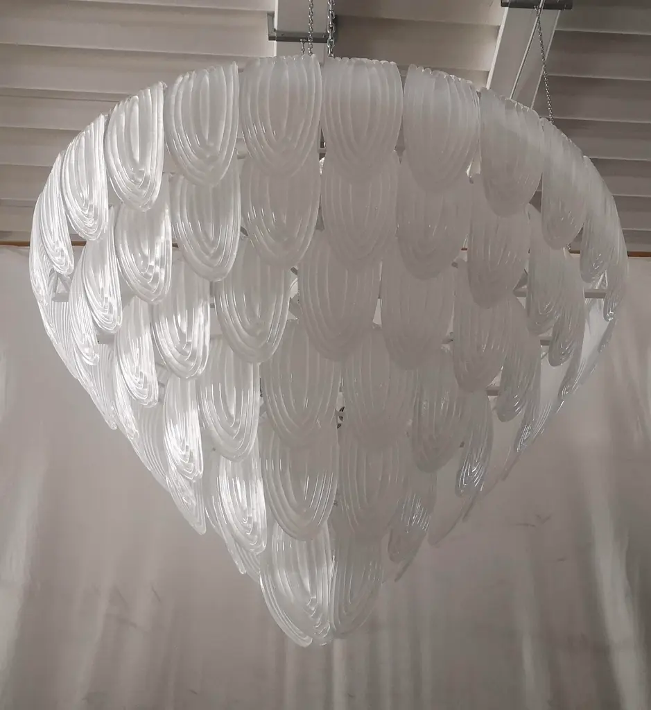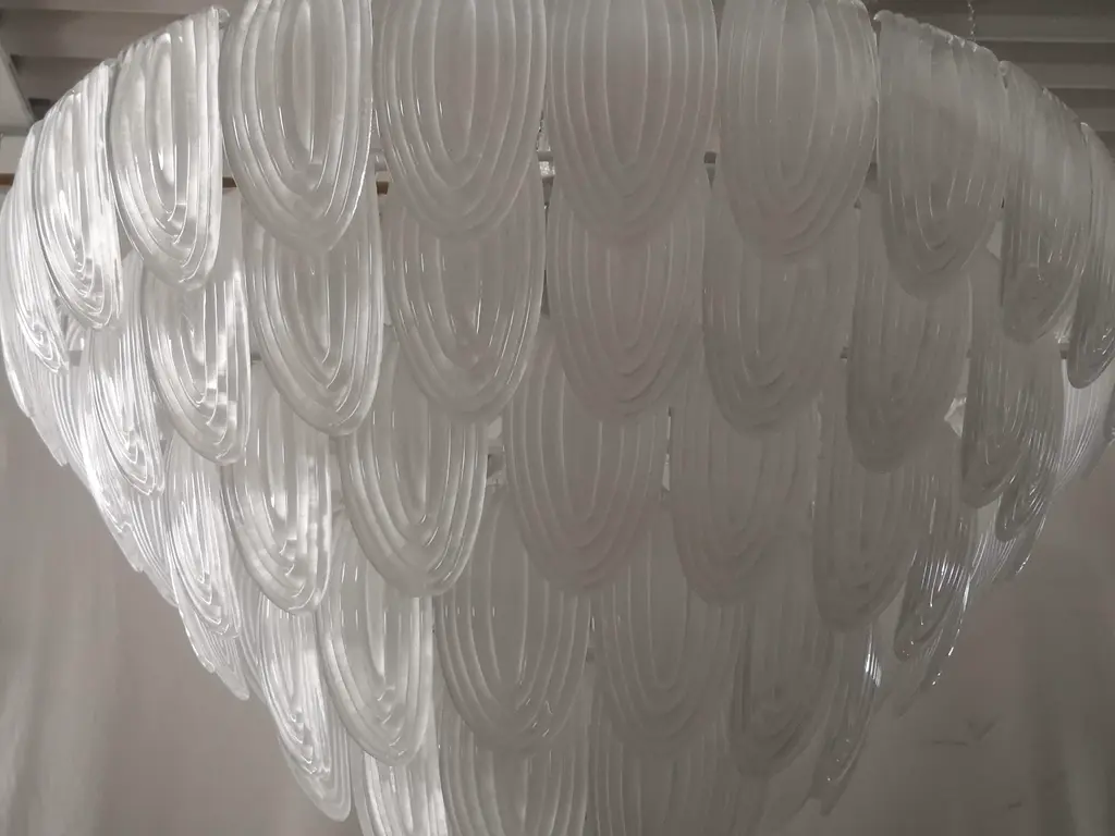 Fantastic transparent Venetian color for a cascade of Murano leaves. A surprising color for this chandelier. All in artistic Murano glass with transparent white leaves arranged all around. Its construction is made of curved leaves hanging around a white iron structure. Its transparent color is really successful for a chandelier different and original from the others. A beautiful splash of color above your ceiling will drive anyone who enters your home crazy. Note the particularity of the workmanship of the leaf; a curved leaf with a particular ribbed glass. Refinement and style as is in the Murano style, unique pieces that always remain precious. When turned on, the chandelier is very bright having twelve bulbs inside, it will perfectly illuminate your home. Wear consistent with age and use. European Plug (up to 250V).The wiring of this item may be original and might need replacement, if not specified otherwise.