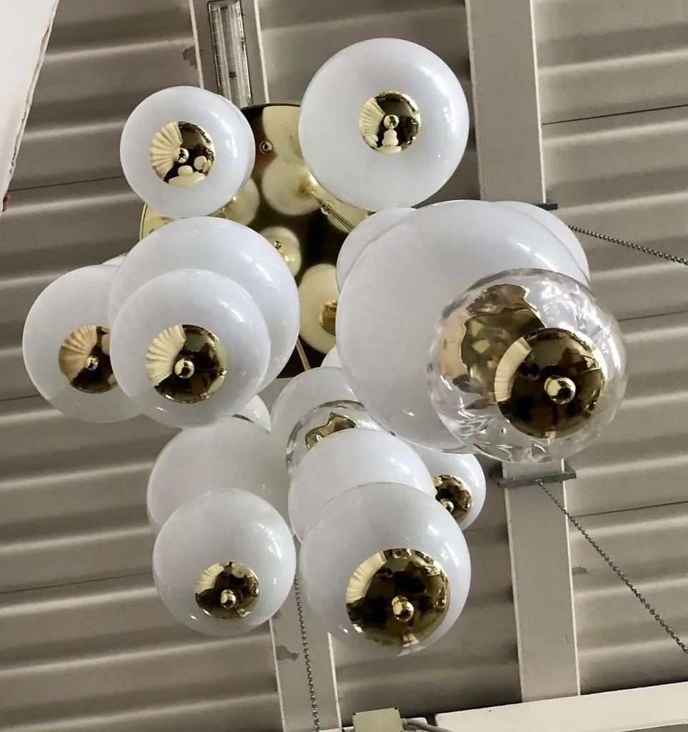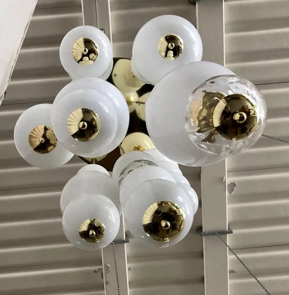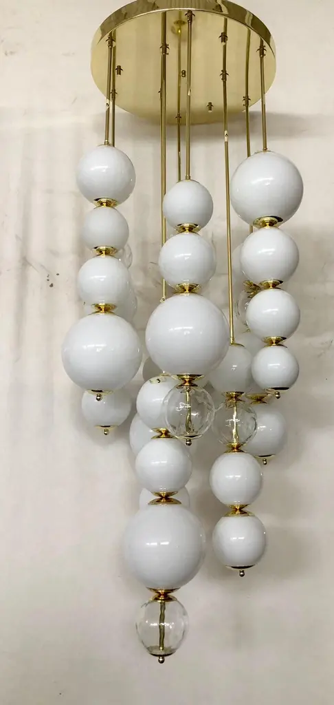 Elegant Murano artistic glass chandelier with sinuous shapes, very essential and linear in shape but truly beautiful. Elegance also for the beautiful workmanship of the elongated glass shells. Refinement and class as in the Murano style, unique pieces that always remain precious.The chandelier has a structure made of a large oval brass plate and brass tubes. From each of the nine brass rods hang series of alternating Murano glass spheres of various sizes, white and transparent in color. The lighting is truly "STELLAR". A chandelier that turns on when the house is completely dark will give a sort of starry sky to your apartment. Note that the brass arms are not all the same length but alternate with different lengths.Wear consistent with age and use. Each item offered by the HannauRoma warehouse is checked by our team of craftsmen. We guarantee a very high quality standard, ask our design specialists for detailed information.