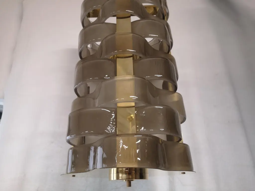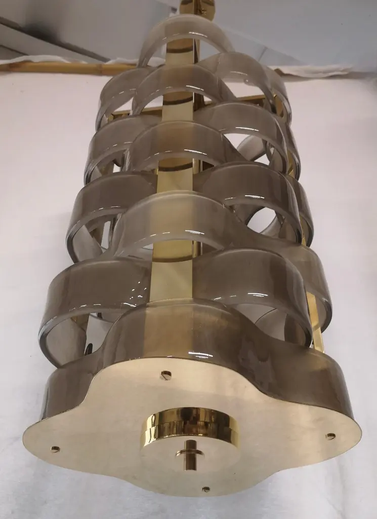 Design in woven Murano glass for this smoky colored chandelier, its style is elegant and linear.The chandelier is in Murano glass, dove gray or smoked color. The shape of its glasses is very particular, positioned alternately one above the other, it seems that they form a weave with the brass bands of the structure itself. The chandelier have nine of these Murano glasses, one above the other, interspersed with bands of brass. Under the cover, the chandelier has a brass disc of the same shape as the glasses. Internally there are four light bulbs with a large socket. Refinement and class as is the style of Murano, one-of-a-kind pieces that always remain precious. When turned on, the chandelier is very bright.